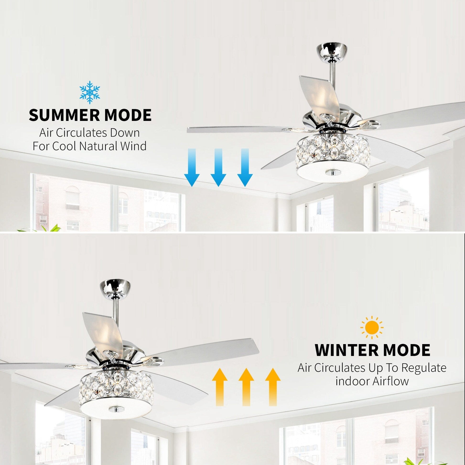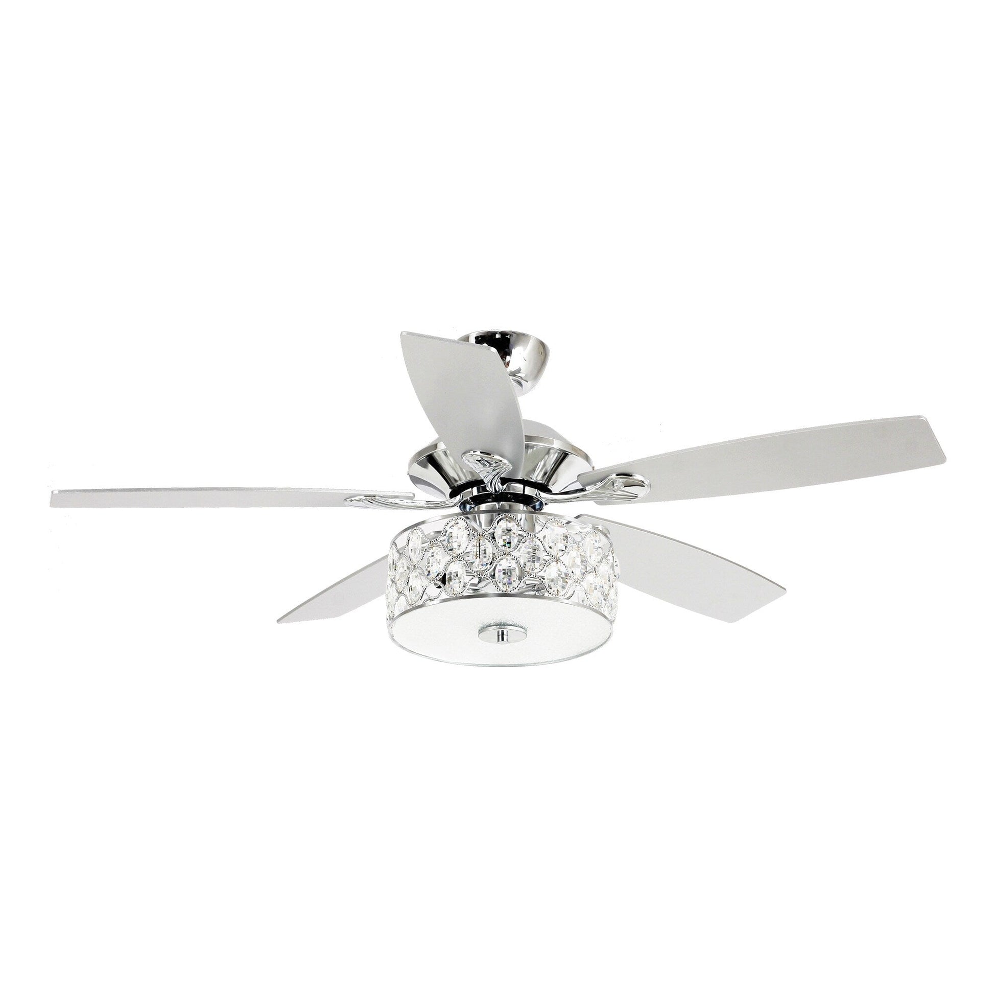 Bring a touch of modern sophistication to your living space with this 52' Modern 4-Light Chandelier Crystal Ceiling Fan with Remote. The chrome-finished metal frame and silver-stained wooden blades provide a sleek and updated look that is perfect for any room in your home. Enjoy the benefits of a reversible motor with three speeds that can be used in the winter to save energy. A handheld remote makes it easy to turn the light on and off and adjust the fan speed to your liking.
