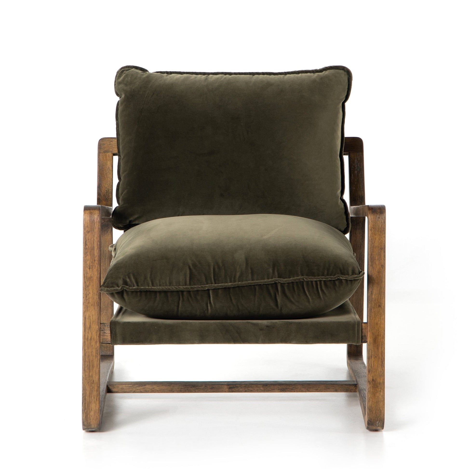 An ideal spot for relaxing with a favorite book, this chair features a hand-carved parawood frame that cradles deep, low seating upholstered in soft fabric or rich leather.