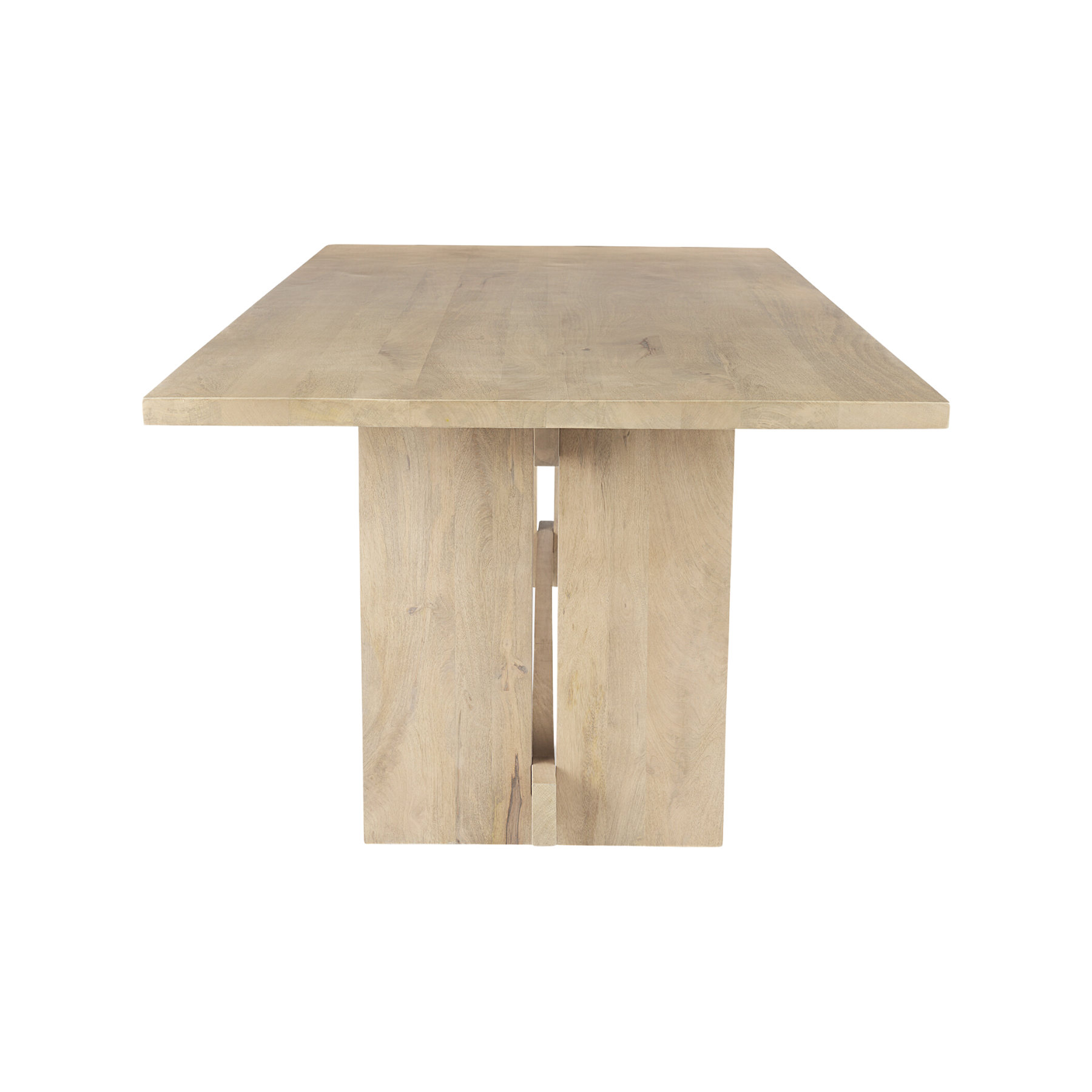 Industrial and sturdy in design, the Aidia is a simple dining table. Featuring a smooth top crafted from durable Indian mango wood, the Aidia is a reliable and trusty addition to your dining room. The wide planked top is supported by four solid wood, plank like legs with one long beam running through the bottom for extra support. The cool-toned, light-brown finish mixed with smooth wood adds a light feeling to a room.