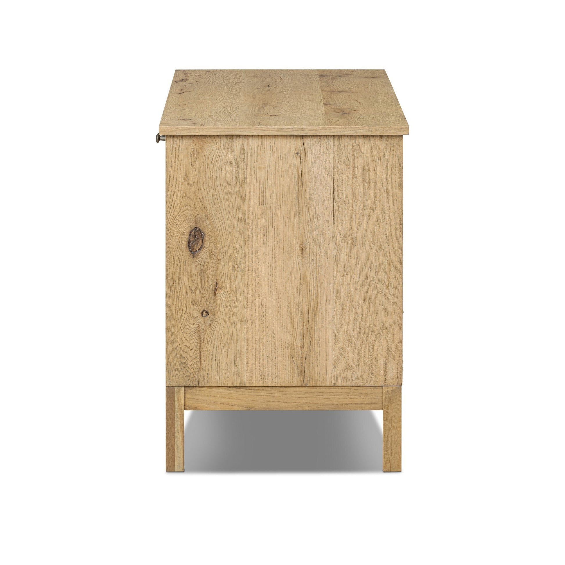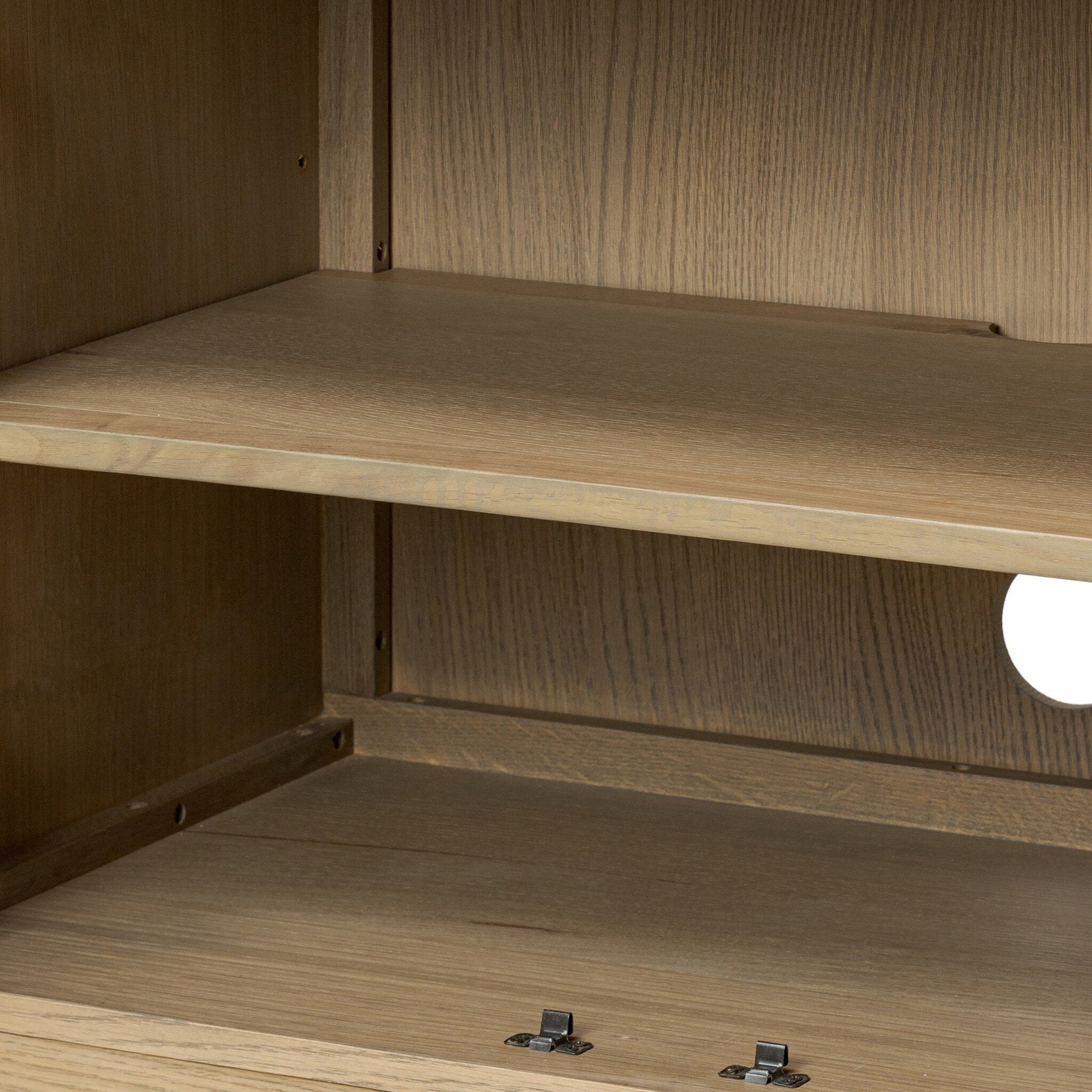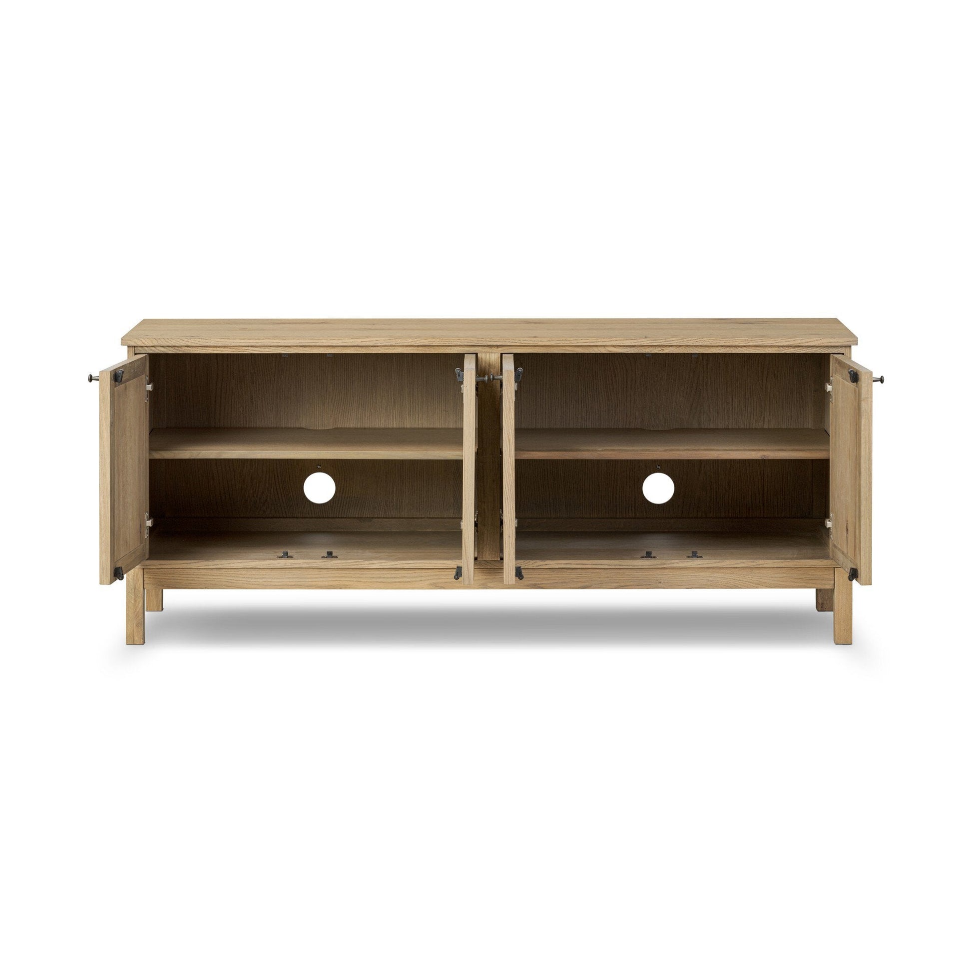 A transitional piece that works into your collection with ease. This solid oak media console features a light finish that highlights natural wood cracks and graining inherent to rich character woods. Grid-like patterned doors bring dimension to clean, simple shaping, while interior shelving awaits storage of media and more. Rear cutouts for cord management. Pieces vary; knots and cracks are common and reflect the beautifully natural character of oak.