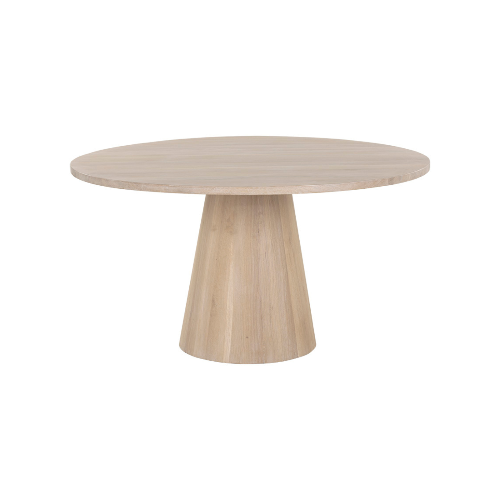 A simple and substantial round dining table is made from solid oak wood and a whitewash finish.