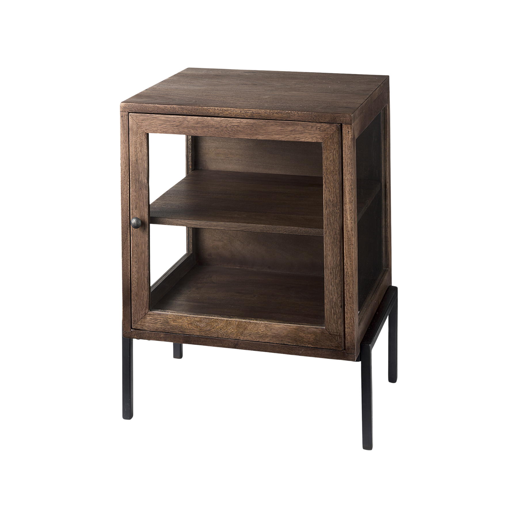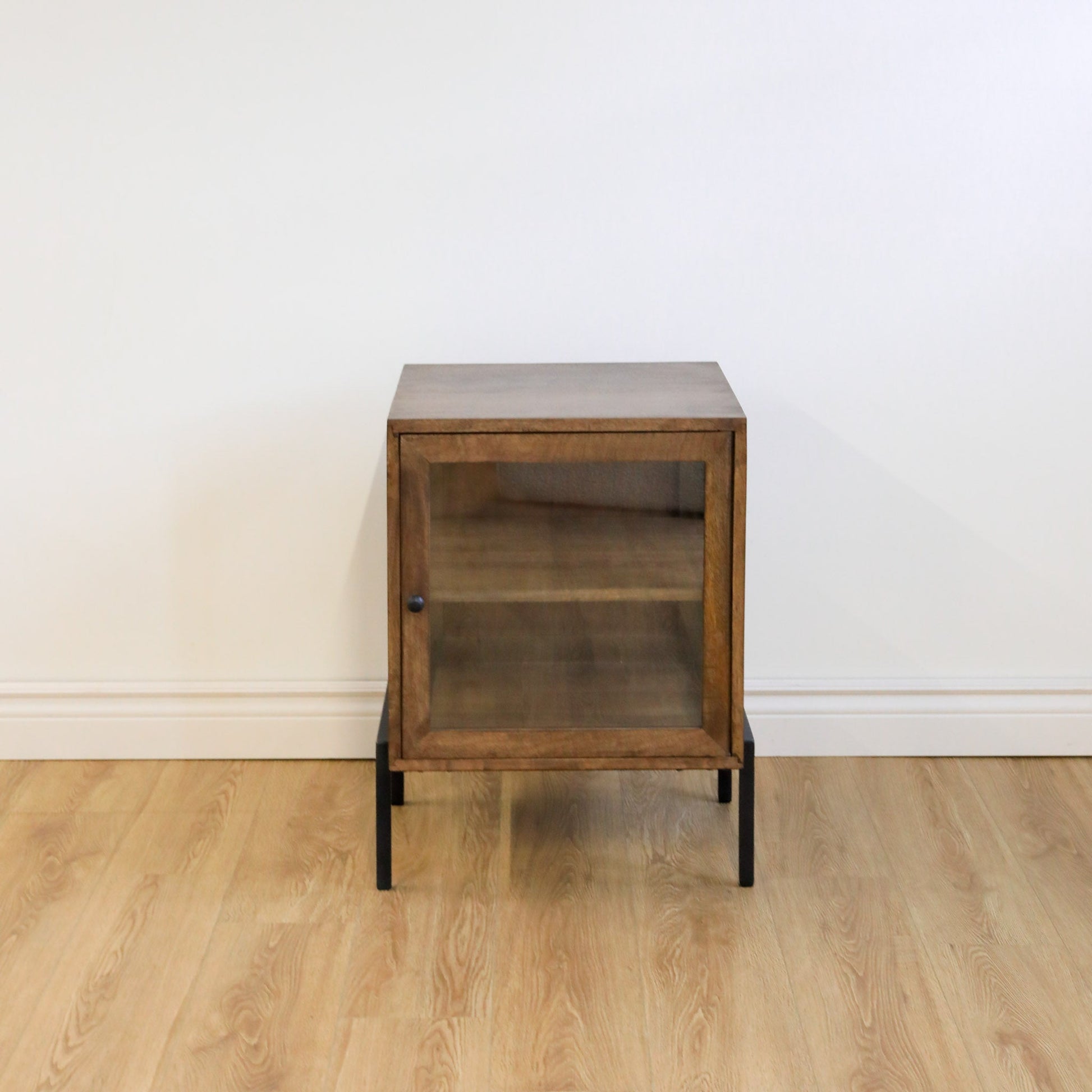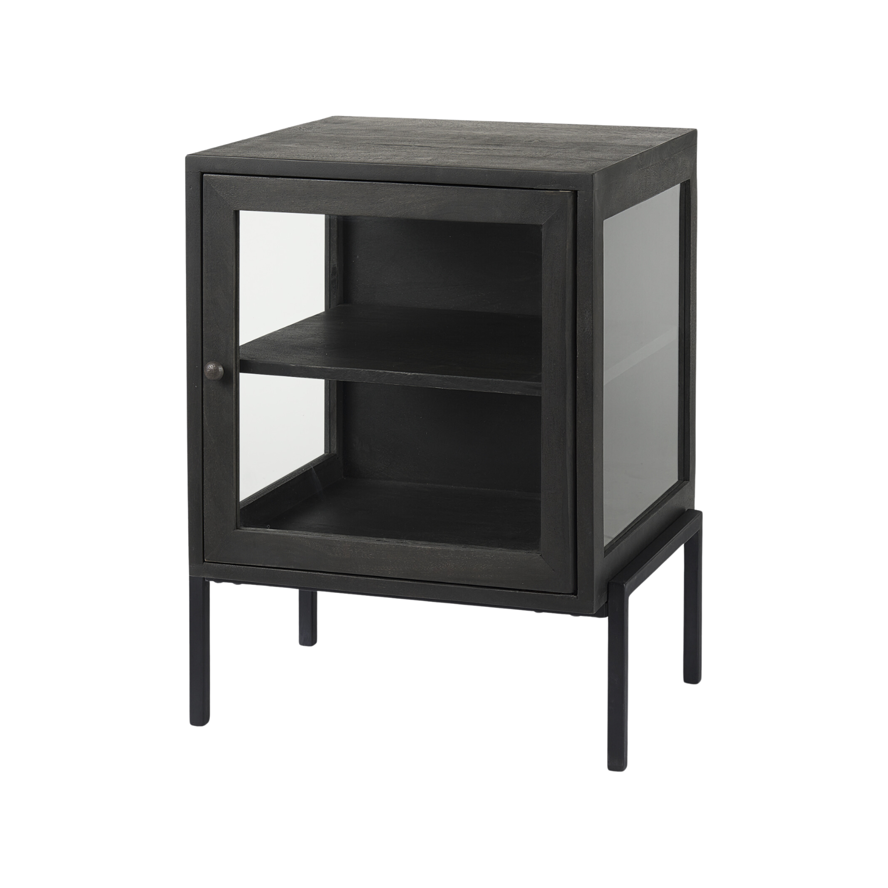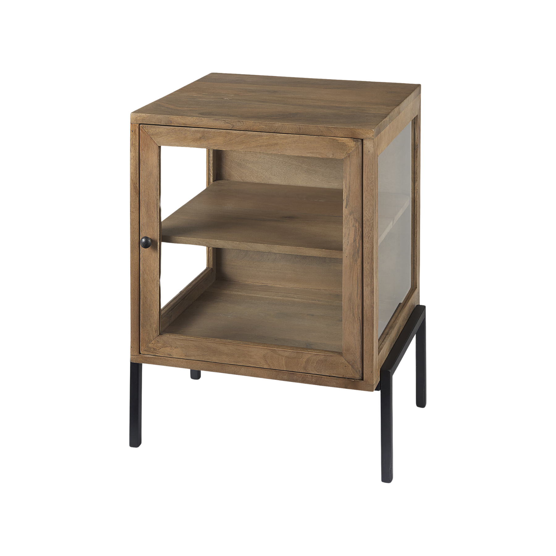 This modern side table features a shadowbox design with glass side panels and a glass door encased by a Mango wood frame on a sturdy iron base. Its clean, linear structure makes it easy to incorporate the Ariel into a number of design styles. It works especially well in modern interiors.