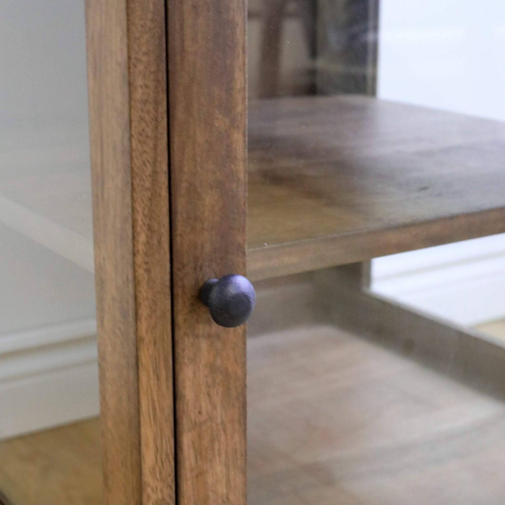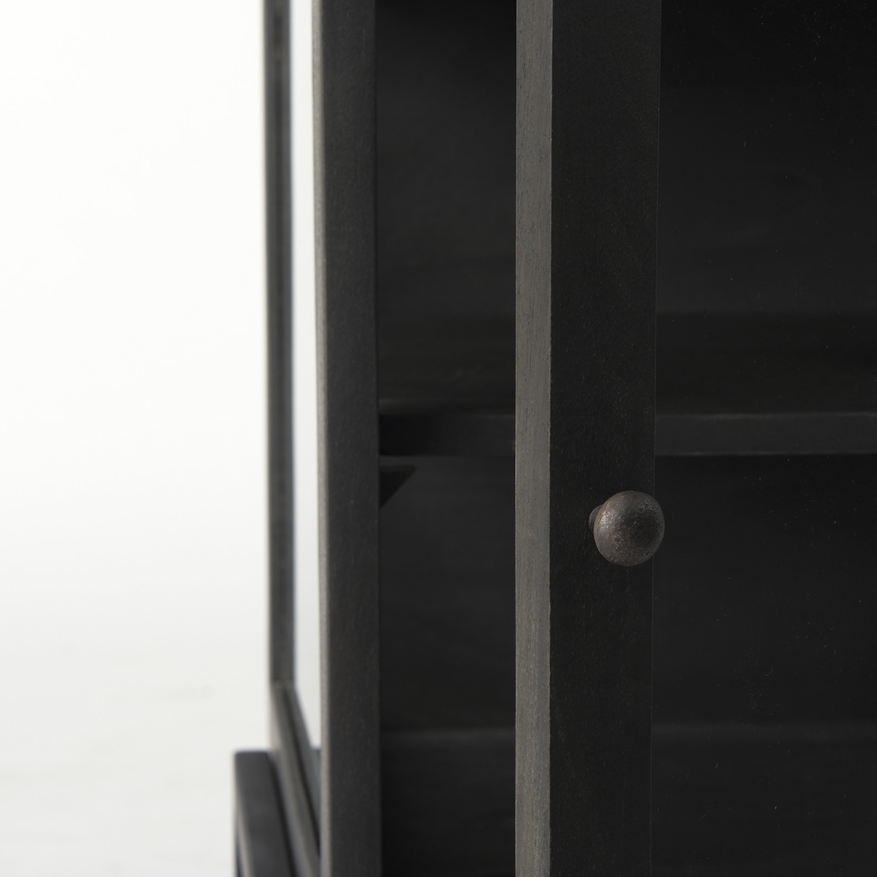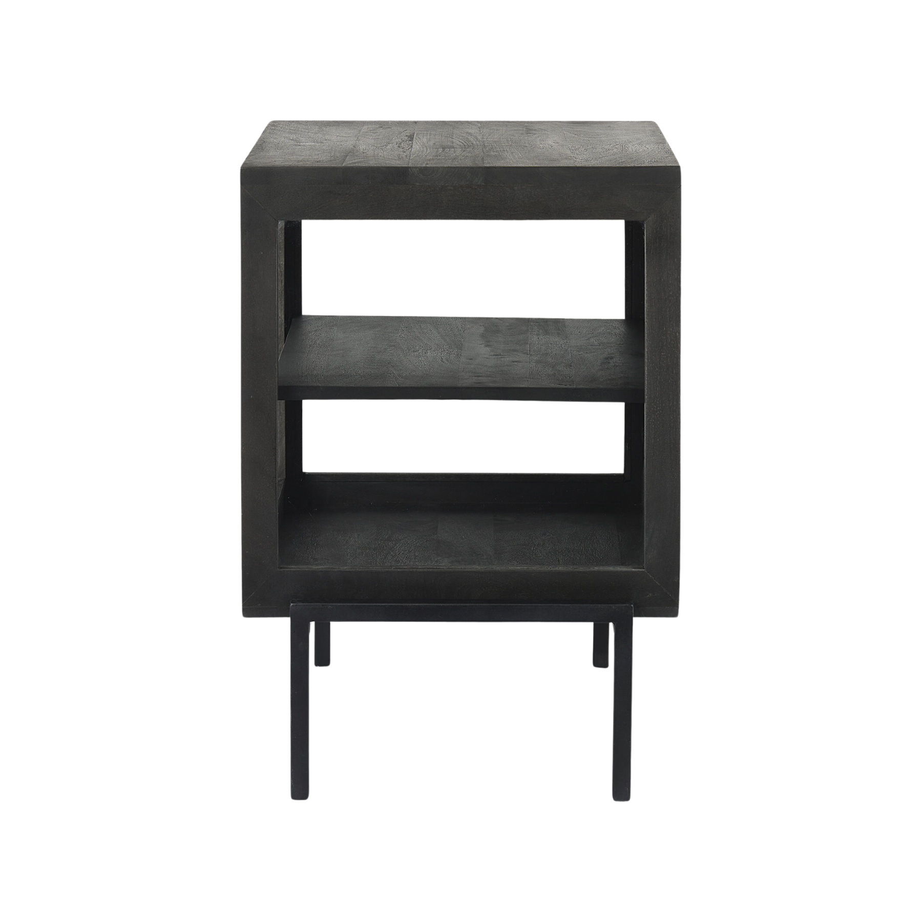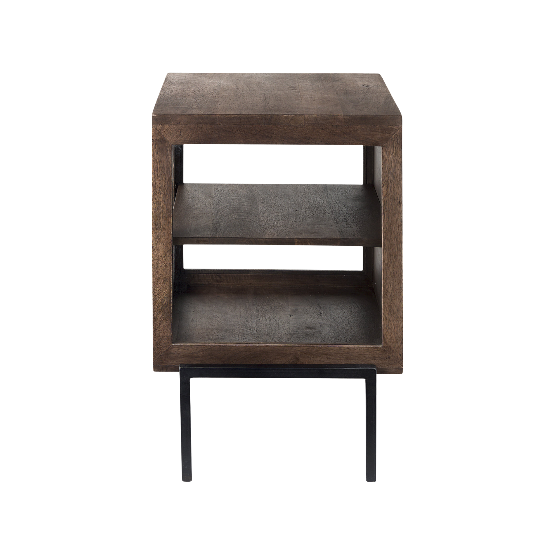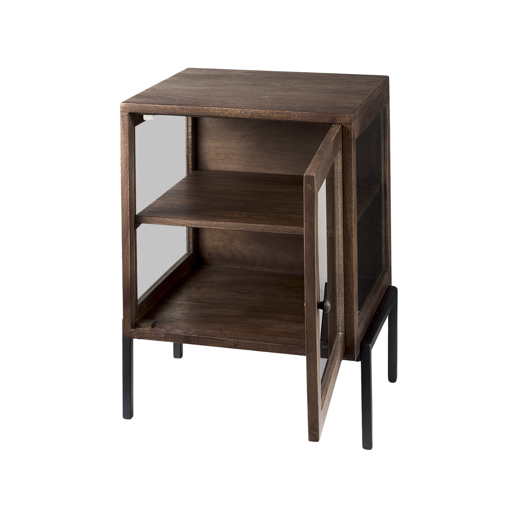 This modern side table features a shadowbox design with glass side panels and a glass door encased by a Mango wood frame on a sturdy iron base. Its clean, linear structure makes it easy to incorporate the Ariel into a number of design styles. It works especially well in modern interiors.