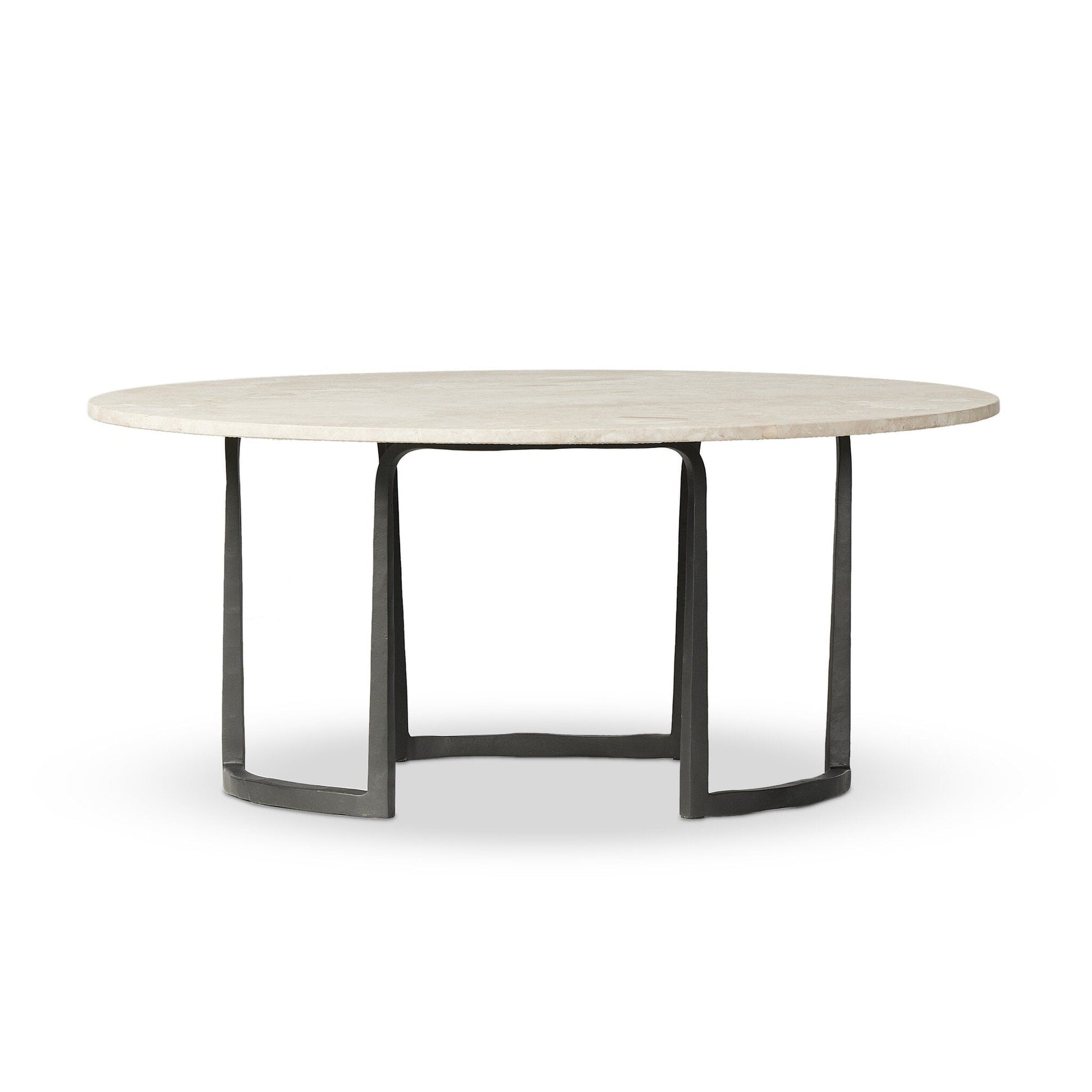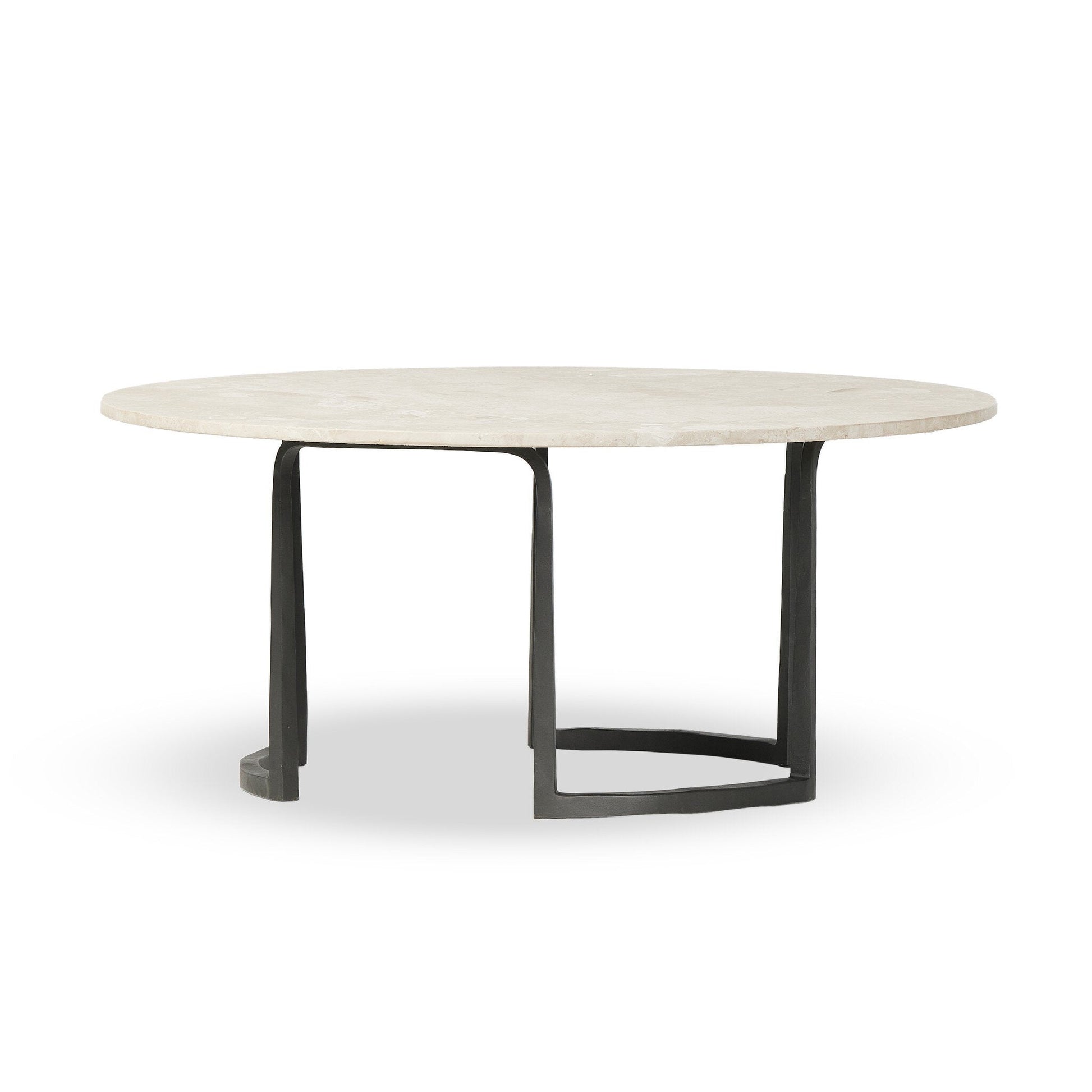 Hammered iron bends seamlessly in a continuous pattern to create the base of this large, mixed-material coffee table. Made from expressive marble, a rounded tabletop displays unique markings and natural patterns.