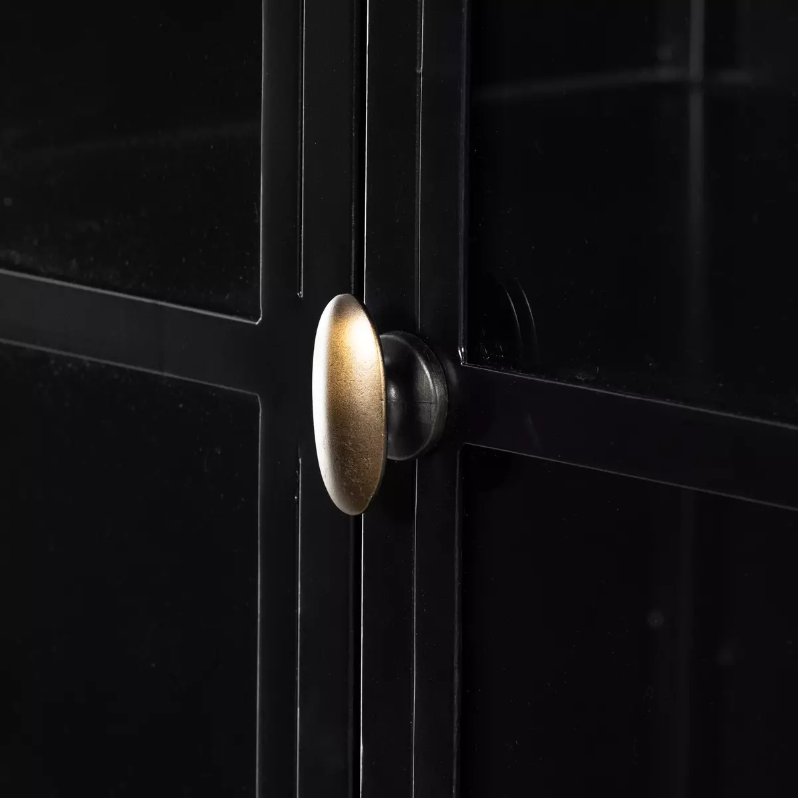 An ideal cabinet to display barware, books and other decor in beautifully arched cabinetry. The solid iron sheeting is finished in a modern gunmetal with clear glass fronts. The cabinet is the perfect statement piece, combining years of styles from mid-century modern to refined machine shop.