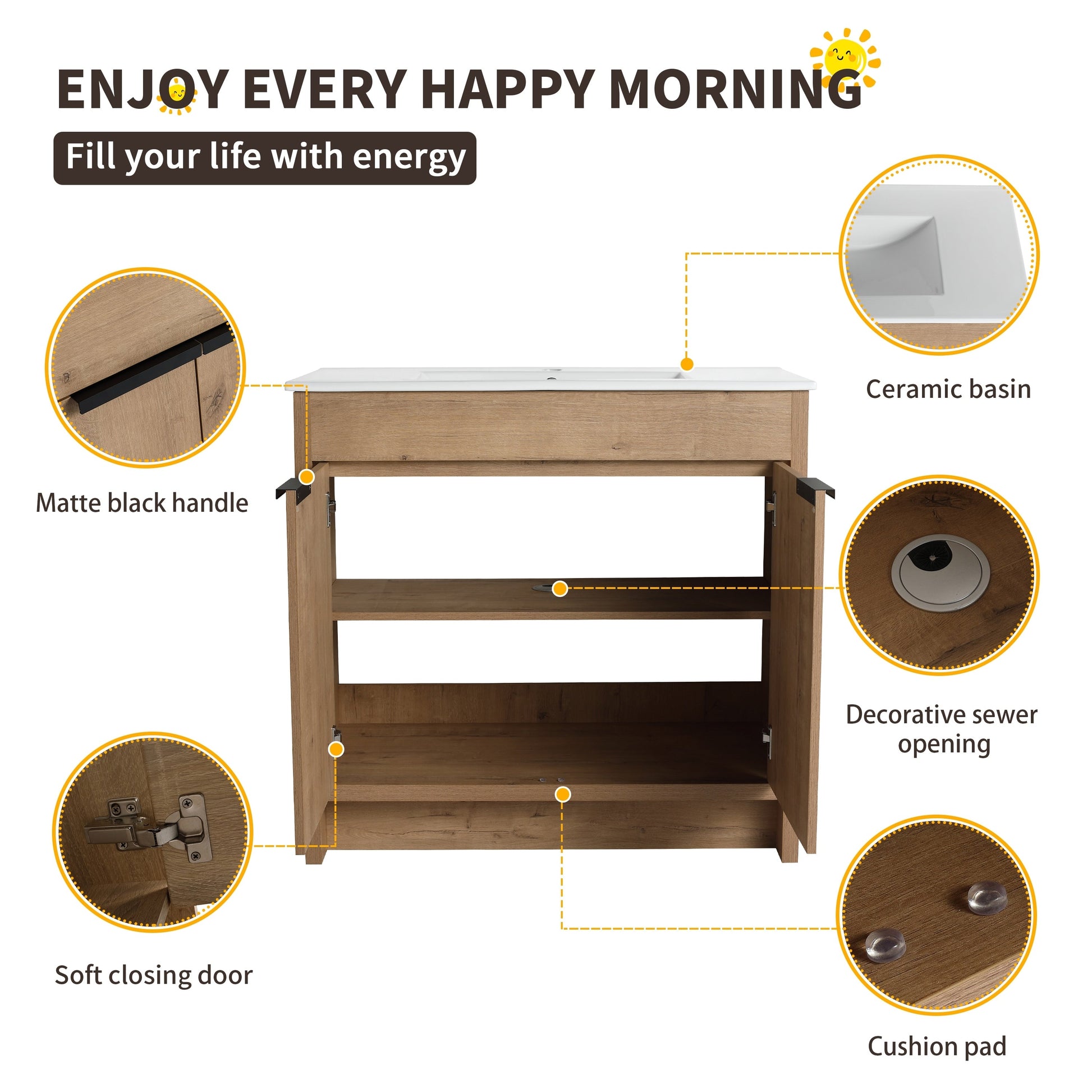 Add style and storage to your bathroom with the Beingnext Freestanding Bathroom Vanity with Sink. Made with durable high-quality wood, this vanity set resists moisture accumulation and temperature changes. The glass ceramic sink is smooth and waterproof, making cleanup a breeze. With an adjustable shelf and soft-closing door hinges, this vanity offers customizable storage and quiet operation.