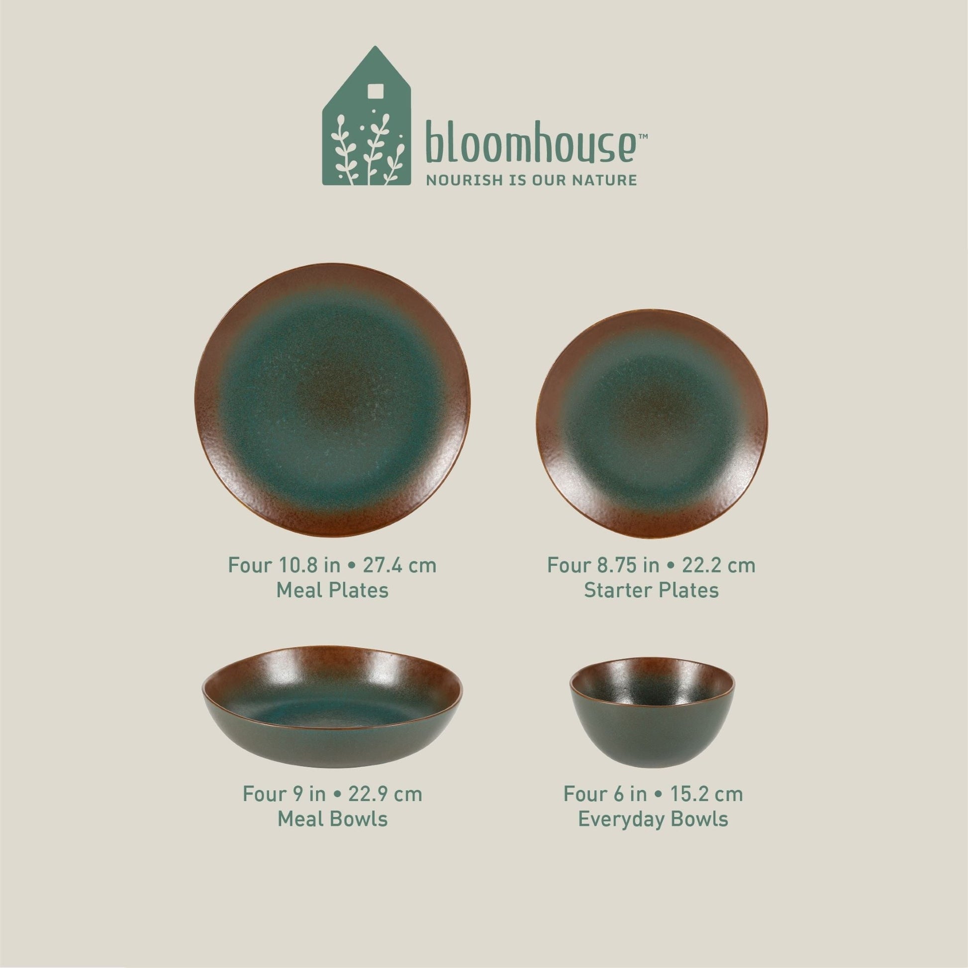 Let the Palermo Sun 16-piece Reactive Dinnerware Set from bloomhouse™ grace your kitchen or table with organic overtones and artisanal aesthetics every day. Made from carefully selected and sustainable clays, this stoneware dinnerware collection brings substantial style and heft to elevate dining and entertaining at home. Rustic shapes lend a handmade look and feel, like each plate and bowl came out of your favorite pottery studio. Peppered with intentional flecks from the reactive glaze finish, these pieces play well with other tabletop coordinates to set your most imaginative tablescapes. Rich in character and full of life, this set outfits any place setting for weeknight suppers and fancier fares. Dishwasher and microwave safe.