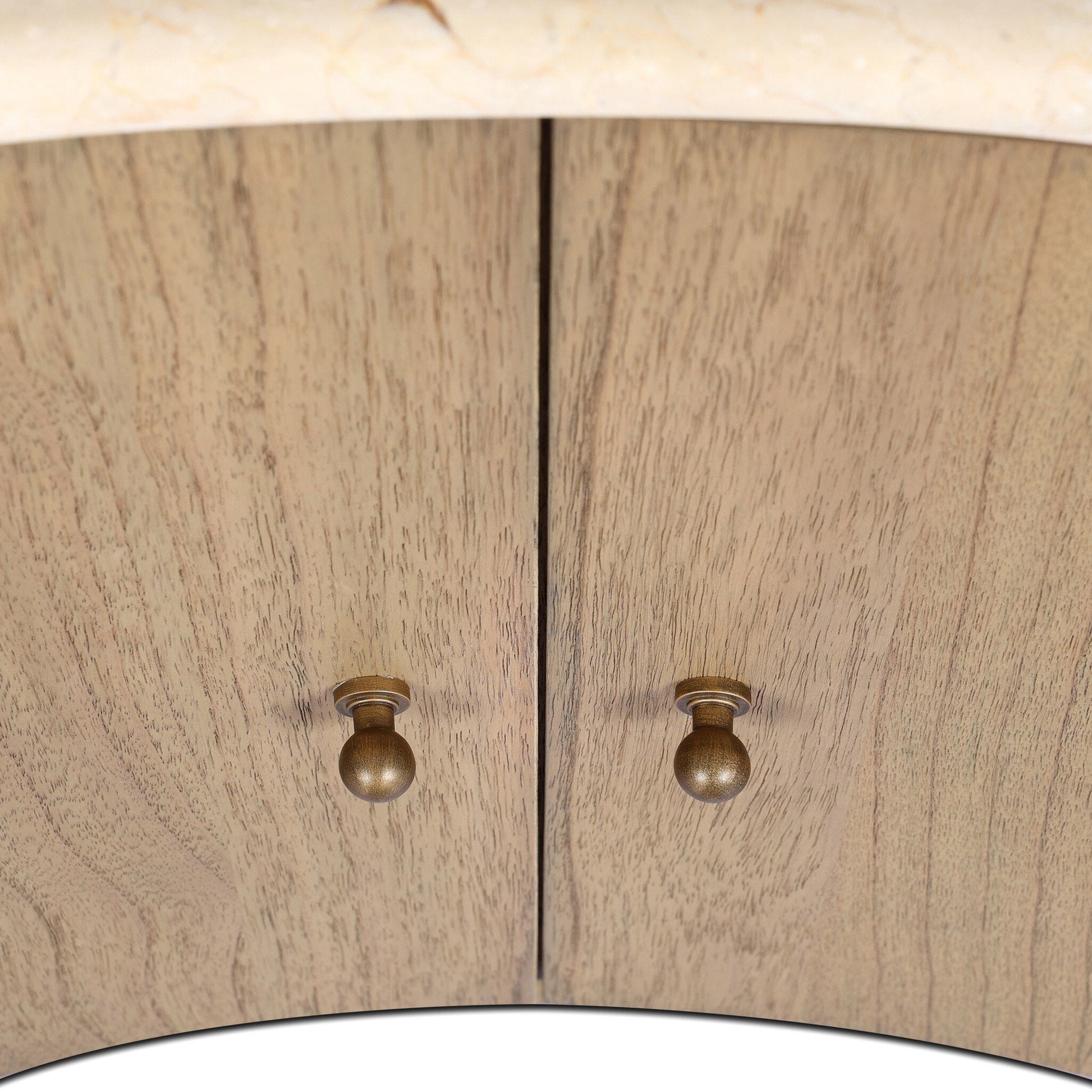 Fluid contours give shape to this solid mindi nightstand, topped with a creamy marbled top. Two doors with knobbed pulls open to inset shelves for organized bedside storage.