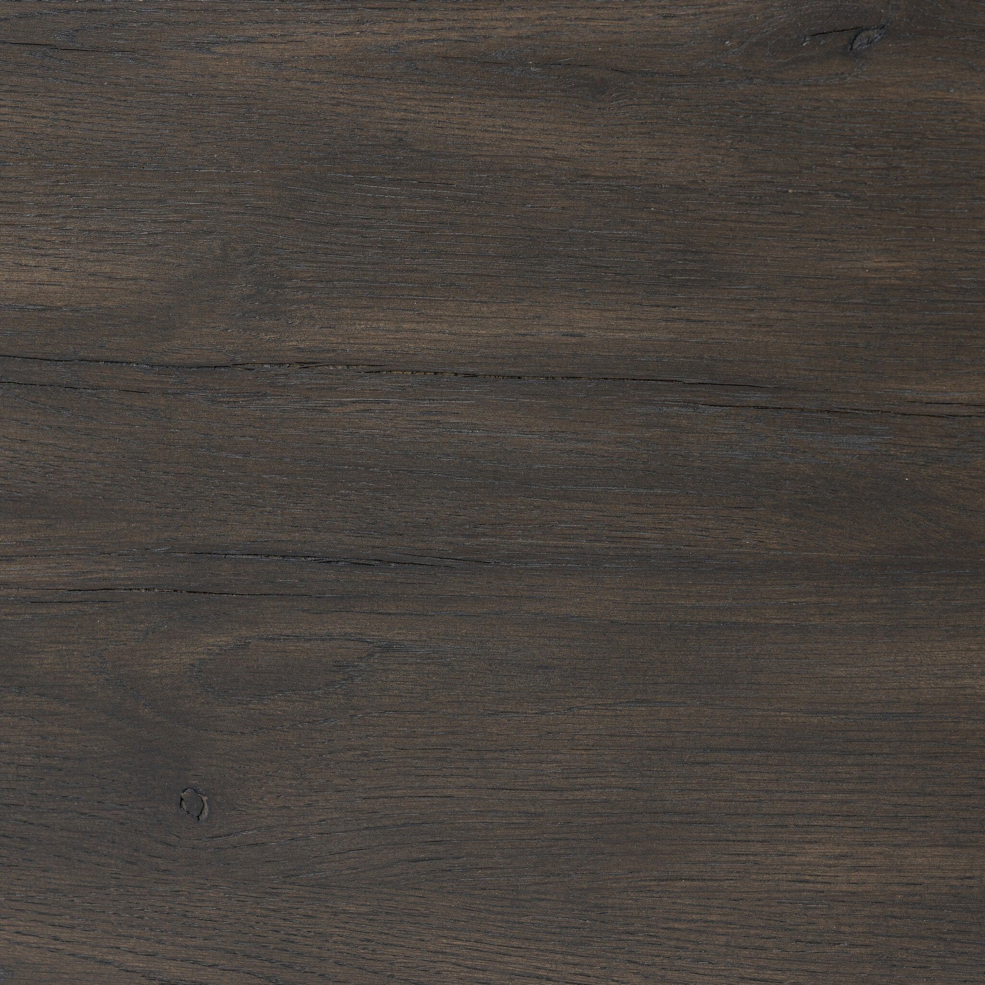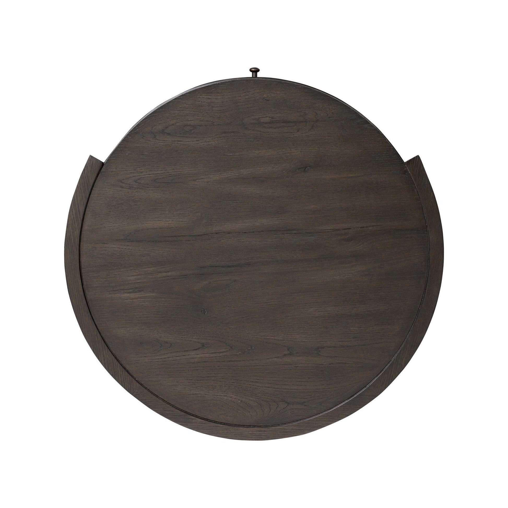 Rich contours bring character to the bedside. A round black-finished oak table has a spacious cubby and a single drawer with metal glides and a bronzed pull.