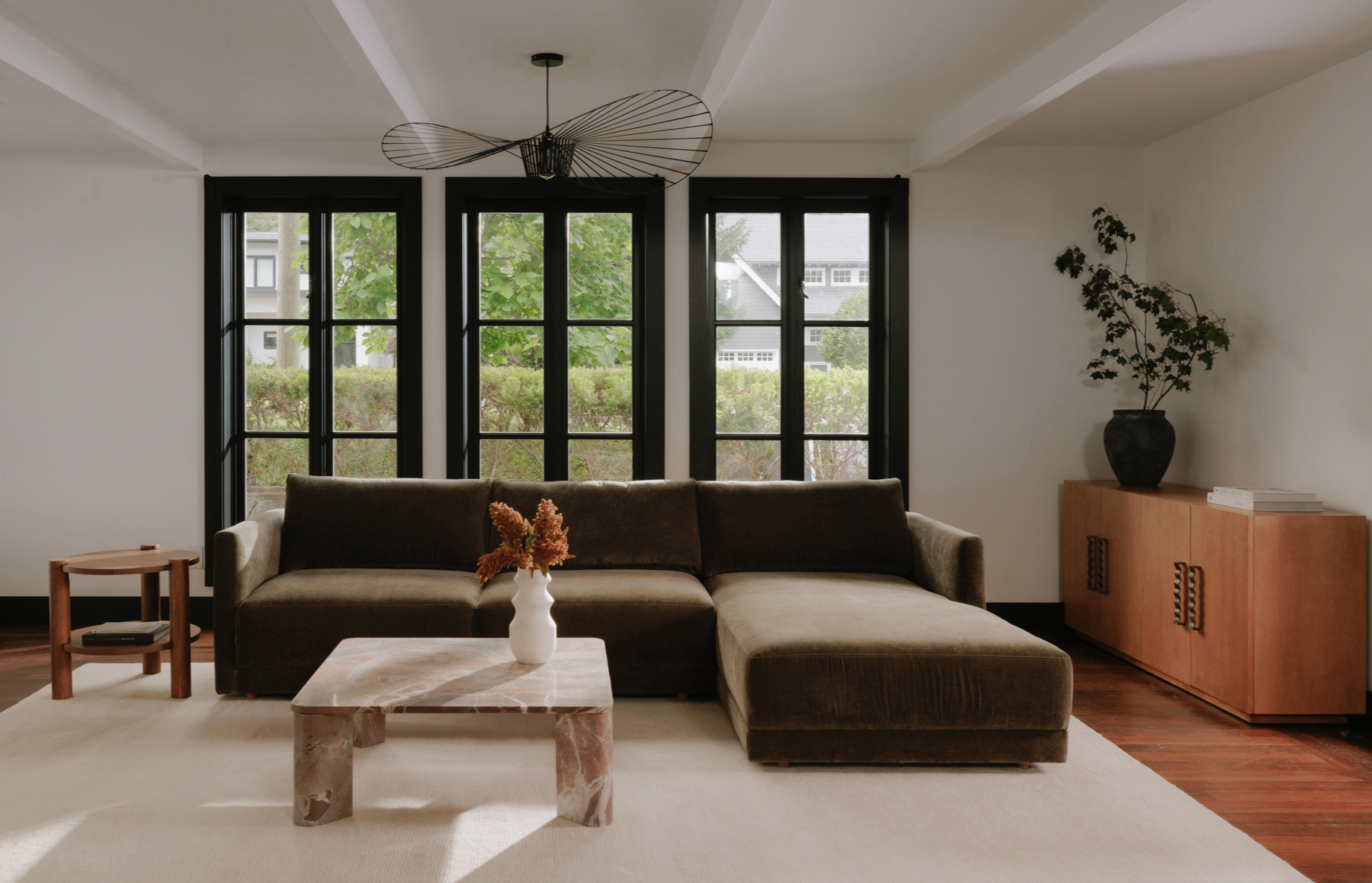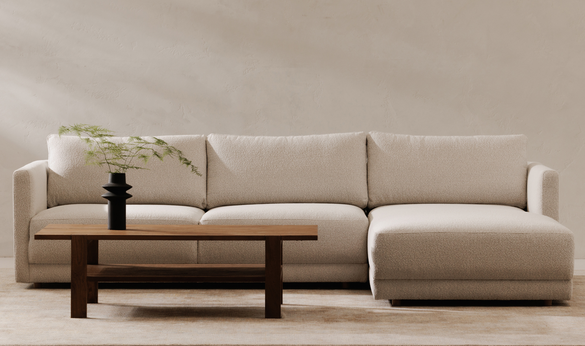 The Brienne Sectional effortlessly combines style with sustainability. Its larger profile, finished in boucle, velvet, and wool blend, exudes warmth and traditional, heirloom-like qualities. Its GRS© certification ensures the use of recycled material, while its FSC®-certified wood frame guarantees responsible sourcing and production. Improve your living space with this eco-friendly, luxurious sectional.