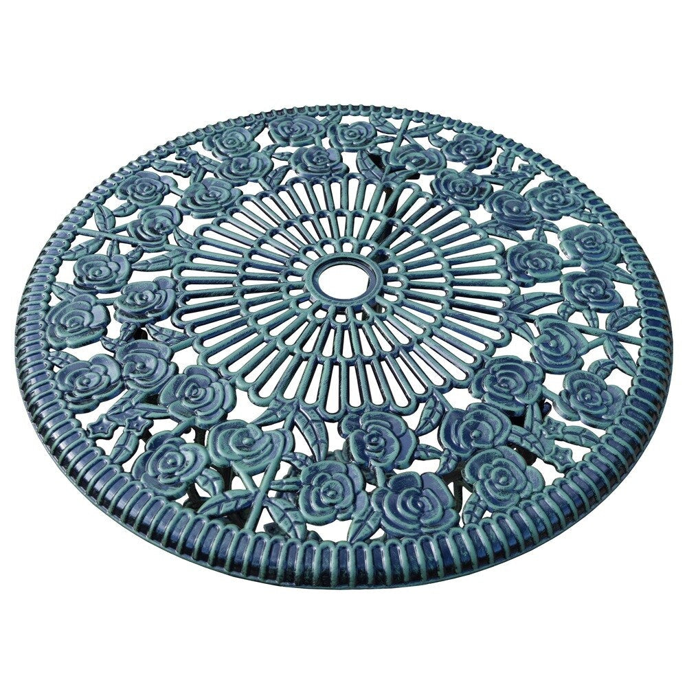 Enjoy outdoor dining or a cozy indoor meal with The Camellia Collection 3-piece Bistro Set. This cast metal set is both elegant and sturdy, featuring delicate floral designs and a traditional construction made of durable cast aluminum. The round table has an umbrella opening in the center, while the two bistro chairs and table legs are finished in verdi green for a touch of sophistication. Perfect for any entertainment setting, this set includes one table and two chairs.