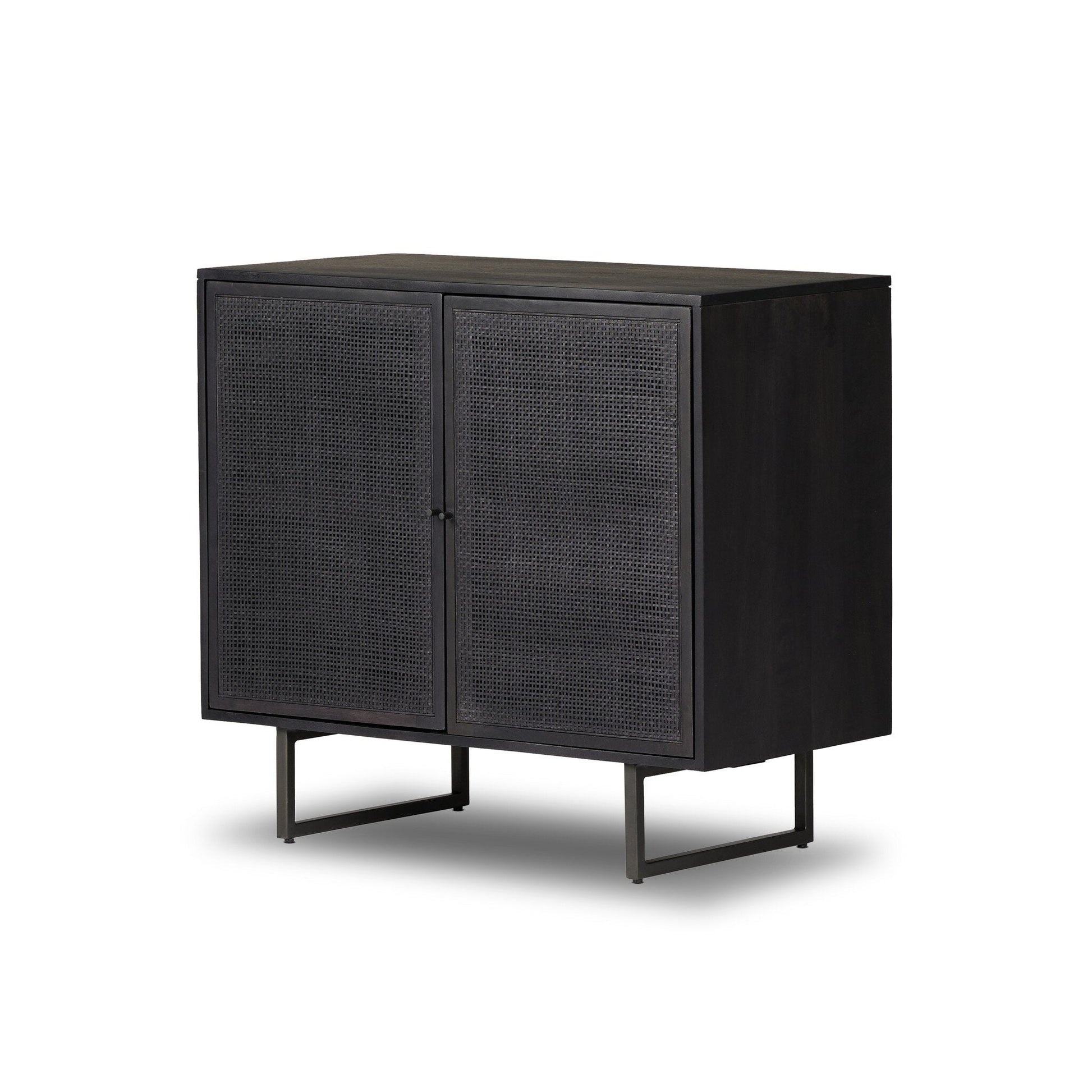 Surrounded by solid mango casing, brown cane door fronts place a textural twist on midcentury-inspired styling. Airy and angular, charcoal-finished iron legs bring just-right balance to the whole look.