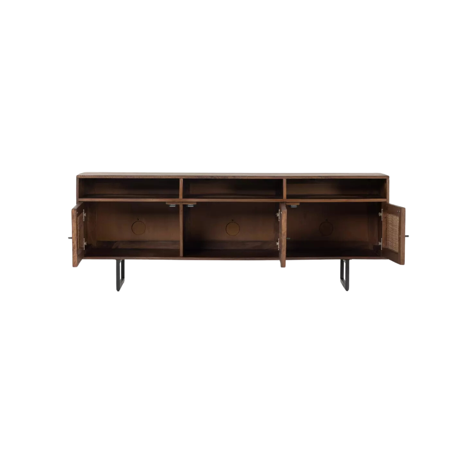 Add a touch of texture and midcentury-inspired style to your space with the Carmela Media Console. The solid mango casing and brown cane door fronts offer a unique twist while the charcoal-finished iron legs provide balance. This furniture piece is both stylish and functional, making it a perfect addition to your home.