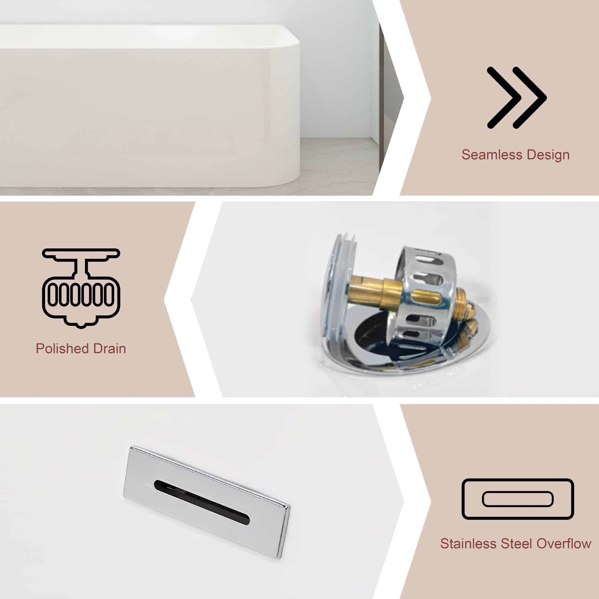 SCB HOME this 59'&67' Freestanding Acrylic Soaking Bathtub Single Side Against The Wall,Left/Right Overflow provide you with the ultimate bathing bathtubs for you to choose from to enjoy your bathing time. Our bathtubs help you to be very comfortable while completely relaxing. Single side against the wall design can more fitted to the wall saves more space, which is suitable for the placement of small bathroom spaces.The bathtub is made of 100% high-quality acrylic materials which allows the tubs to be very durable and strong. It can be used effectively for a long time.The gentle sloping lines follow the natural curves of your body for utmost relaxation.Large curvature for lying diagonally can soaking your body.Give you a more immersive experience and comfortable soaking.Rigid and durable design on the bottom provide comprehensive internal stainless steel support. Increase the bathtub bearing capacity, not easy to damage.You can effortlessly use the tub without having any worries.The surface polishing process and high-grade acrylic material make it easy to clean, anti-scratch, anti-yellow.Anti-slip design increase the friction of the bottom avoid the risk of slipping after deep soaking more safety.The bathtub helps you to relax completely. Have the best experience using our one-of-a-kind bathtubs and change the way you shower!