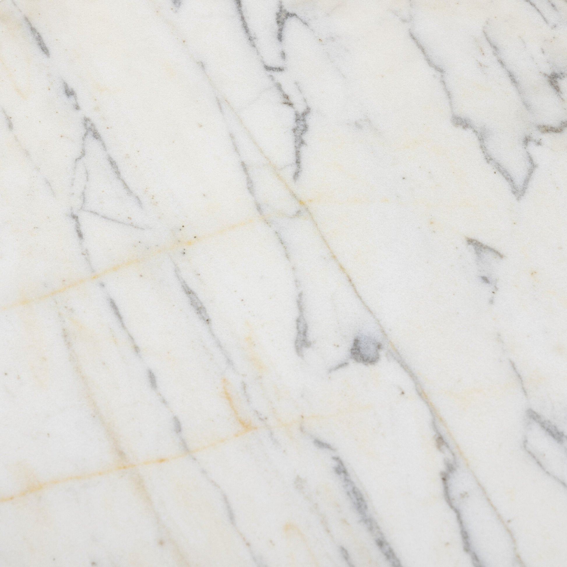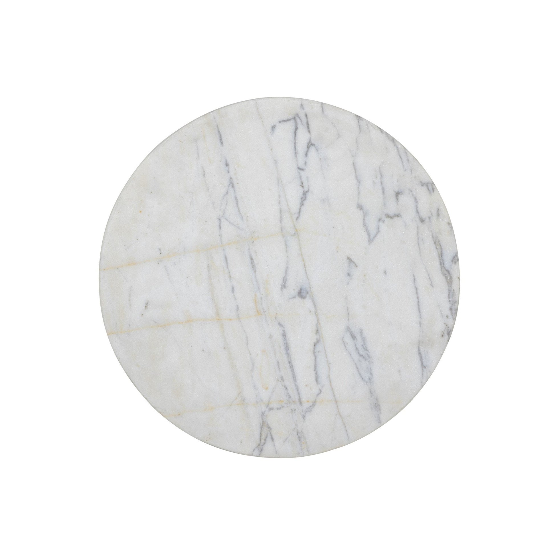 Made from cast aluminum finished in a hammered gunmetal, a unique base is shaped from three looped legs joined together with a center ball detail. A rounded tabletop of veined white marble finishes the look.