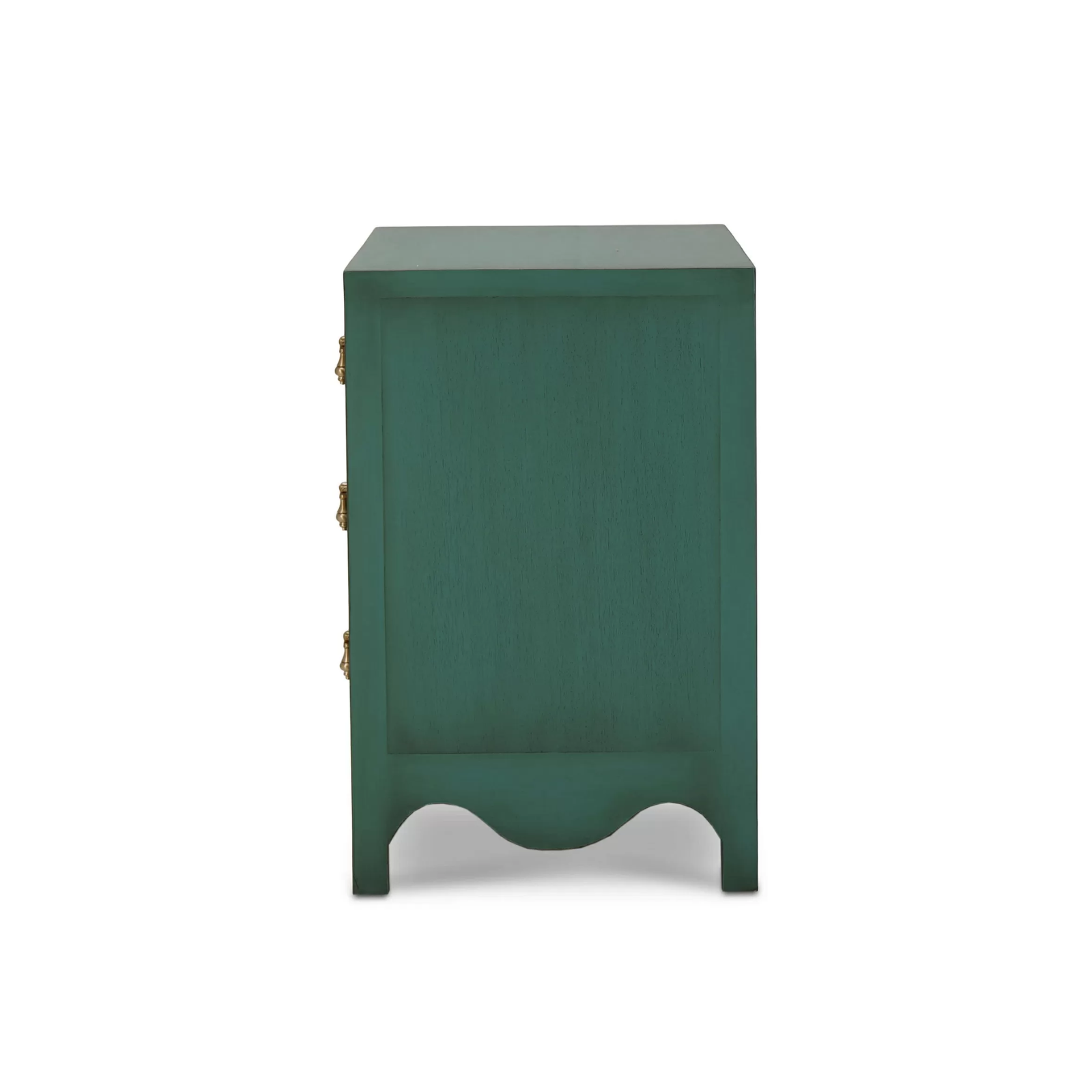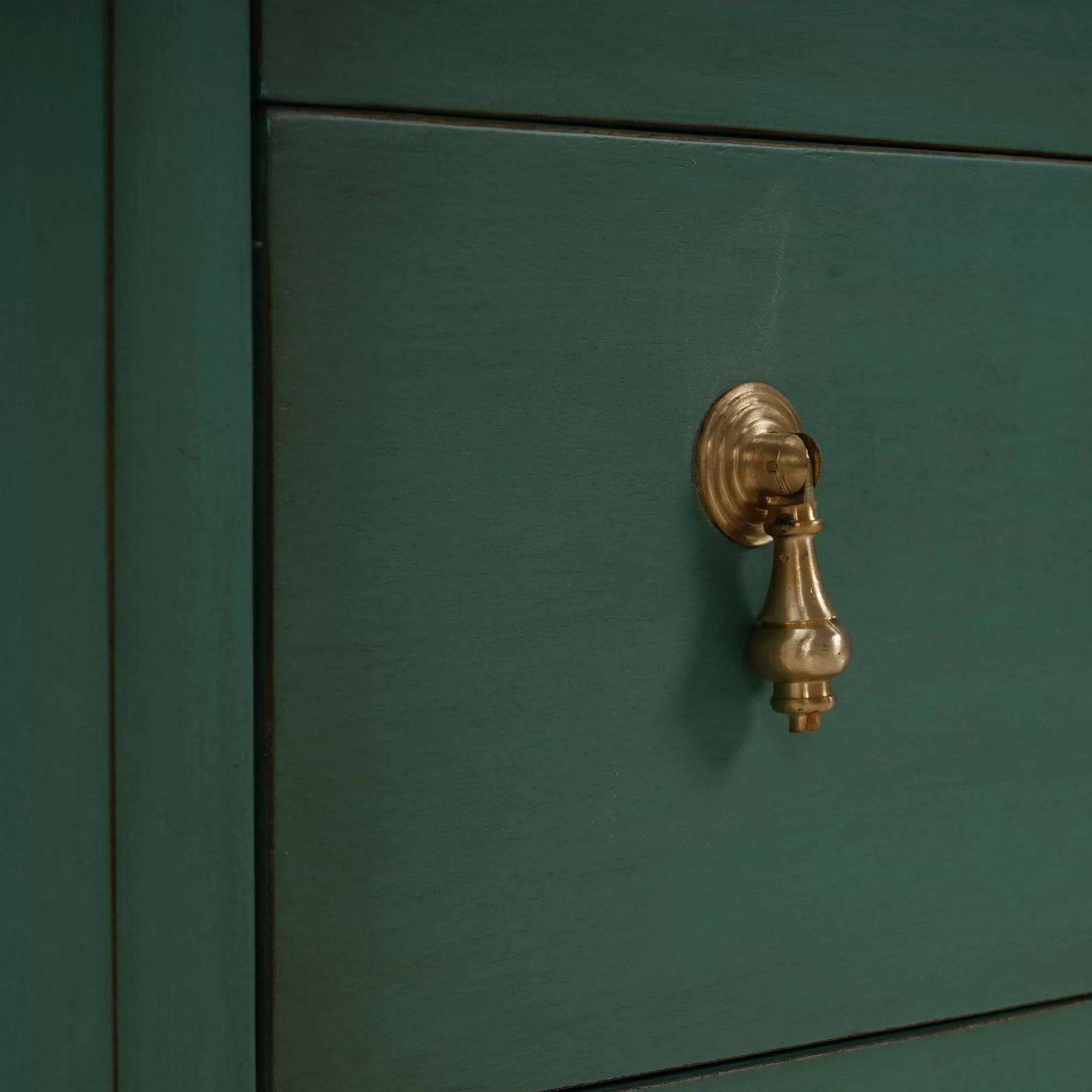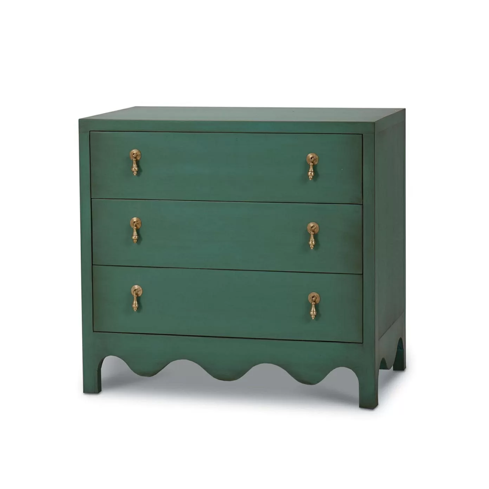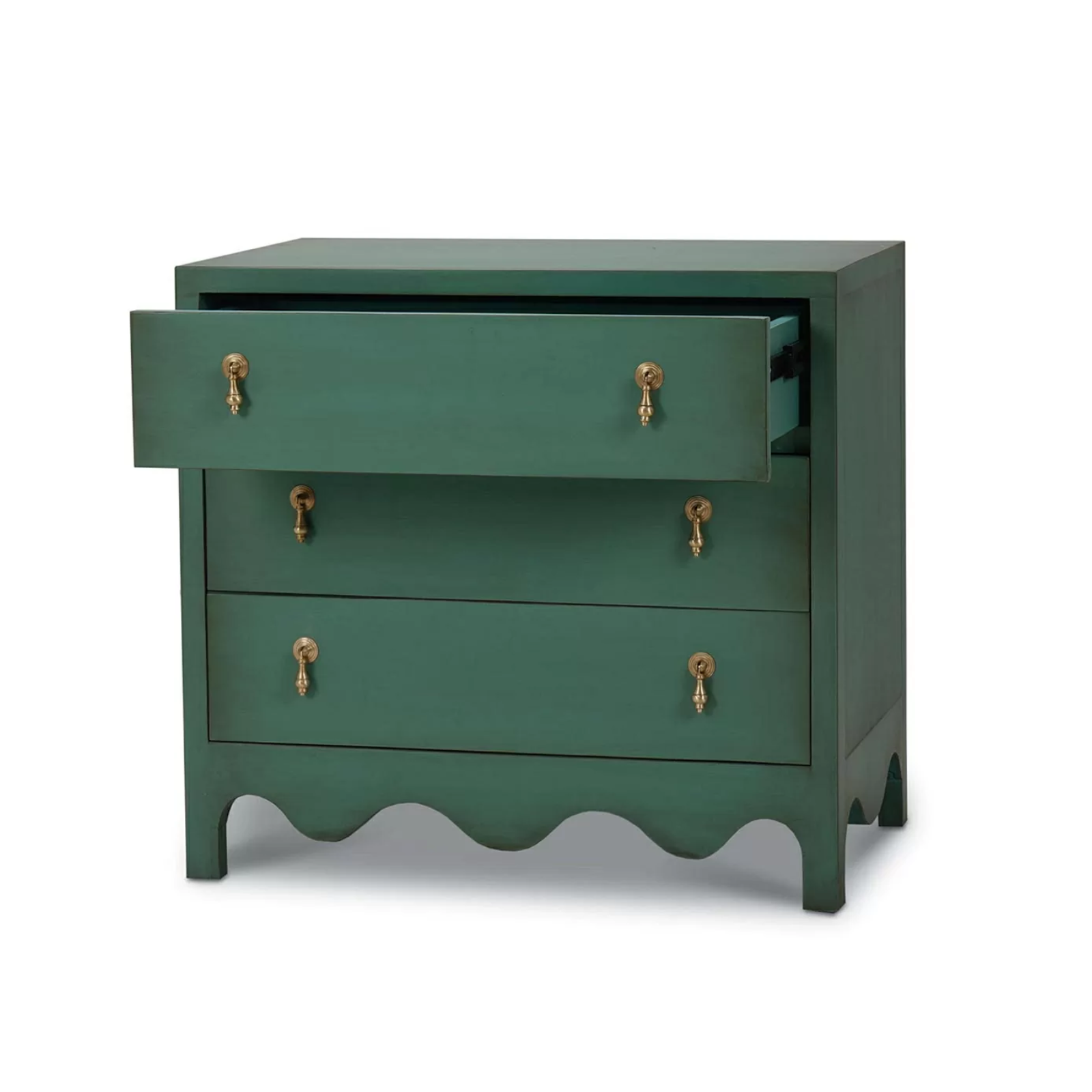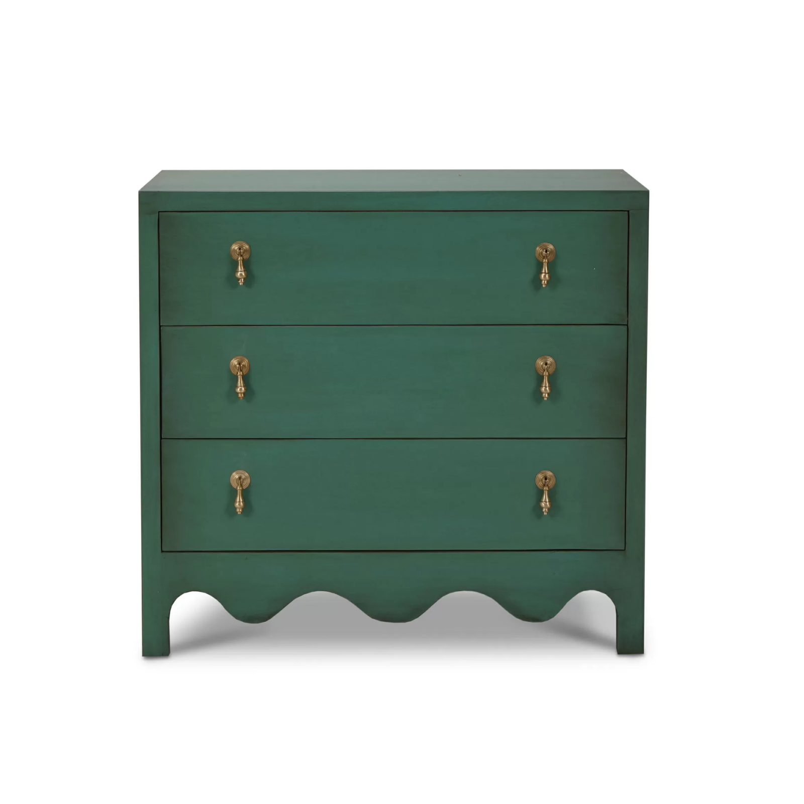 This Colleen 3 Drawer Dresser is both versatile and stunning with eye-catching vintage drop drawer handles and scallop edge detailing. The stunning green adds a pop of colour to any room, making it a functional and stylish addition to your home.