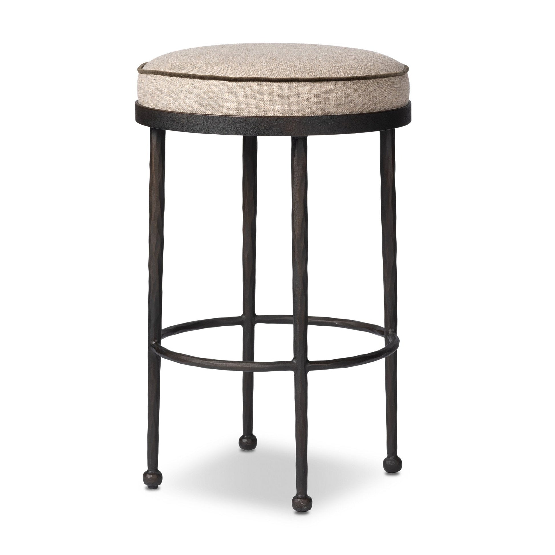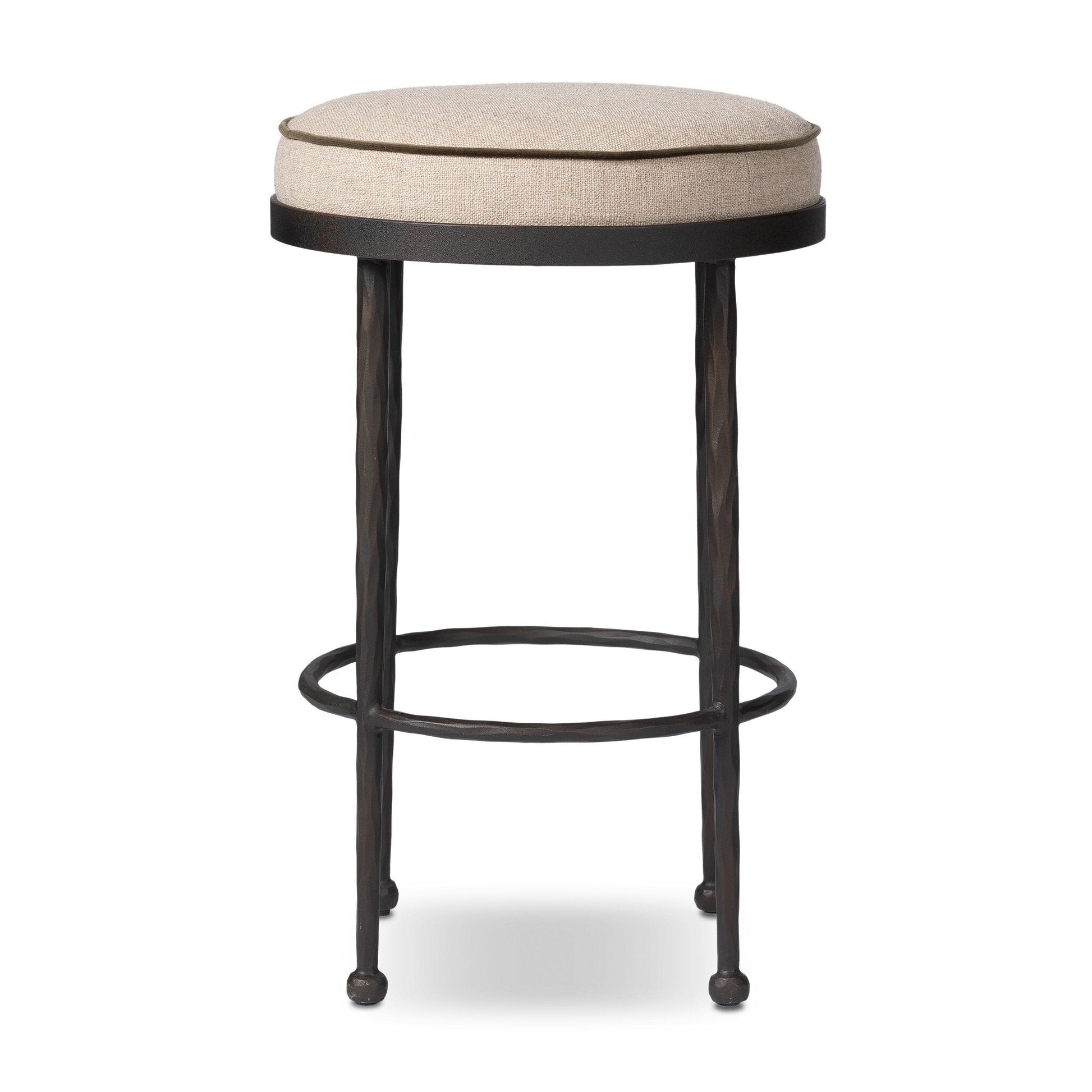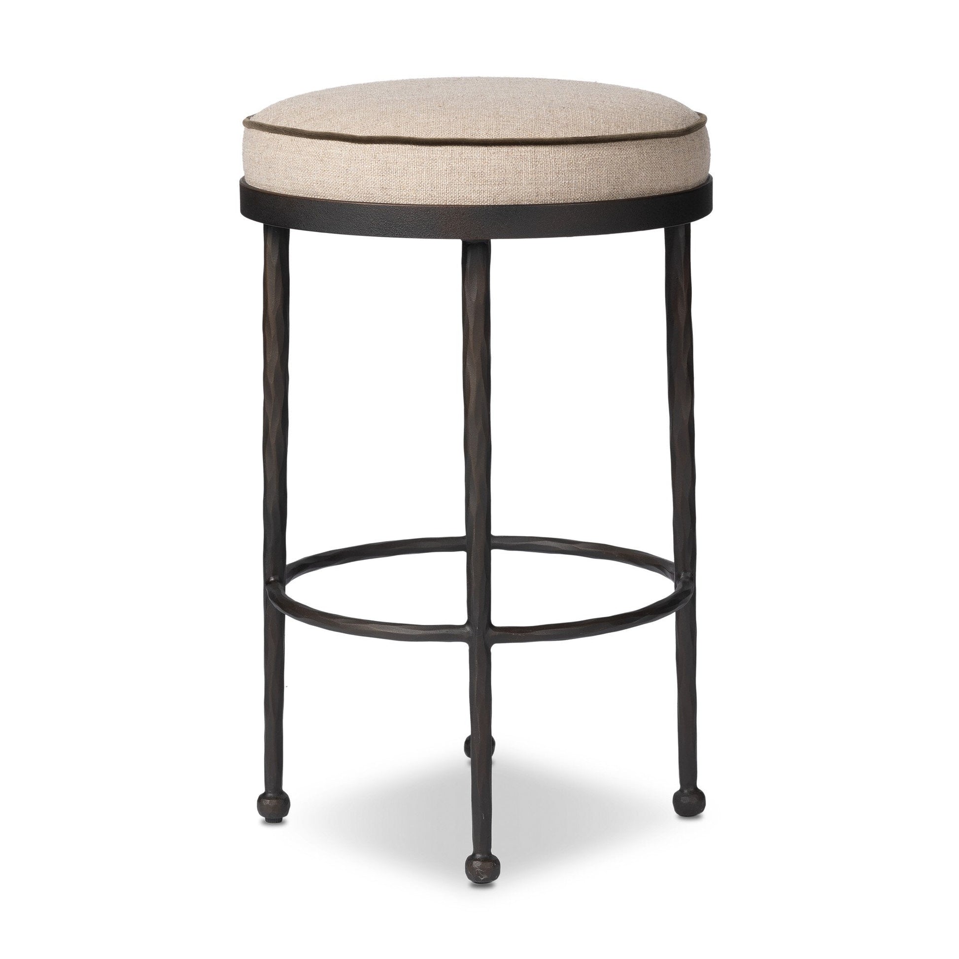 Hammered iron legs with ball-shaped foot details elevate this simply shaped counter stool. A round, cushioned seat upholstered in performance fabric offers a clean, inviting look. Performance fabrics are specially created to withstand spills, stains, high traffic and wear, ensuring long-term comfort and unmatched durability.