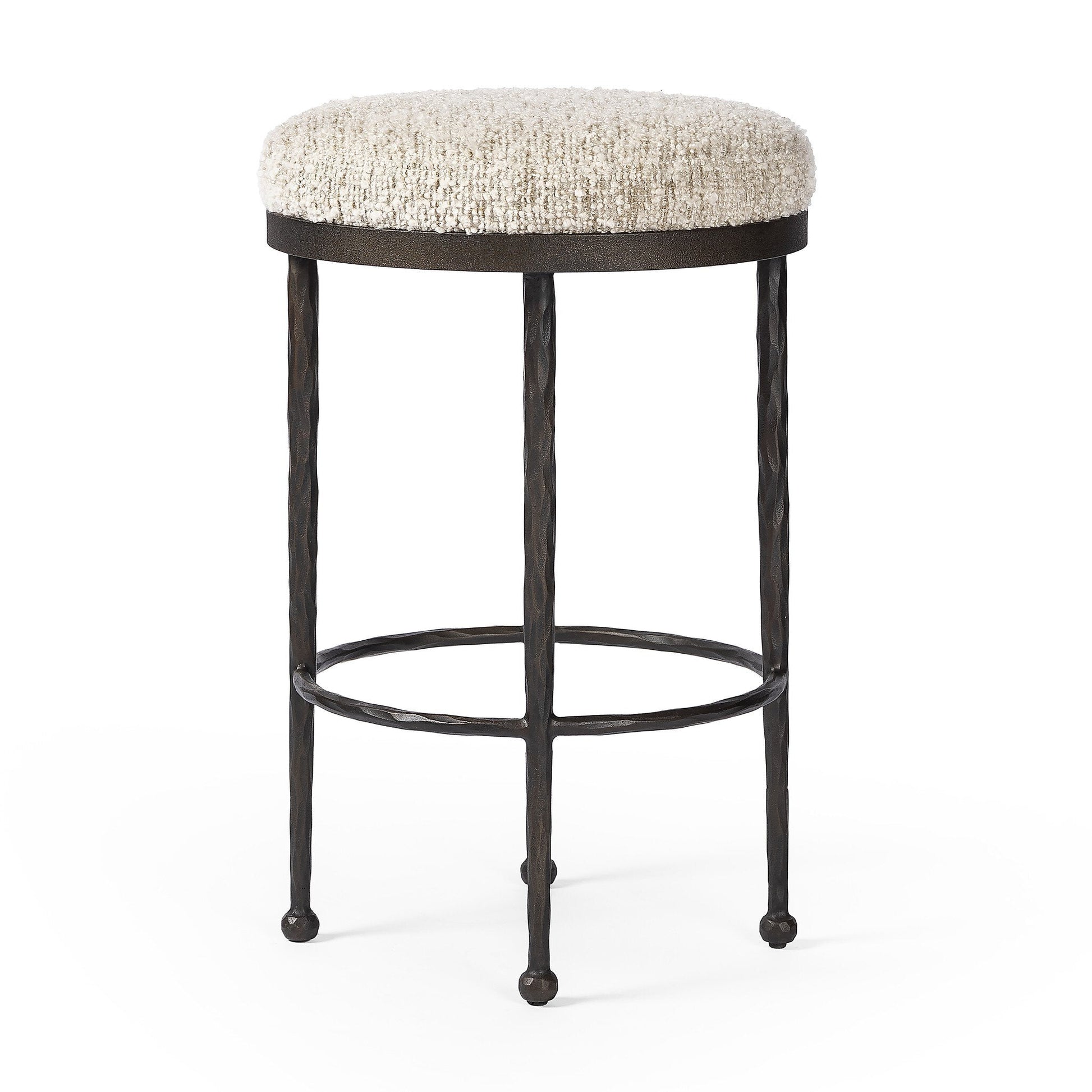 Add some character to your kitchen or bar with the Corinne Counter Stool. Featuring hammered bronze legs and ball-shaped foot details, this simply shaped stool is elevated and eye-catching. The round, cushioned seat adds comfort and is covered in a heavy boucle-like fabric for a clean and inviting finish.