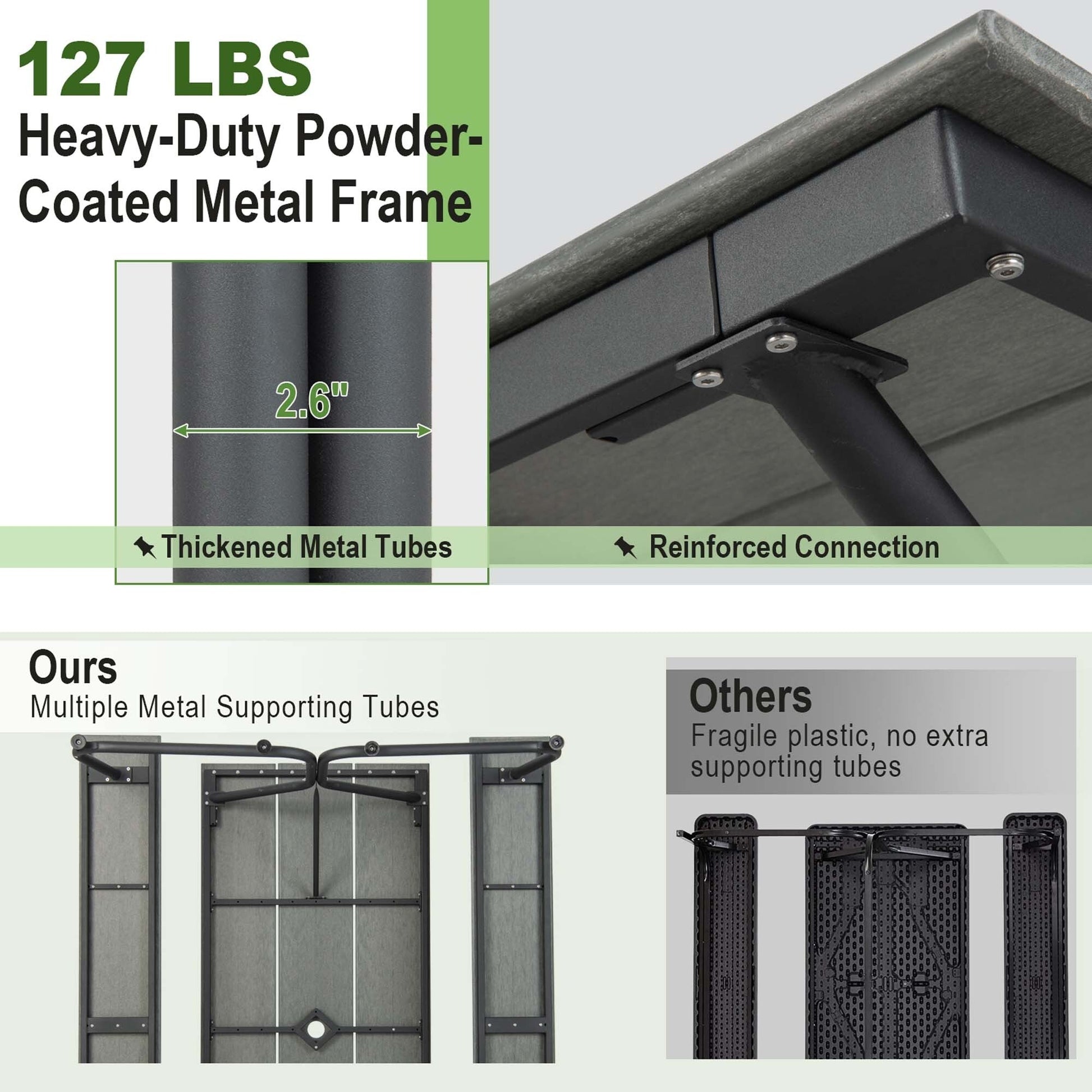 This outdoor picnic table set is designed with a large picnic table and 2 benches, and each bench can hold up to 3-44 persons. In contrast to others wooden table that is susceptible to corrosion and metal table that is susceptible to rust, our HDPE tabletop is dirt-resistant, waterproof, and sun-protection, lasting for years to come. More than that, the heavy-duty metal frame is constructed of 1.3'' thickened metal tubes and adopts reinforced connections, ensuring good sturdiness. And there exists 8 large adjustable footpads on the bottom, helping keep it stable even on uneven grounds. In addition, the dining table is designed with a built-in umbrella hole (diameter: 2.3''), bringing convenience for inserting an outdoor umbrella and enjoying a shady outdoor area. With its exquisite craftsmanship and sleek lines, this stylish picnic table can also be a highlight to any indoor or outdoor space.