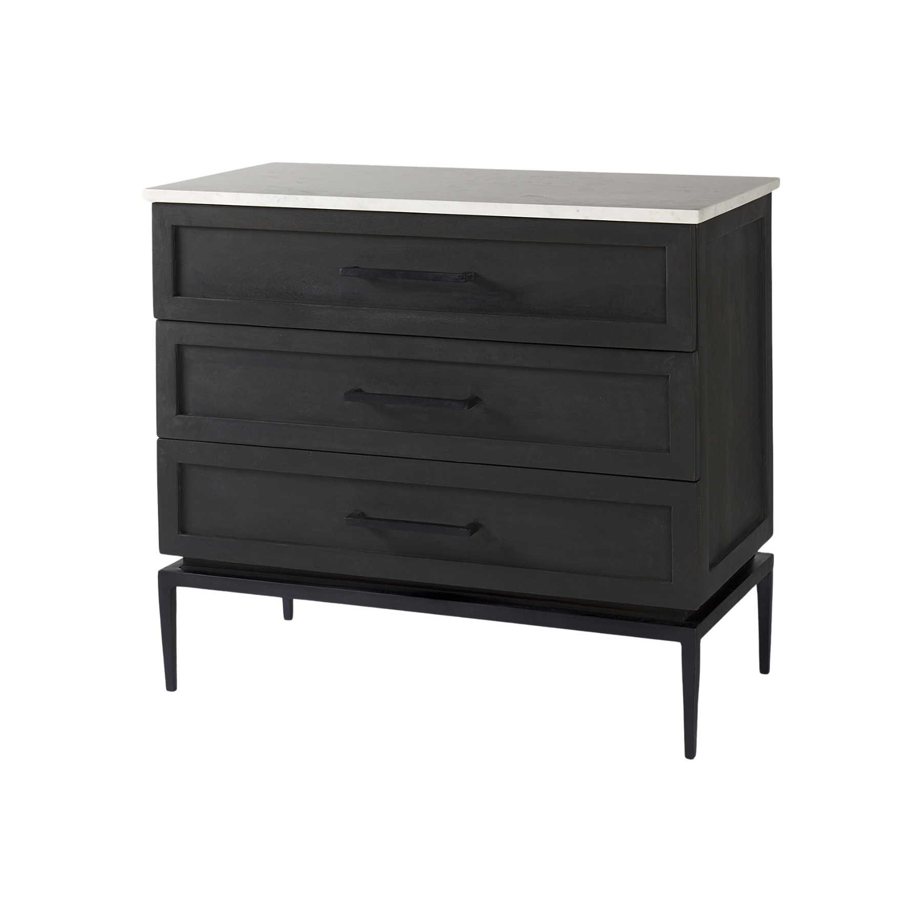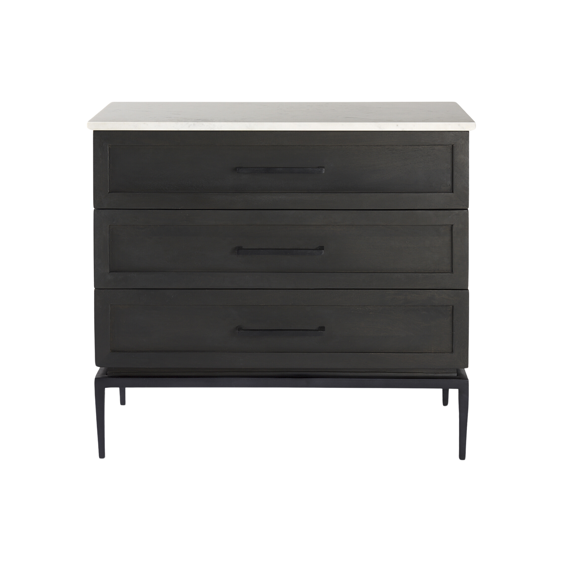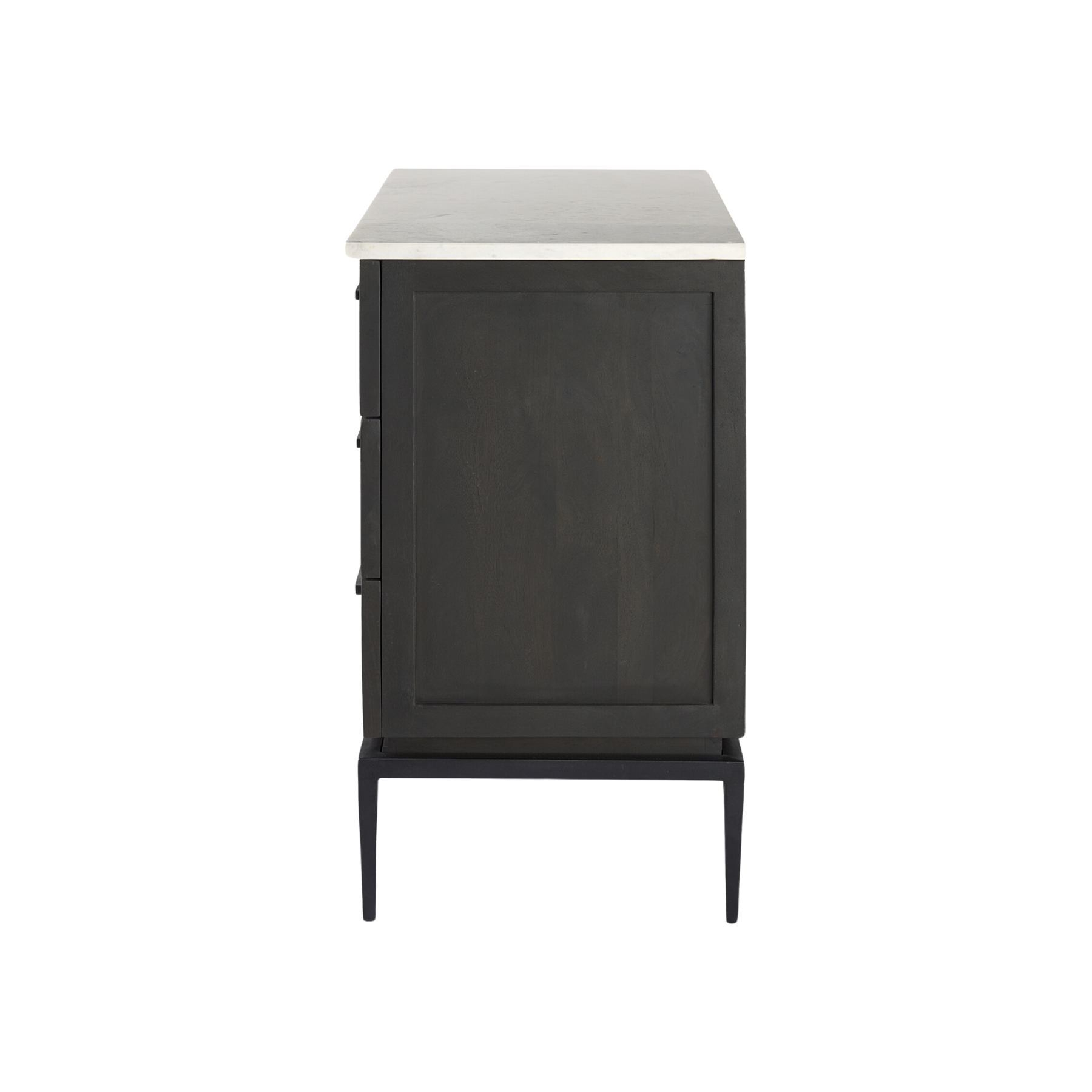 This modern accent piece blends a fusion of materials in a clean, straightforward design. It features a solid Mango wood body with three drawers, topped by a rectangular marble slab and supported, off the floor, by four iron legs. All smooth in texture, the white marble top has creamy undertones with grey and beige veining throughout, the wood has a dark brown, uniform appearance, and the metal legs have an unfussy, matte black coating. The drawers are neatly finished with silver bar pull handles.