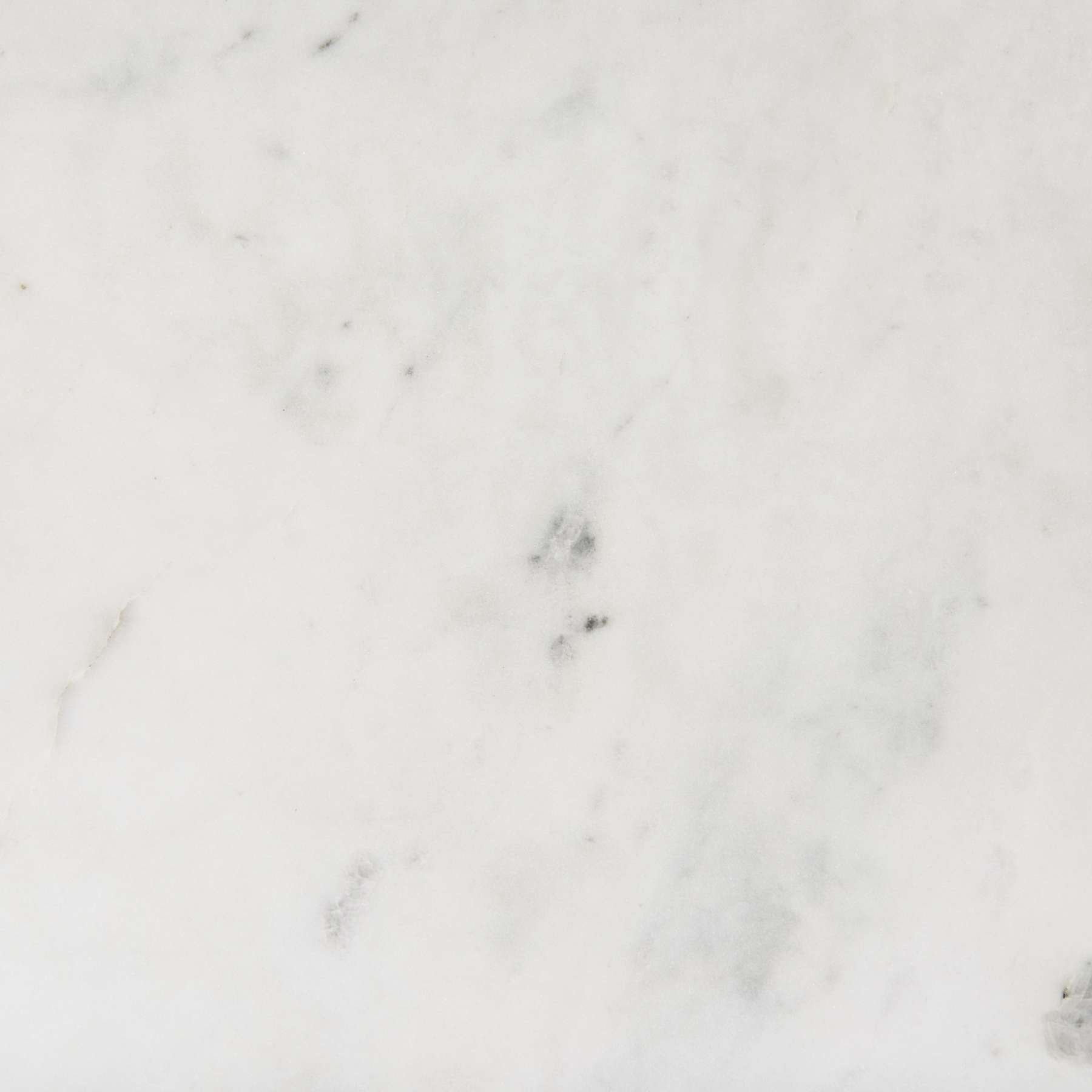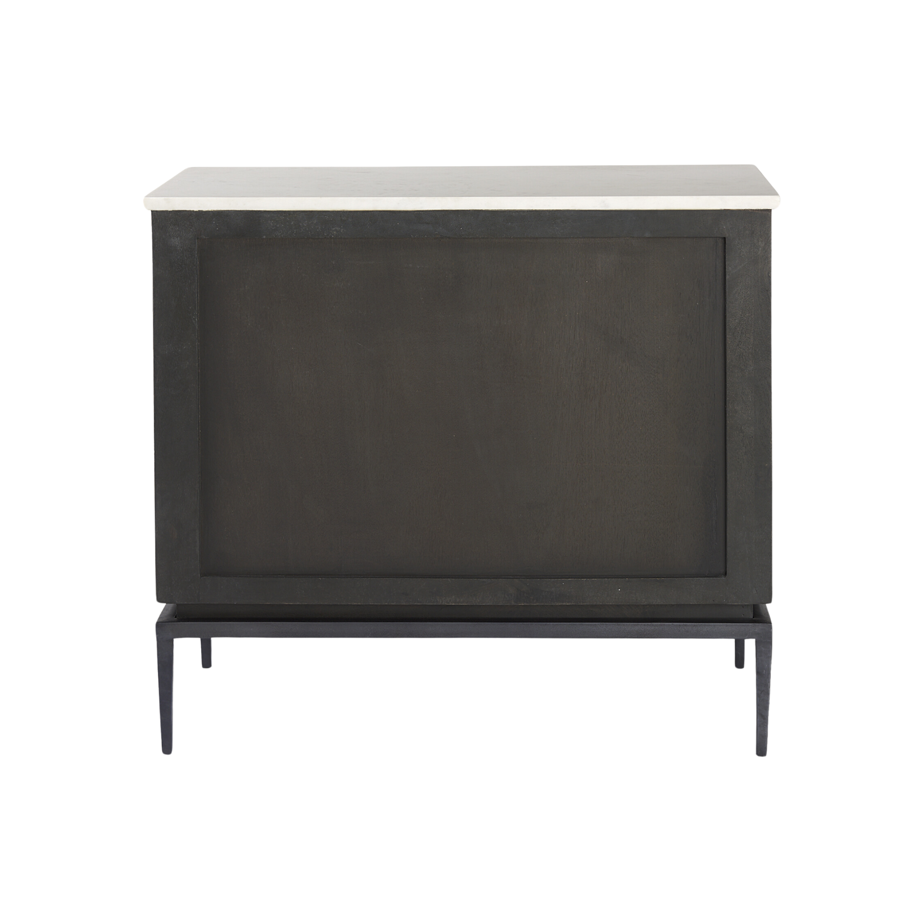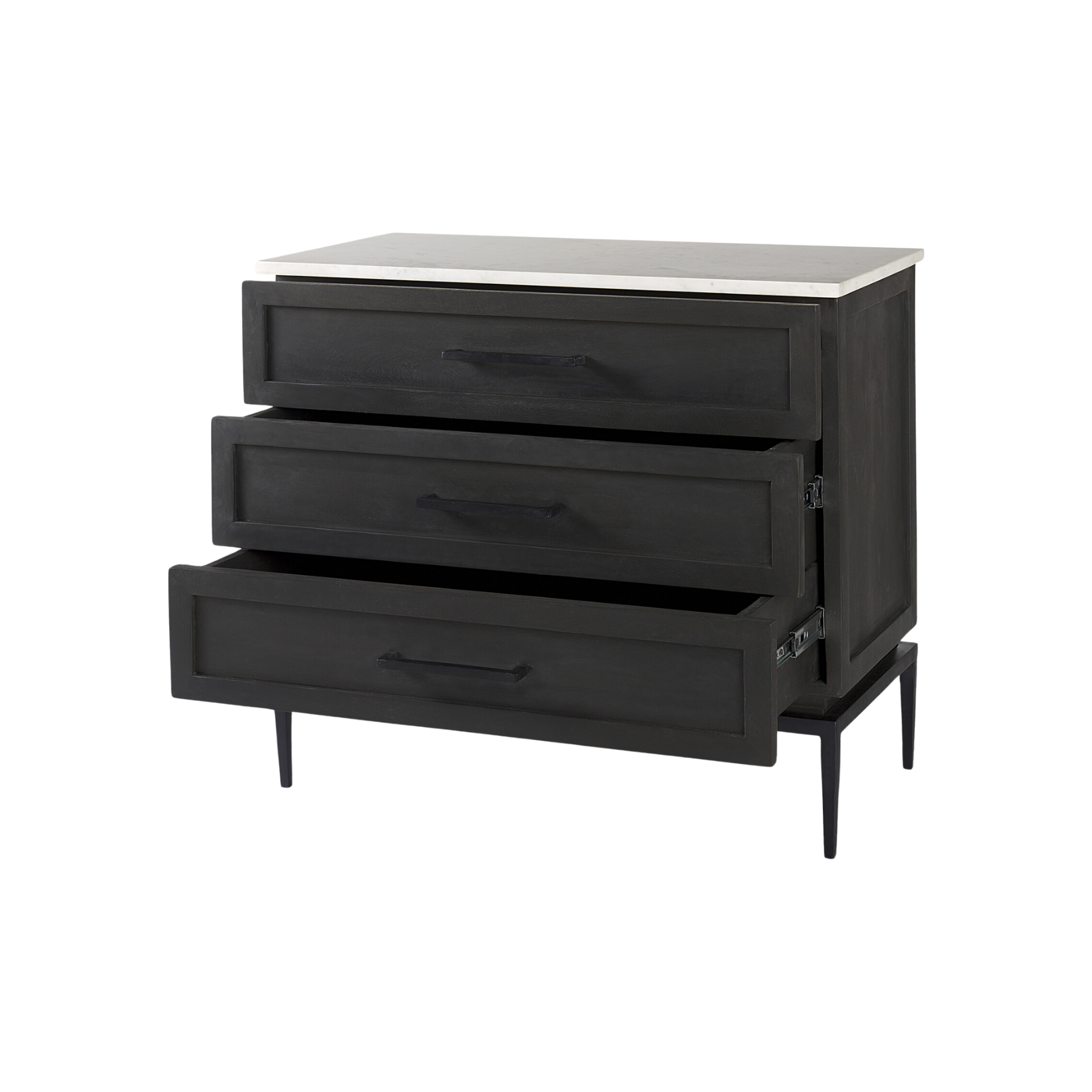 This modern accent piece blends a fusion of materials in a clean, straightforward design. It features a solid Mango wood body with three drawers, topped by a rectangular marble slab and supported, off the floor, by four iron legs. All smooth in texture, the white marble top has creamy undertones with grey and beige veining throughout, the wood has a dark brown, uniform appearance, and the metal legs have an unfussy, matte black coating. The drawers are neatly finished with silver bar pull handles.