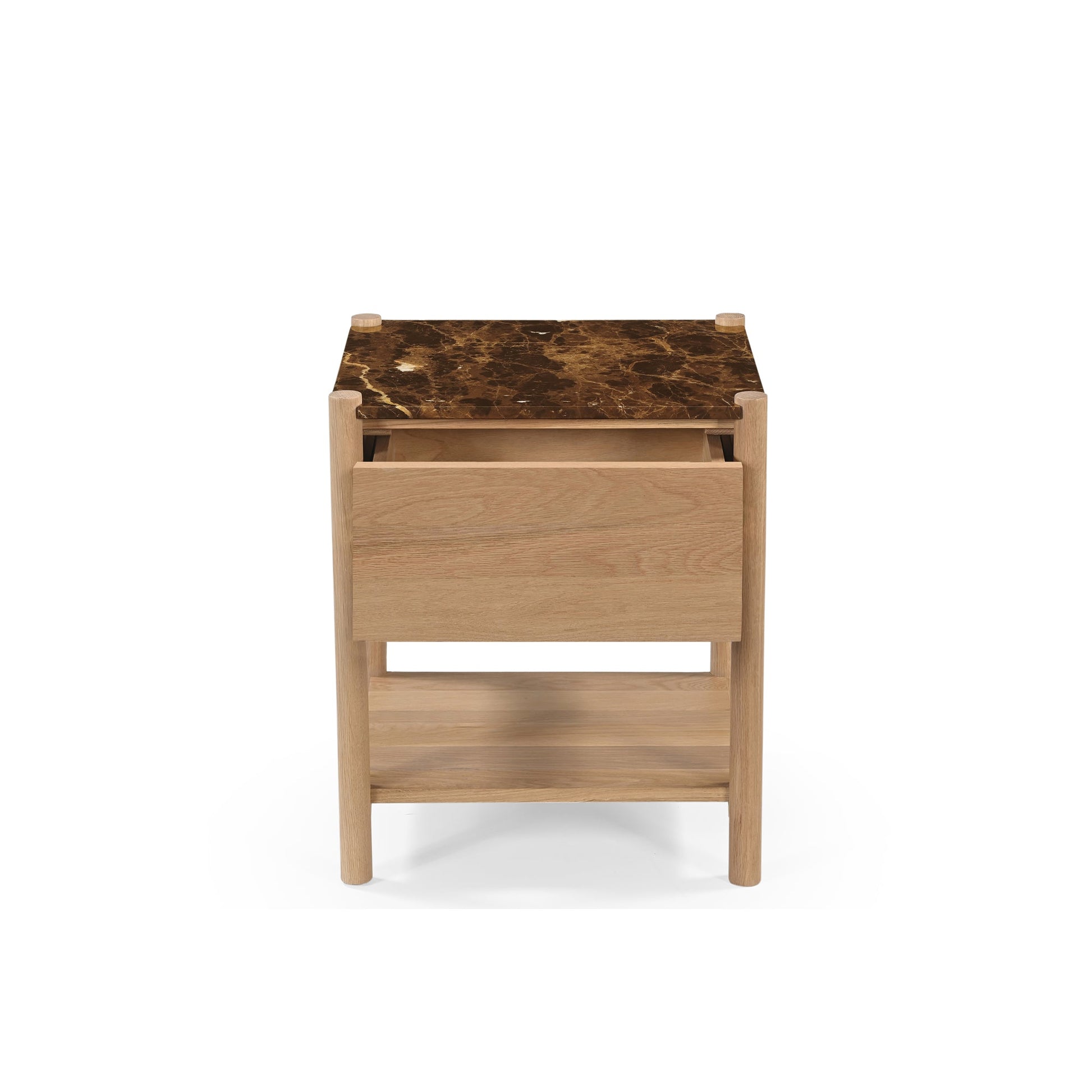 The Elan nightstand combines the sophistication of mixed materials with a transitional design. Dark Emperador marble’s deep hues complement the natural warmth of oak, resulting in a subtle yet luxurious piece. Featuring a marble top, oak shelf, and soft-close drawer, it balances elegance with practicality. Distinctive post cutouts enhance visual appeal, while the unique marble veining ensures every unit is truly one-of-a-kind.