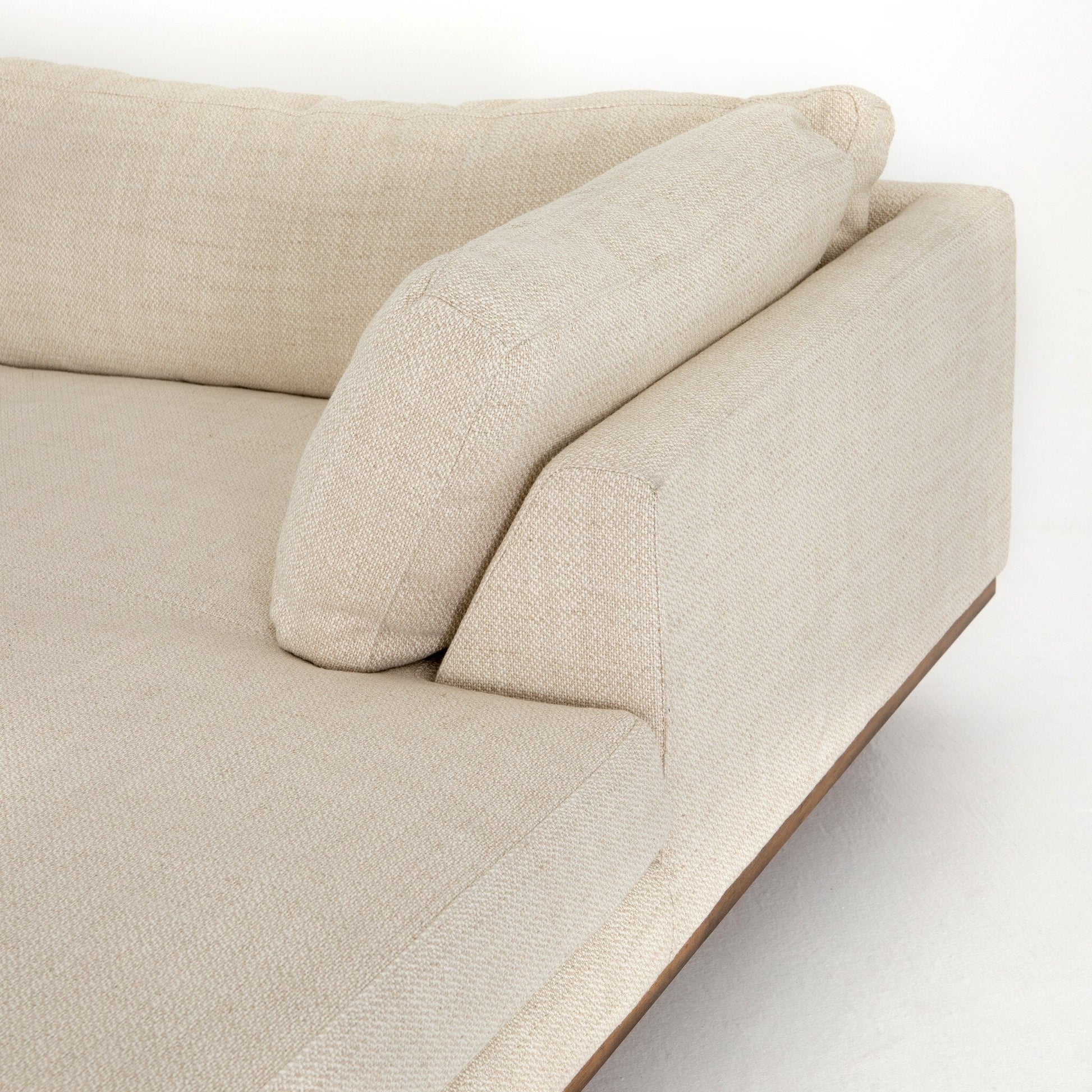 Classic goes contemporary. A cocoa-finished parawood base supports low, deep seating of performance-grade upholstery in an invitingly neutral taupe, with track arms for a clean touch. Left arm facing two-piece sectional.