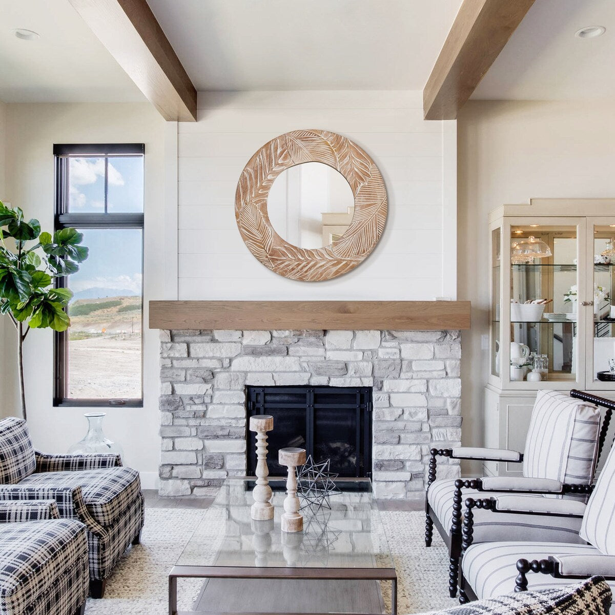 Farmhouse Carved Wood Round Wall Mirror - 28 x 28