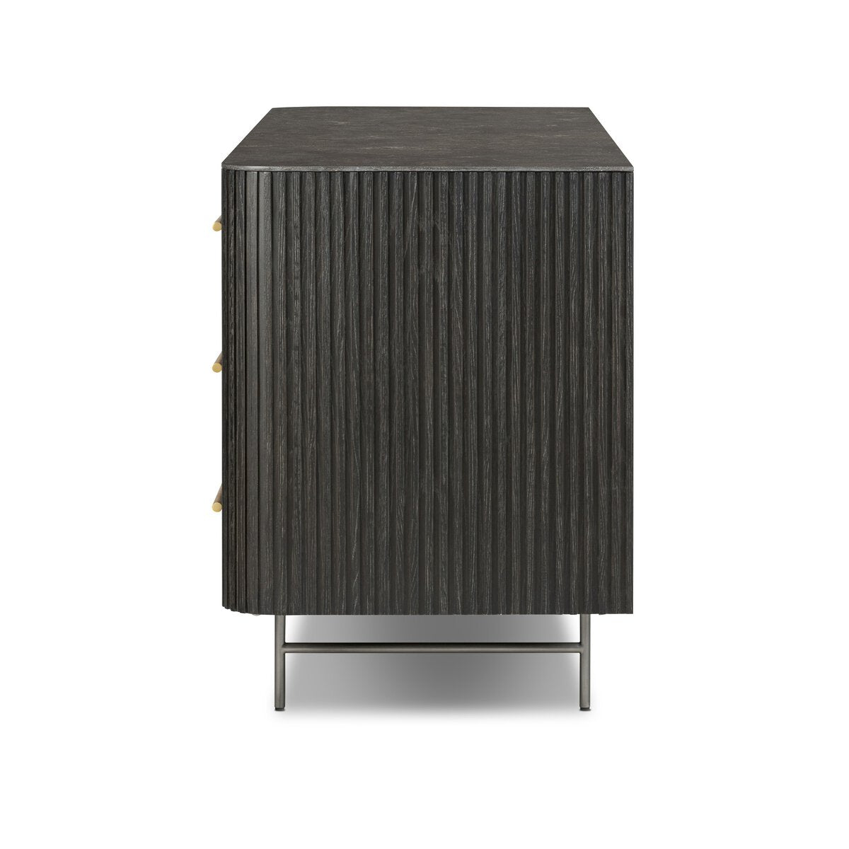 The Fletcher 6-Drawer Dresser combines refined craftsmanship with natural materials for sophisticated bedroom storage. Its distressed black-finished solid oak frame features rich reeding and curved corners, enhancing texture and linear elegance. Six spacious drawers are accented with polished brass hardware, offering both style and functionality. Topped with bluestone, the dresser introduces subtle variations in color, texture, and pattern, highlighting the unique character of each stone. This piece balances durability and design, making it a distinguished addition to any refined interior.