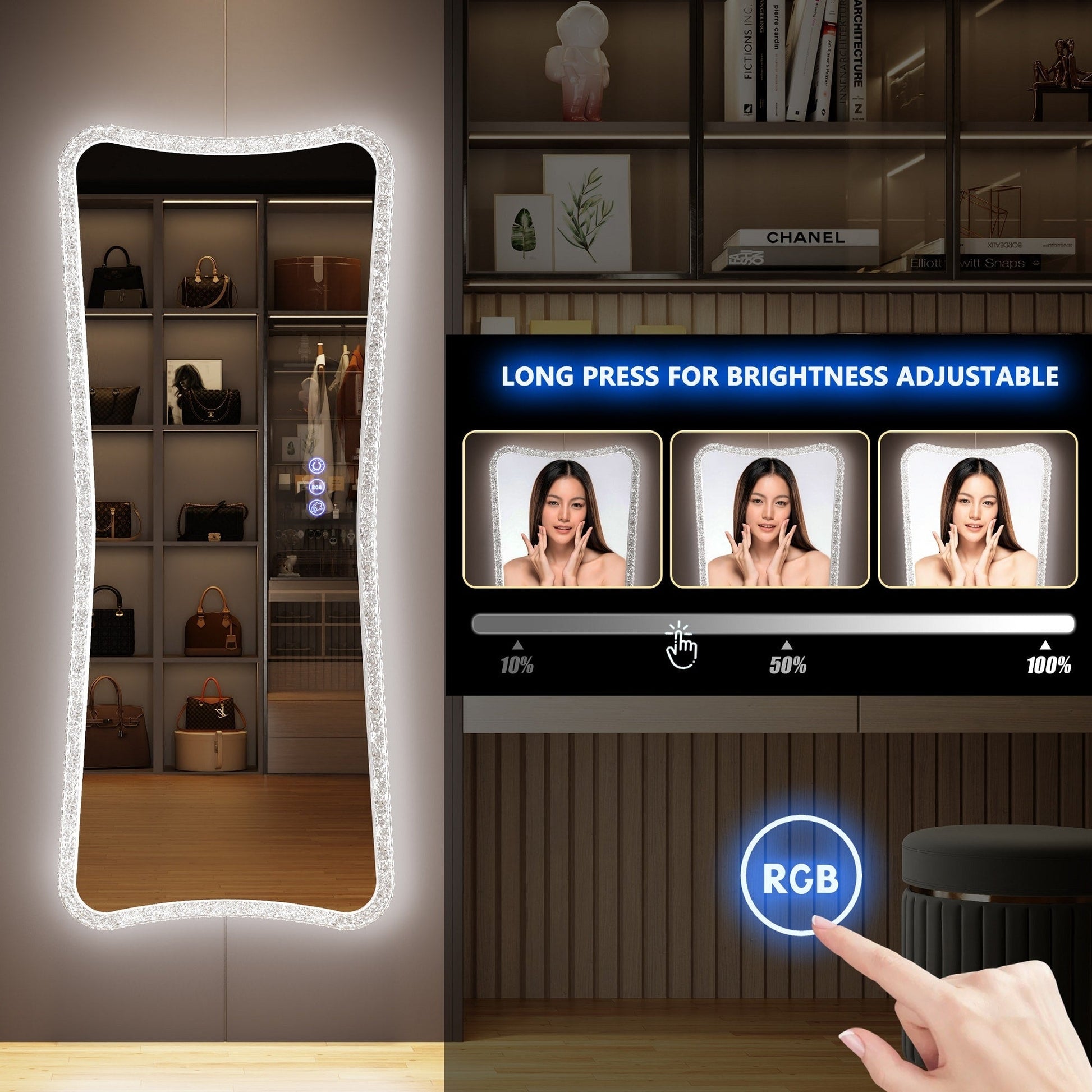- The full-length mirror with lights surrounded by 50,000 hours life high brightness LED Light Strip, with 7 Dynamic Mode Lights and 7 Static Mode Lights settings, with adjustable brightness of 0%-100% can meet your personal makeup requirement.