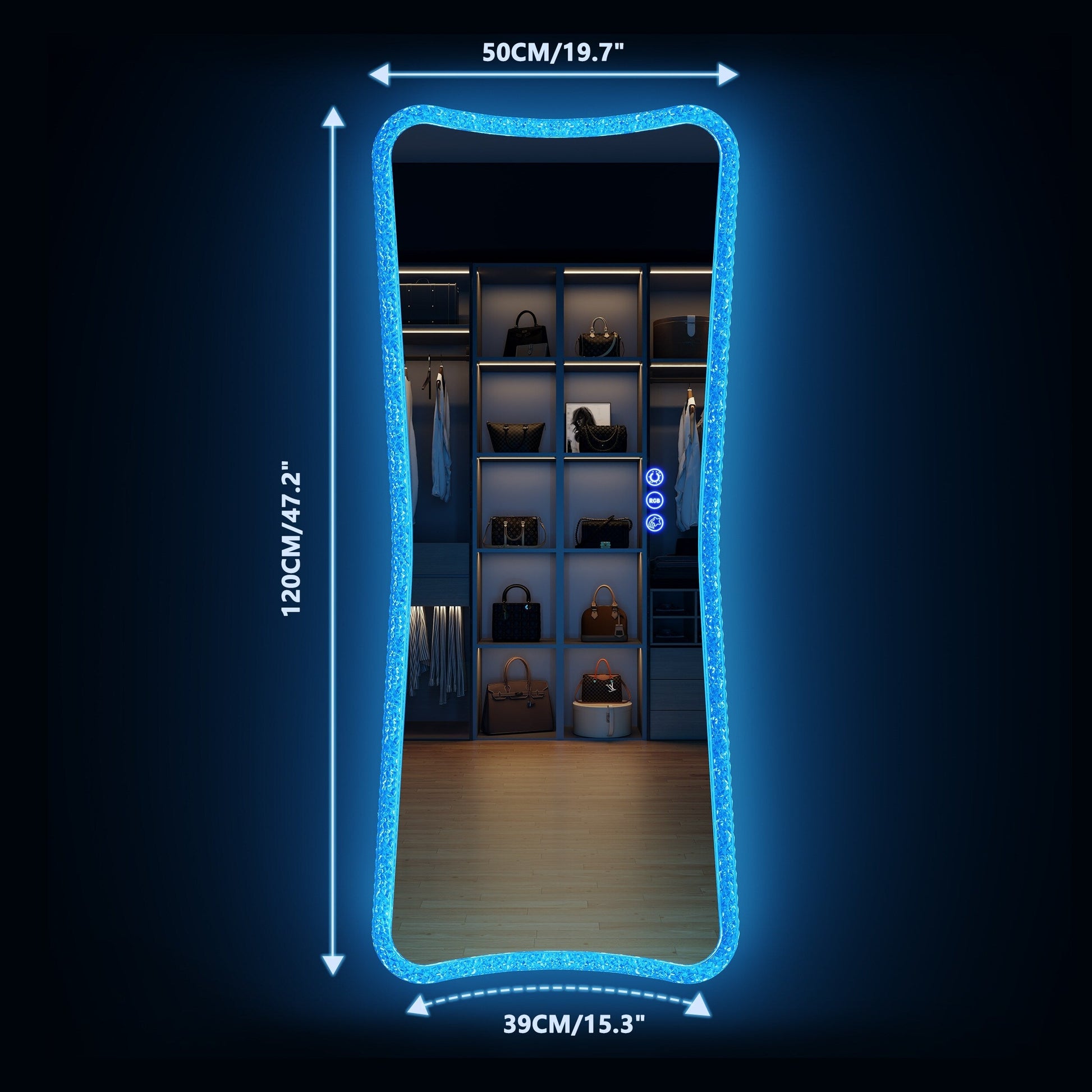 RGB wall-mounted vanity mirror built-in LED light strip 7 color-changing modes, colorful lighting change irregularly, this is a more eye-catching full-length mirror. A simple pure color frame highlights this mirror's minimalist style, this RGB wall-mounted vanity mirror gives your home a more atmosphere feel.
