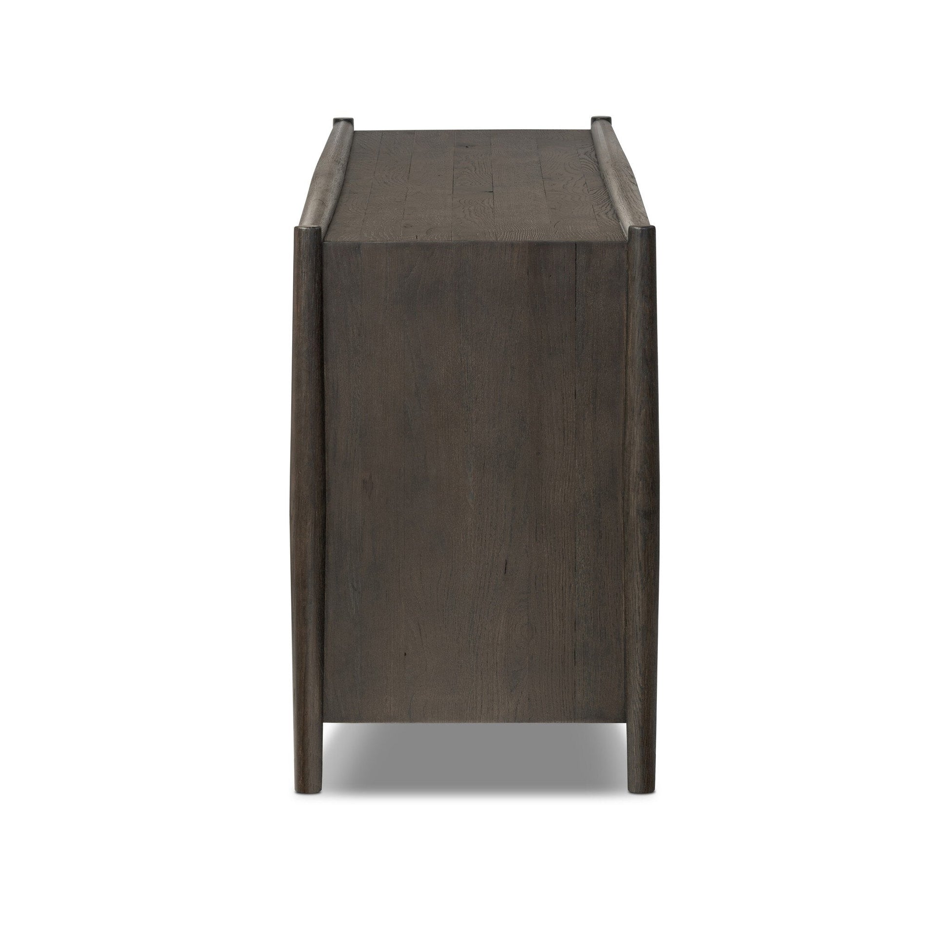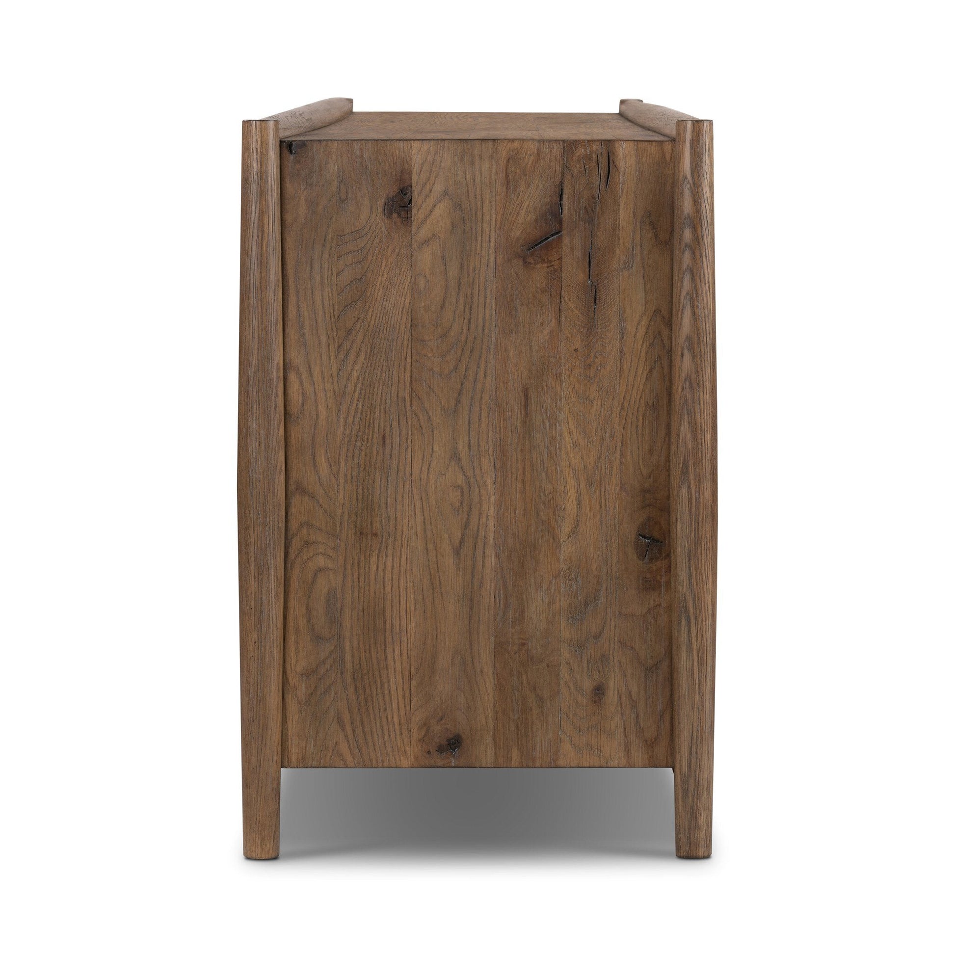 This dresser combines traditional spindle design with a modern touch. Crafted from weathered oak with a rustic finish, it features nine roomy drawers for ample bedroom storage. The simple hardware, finished in aged bronze, adds a touch of classic style.