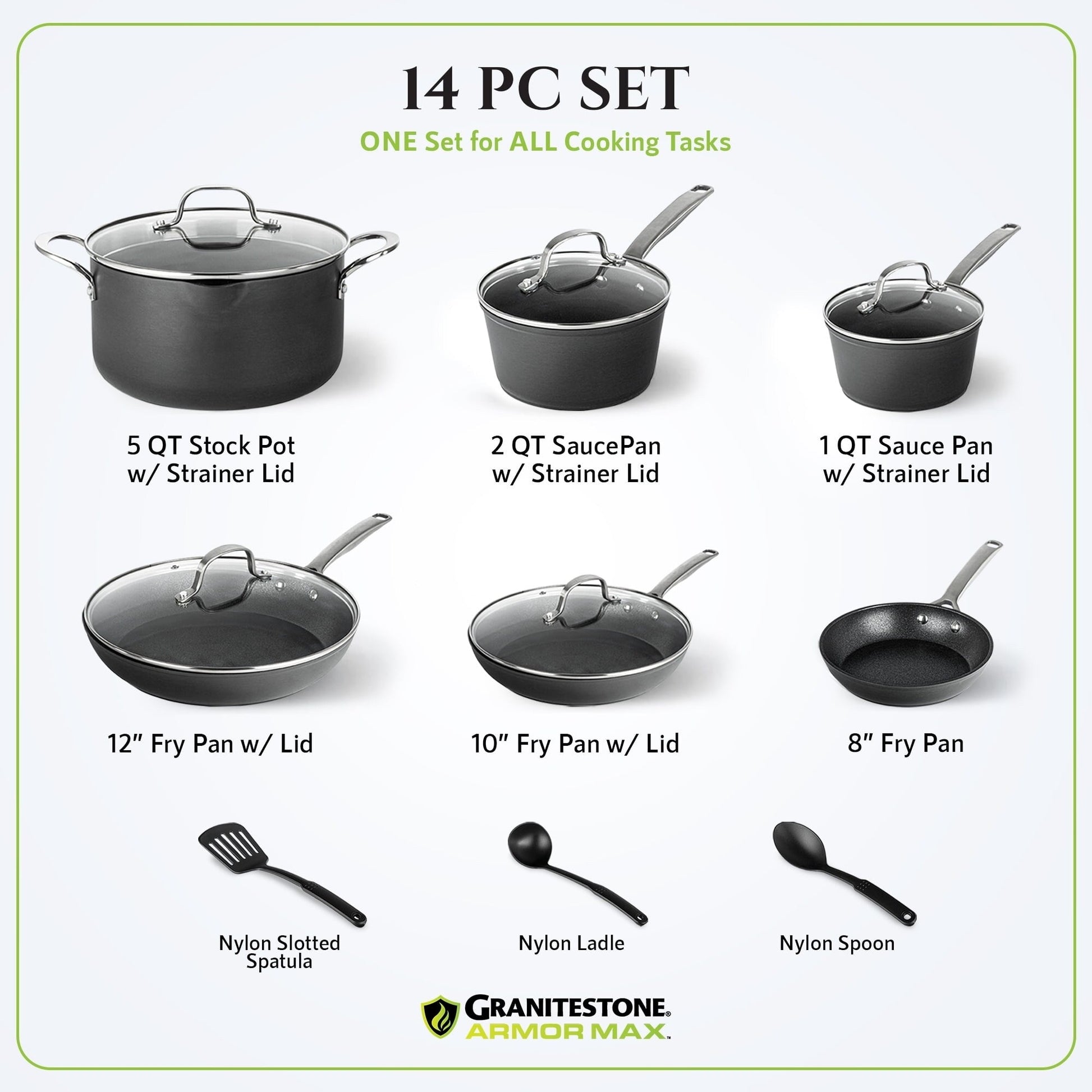 Introducing Granitestone Armor Max. The most durable cookware you will ever own. Tested and proven to be 800% Extra-Longer Lasting! The Armor Max Cookware is built from Forged Heavy Duty Hard Anodized Aluminum and features our exclusive Armor Max 4-Layer non-stick coating. This ensures you have the ultimate durability and that your food easily releases when cooking. The cookware is so easy to clean that you can skip the dishwasher with a quick wipe, or feel free to place in the dishwasher as it is 100% dishwasher safe. The cookware is built using forged heavy-duty hard anodized aluminum, which is known for its strength and longevity. The handles on the cookware are made riveted cast stainless steel and are designed to stay cool, even when the cookware is used on high heat. The Armor Max cookware set also comes equipped with pour and strain lids on the saucepans and stock pot, making it easy to strain and drain your favorite dishes without a colander! The full induction base allows for the cookware to be used on all cooktops, including induction. Armor Max is oven safe up to 500F, allowing you to bake your favorite dishes with ease. The Armor Max 14pc set has all the essential cookware pieces you'll need to create wonderful meals.