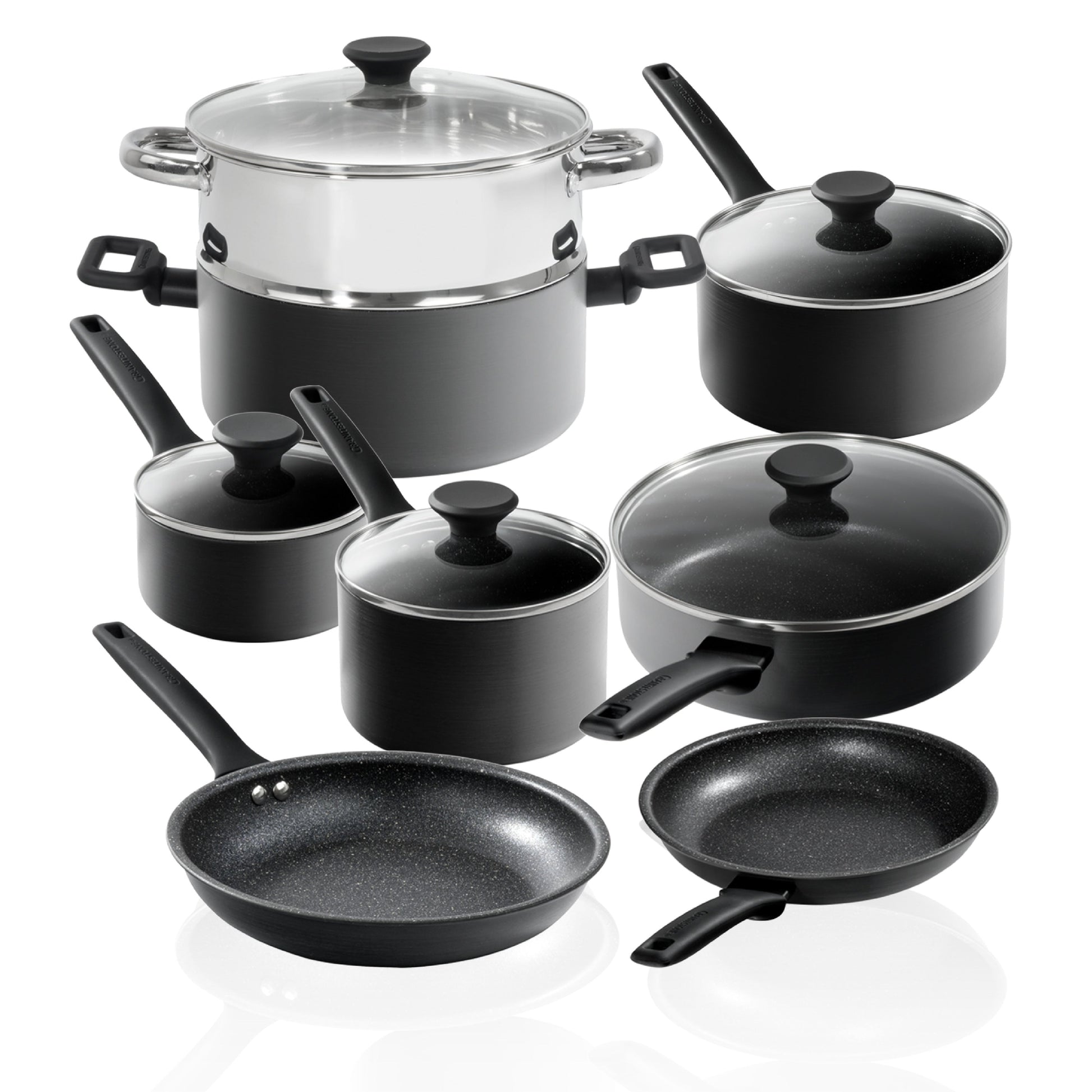 - Complete 13 Piece Set: Includes 8” skillet, 10.25” fry pan with lid, 1.5 qt, 2 qt, and 3 qt saucepans with lids, 3 qt sauté pan with lid, 5 qt stock pot with lid, and stainless steel steamer insert for a comprehensive kitchen solution.