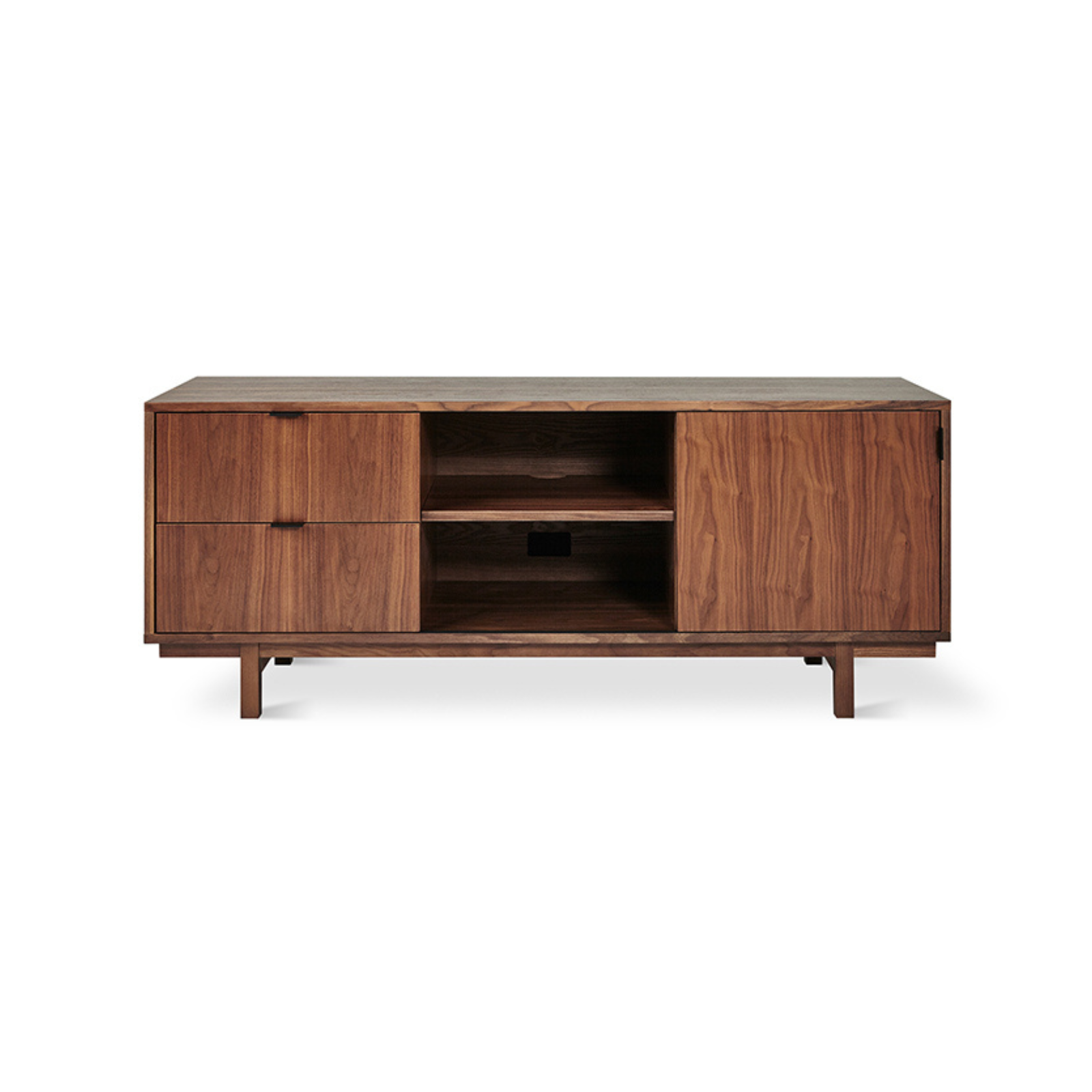 The Belmont Media Stand is an architecturally inspired storage design that features the natural beauty of walnut. Designed for Hi-Fi and media components, a back panel opening in the cabinet allows for concealed cable management. Drawers provide storage to keep your living room uncluttered, while adjustable shelves and a sliding front panel let you reveal or conceal components. The Media Stand is part of the Belmont Storage Series, matching perfectly with the Belmont Credenza and End table.