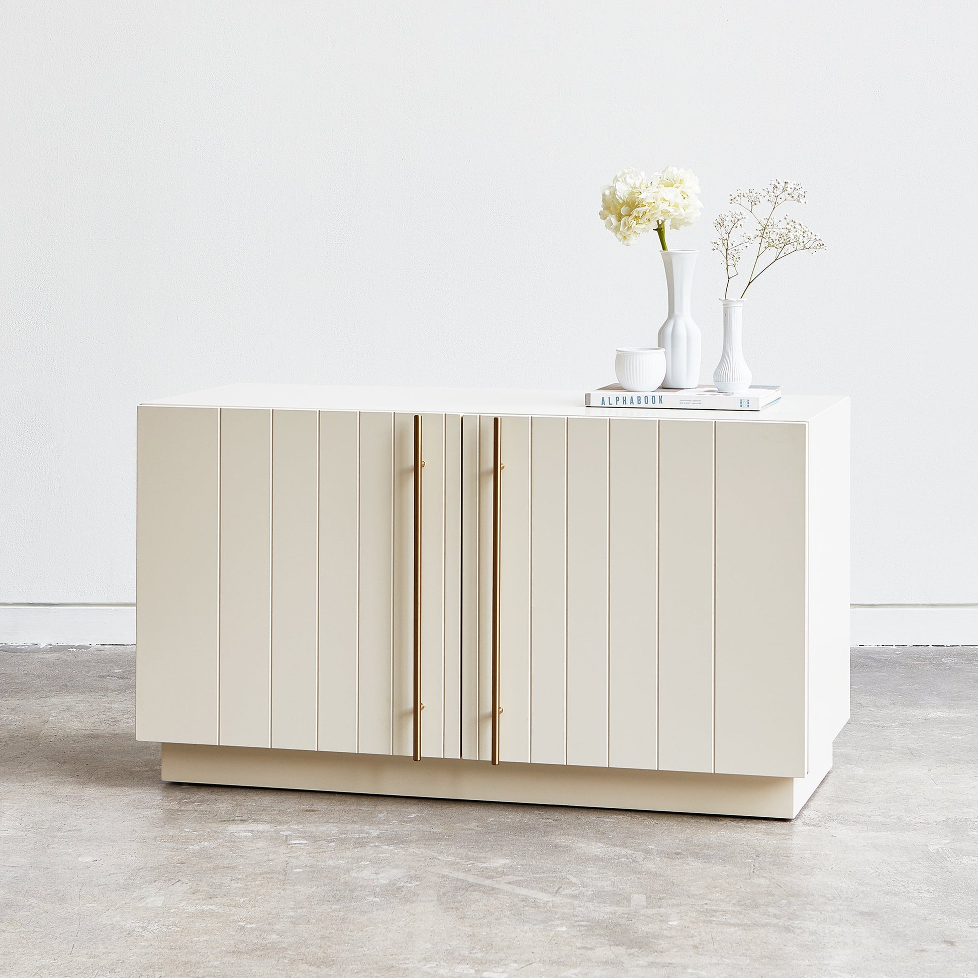 The Elora Cabinet combines the traditional aesthetic of classic bead board cabinets with solid craftsmanship and muted, contemporary hues to create a distinctly modern design. Featuring a smooth satin finish, delicate brass-plated handles, and precision-cut doors on an elevated platform, the Elora Cabinet provides ample storage within a minimalist, contemporary form. Part of the Elora Storage Series, this Cabinet matches perfectly with the End Table and Media Stand.