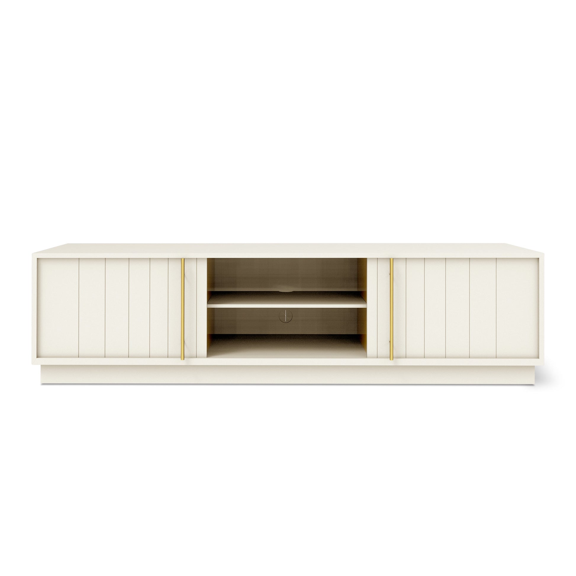 The Elora Media Stand combines the traditional aesthetic of classic beadboard cabinets with solid craftsmanship and muted, contemporary hues to create a distinctly modern design. Featuring a smooth satin finish, delicate brass-plated handles, and precision-cut doors on an elevated platform, the Elora Media Stand provides ample storage within a minimalist, contemporary form. Designed for Hi-Fi and media components, a back panel opening allows for concealed cable management.