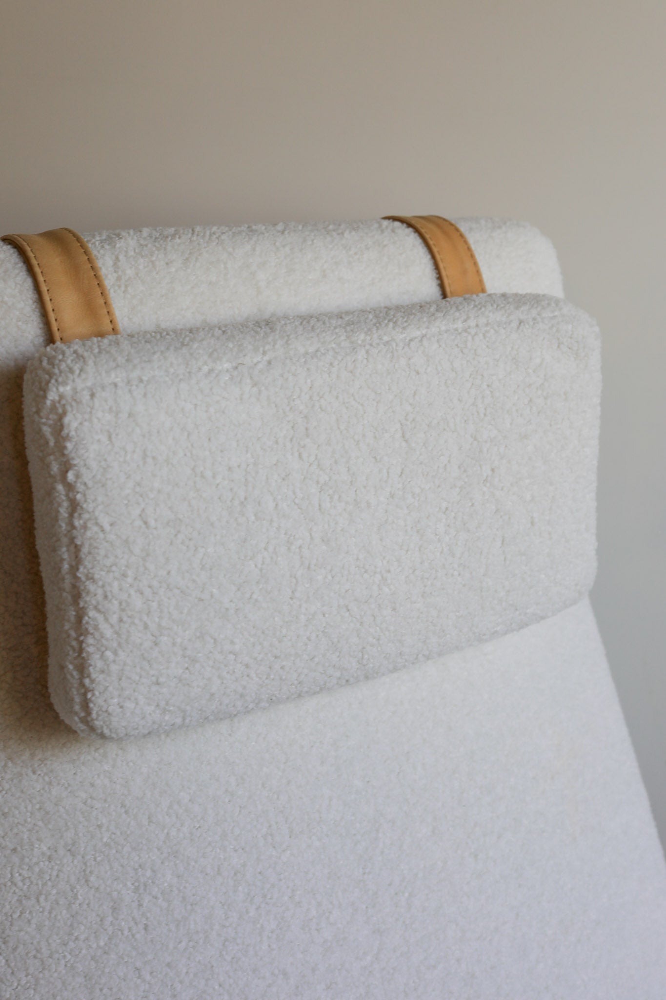 A rugged, eco‐friendly take on modernism, the Labrador is a unique accent chair that invokes calm and lightness, with elements reduced to their essential forms. Its Scandinavian‐inspired look is achieved using natural materials like solid ash and hand‐stitched leather. Wood is FSC®‐ Certified to support responsible forest management, and faux‐wool coverings are made from 100% recycled plastic bottles, diverted from landfills and waterways, then repurposed into a plush upholstery material. The headrest can be adjusted using a clever leather and wood counterweight to achieve optimal lounging position. An optional, matching footrest is available.