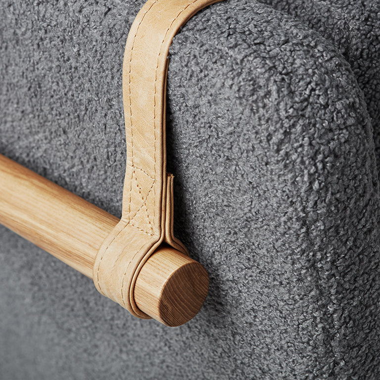 A rugged, eco‐friendly take on modernism, the Labrador is a unique design that invokes calm and lightness, with elements reduced to their essential forms. Its Scandinavian‐inspired look is achieved using natural materials like solid ash and hand‐stitched leather. Wood is FSC®‐ Certified to support responsible forest management, and faux‐wool coverings are made from 100% recycled plastic bottles, diverted from landfills and waterways, then repurposed into a plush upholstery material. The headrest can be adjusted using a clever leather and wood counterweight to achieve optimal lounging position, enhanced even further by a matching footrest.