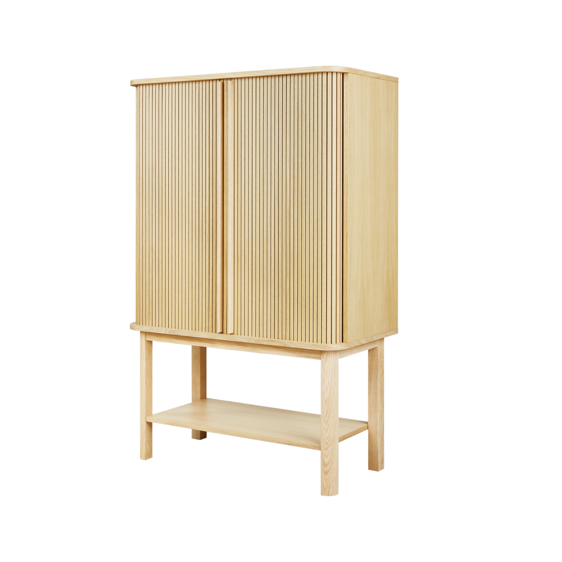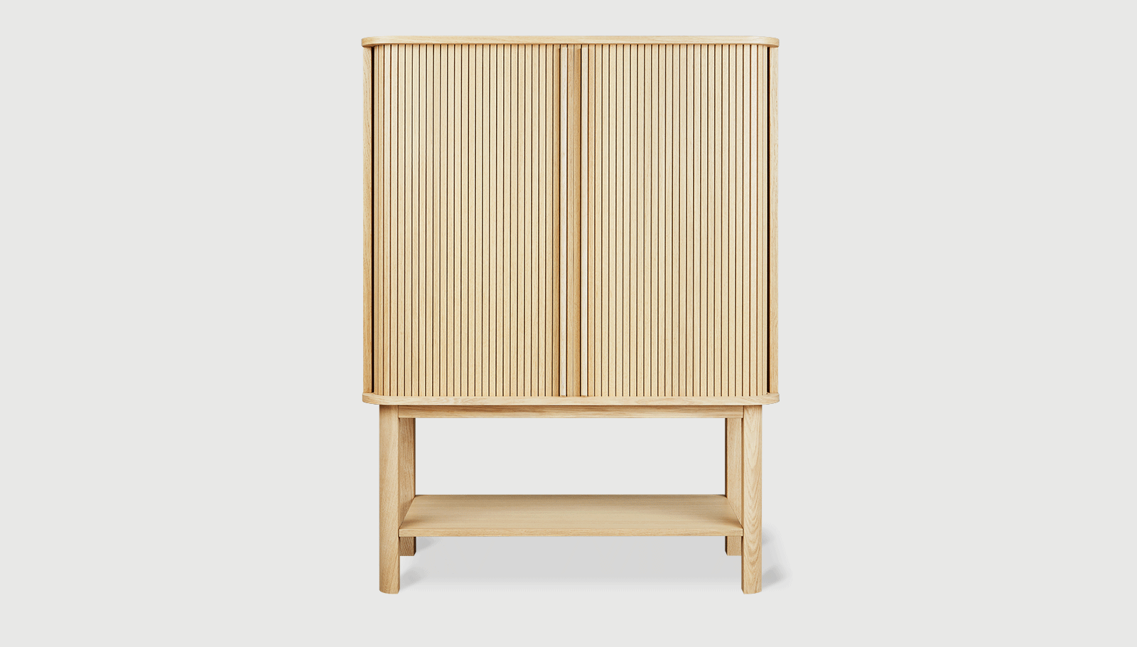 Stylishly reveal or conceal with Ledger, a contemporary storage design that showcases gorgeous tambour wood sliding doors, elegant proportions and skilled craftsmanship. Whether you’re looking for a clever solution to conceal clutter or an attractive way to display objects and collectibles, Ledger provides the answer. The tambour doors, which open smoothly into the back of the cabinet, prove that beautiful form follows function, displaying a simplicity of design engineering without the use of hardware and fasteners. Components incorporate graceful curve details and warm woodgrain protected with an all-natural, zero VOC finish. Solid and engineered wood throughout is FSC ®-Certified, ensuring material is sourced from well managed forests to support a healthy environment.