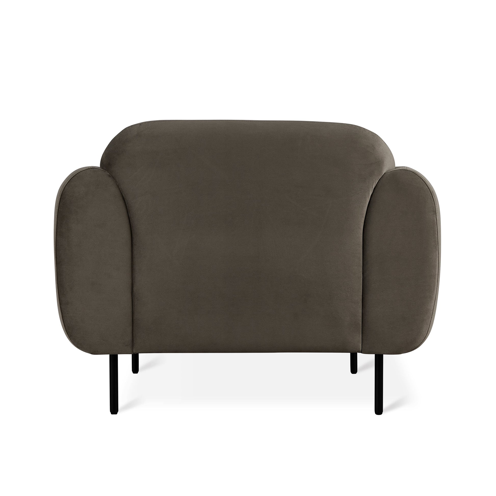 Envelop yourself in mod luxury with the plush and sophisticated Nord Chair. With an elegant, curved silhouette, the Nord Chair invites you to sink in and stay awhile, with a retro yet timeless shape that’s emphasized by an ample, low profile back and feminine curved arms. Each piece has been expertly crafted in lush fabric, with a tight seat and back atop black steel legs that add a modern touch to the piece’s striking ‘70s-inspired sensibilities.