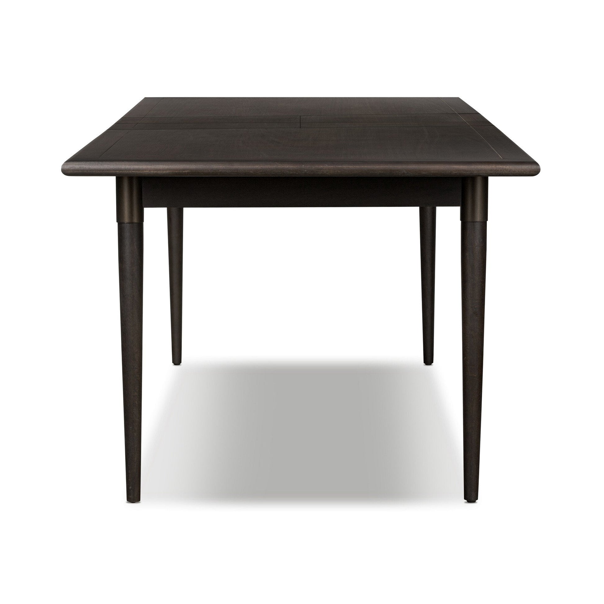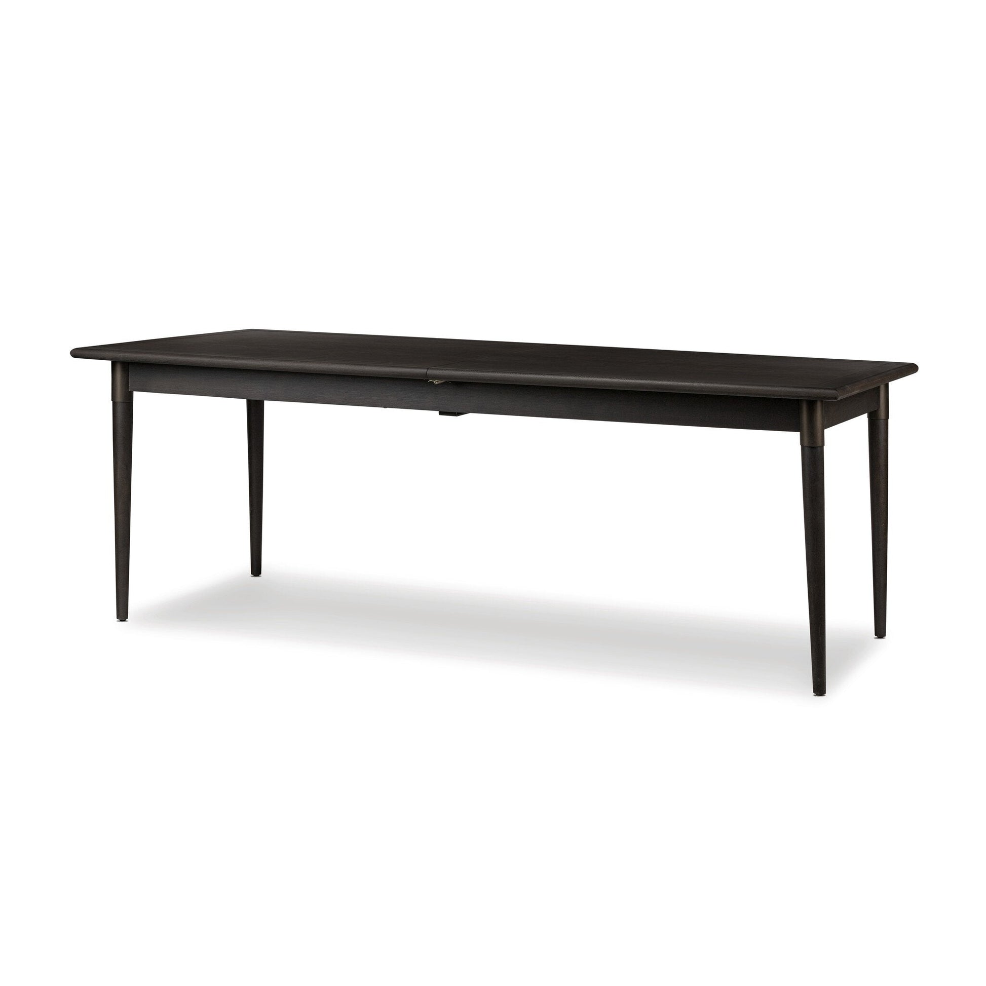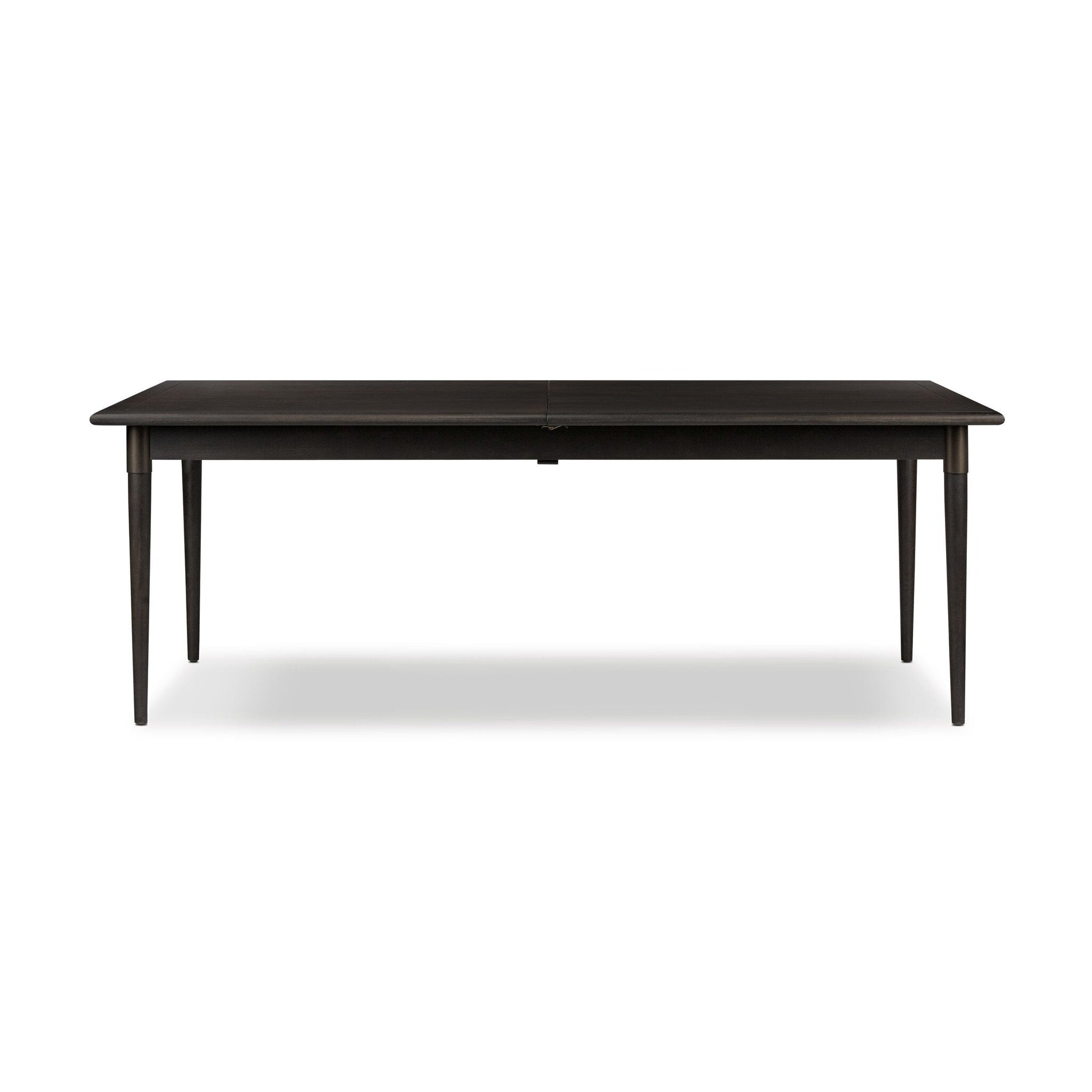 Style with flexibility. Finished in a classic black, a rectangular tabletop of mango veneer, solid mango legs and iron detailing speak to Scandinavian modernism. Expansion from 84' to 104' means more space when company calls.