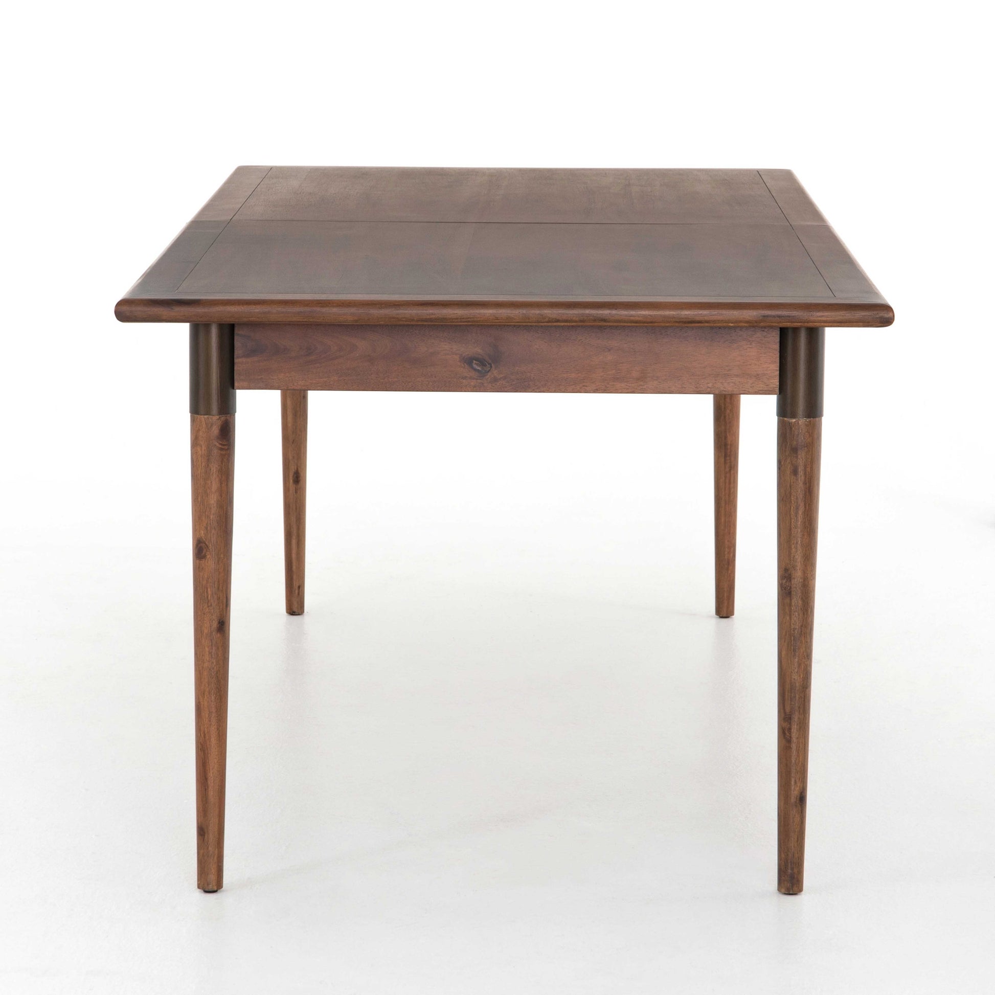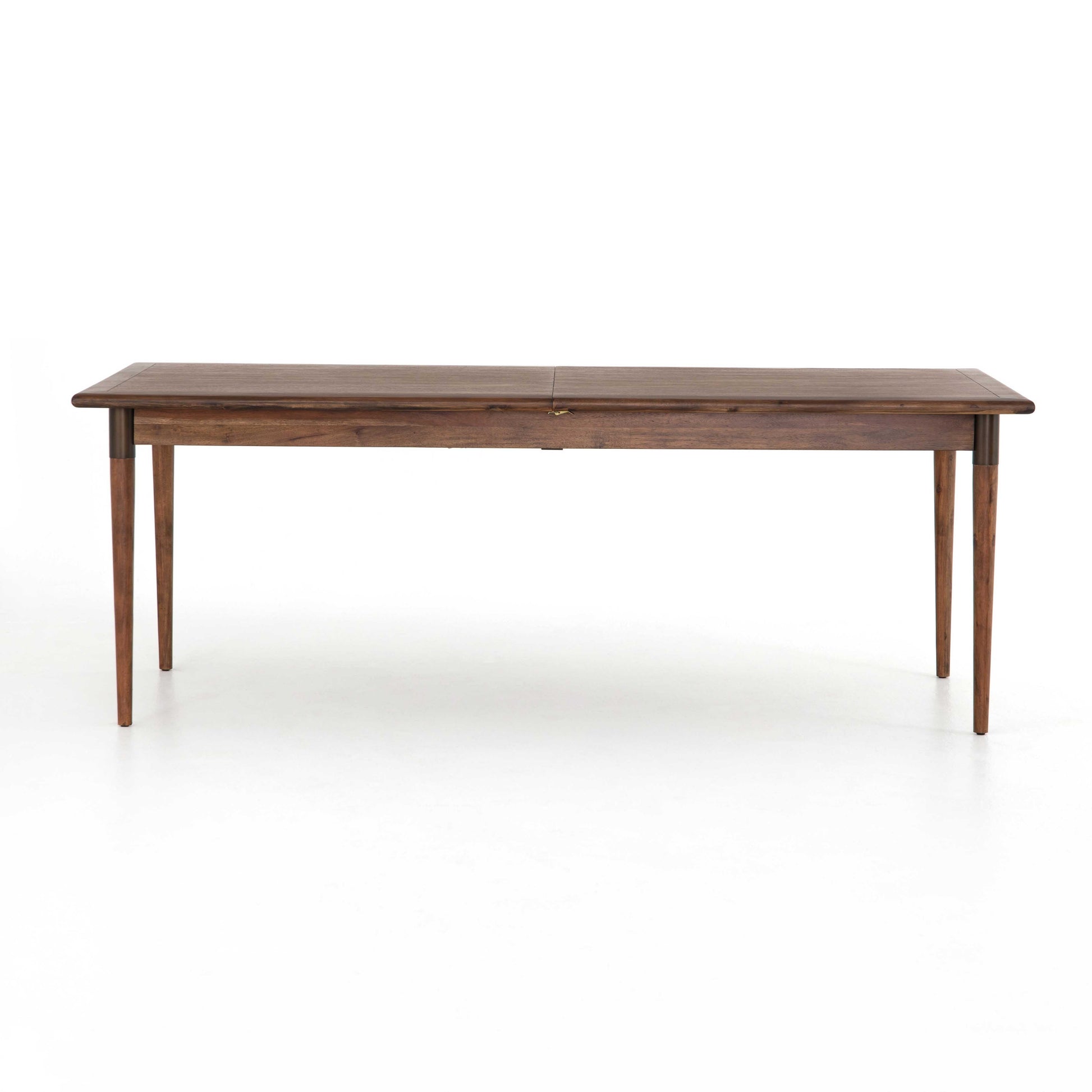 Modern and stylish with ultimate flexibility. This dining table has a warm toasted walnut finis, a rectangular acacia tabletop, cone-tapered legs and iron detailing. Expansion from 84' to 104' means more space for whenever you need.