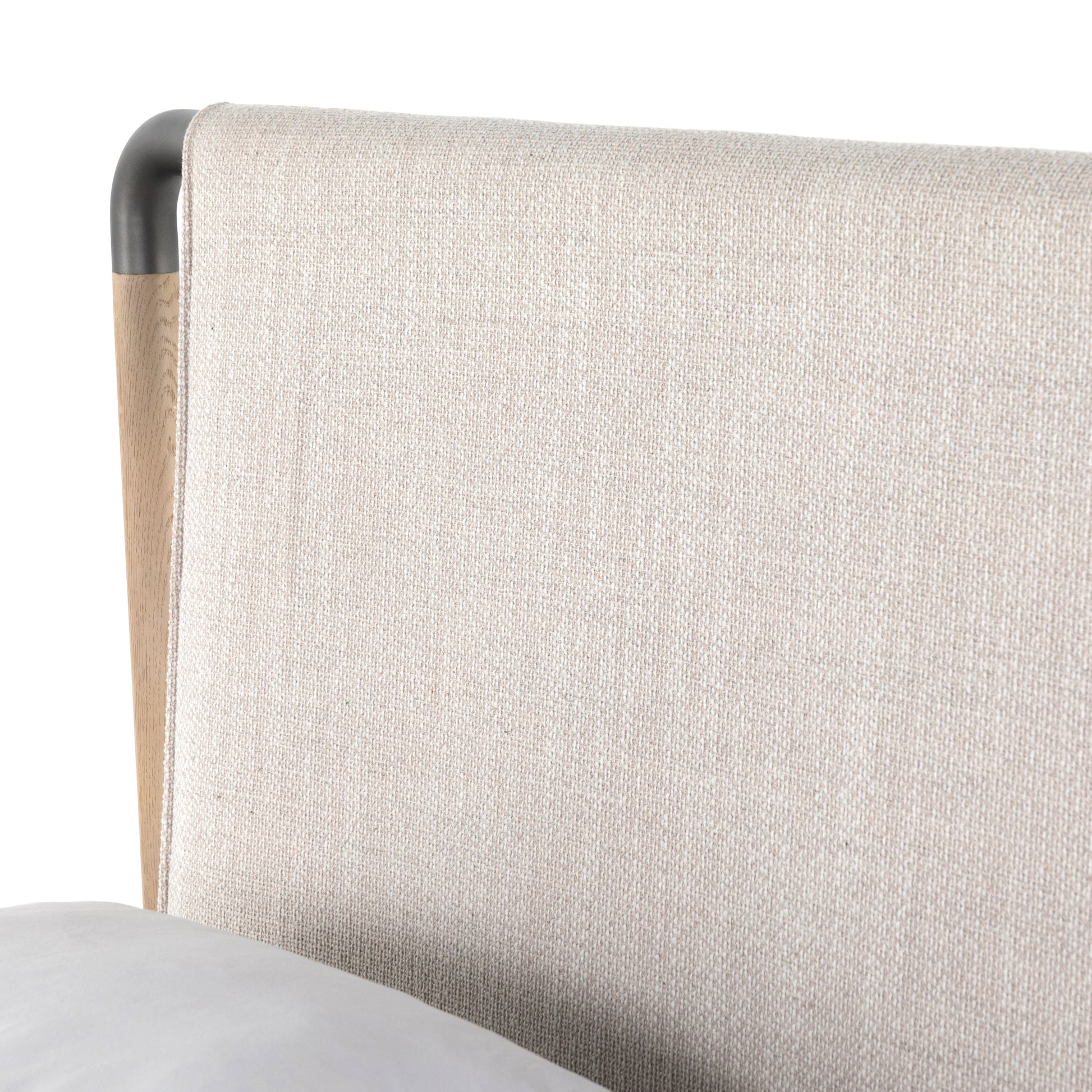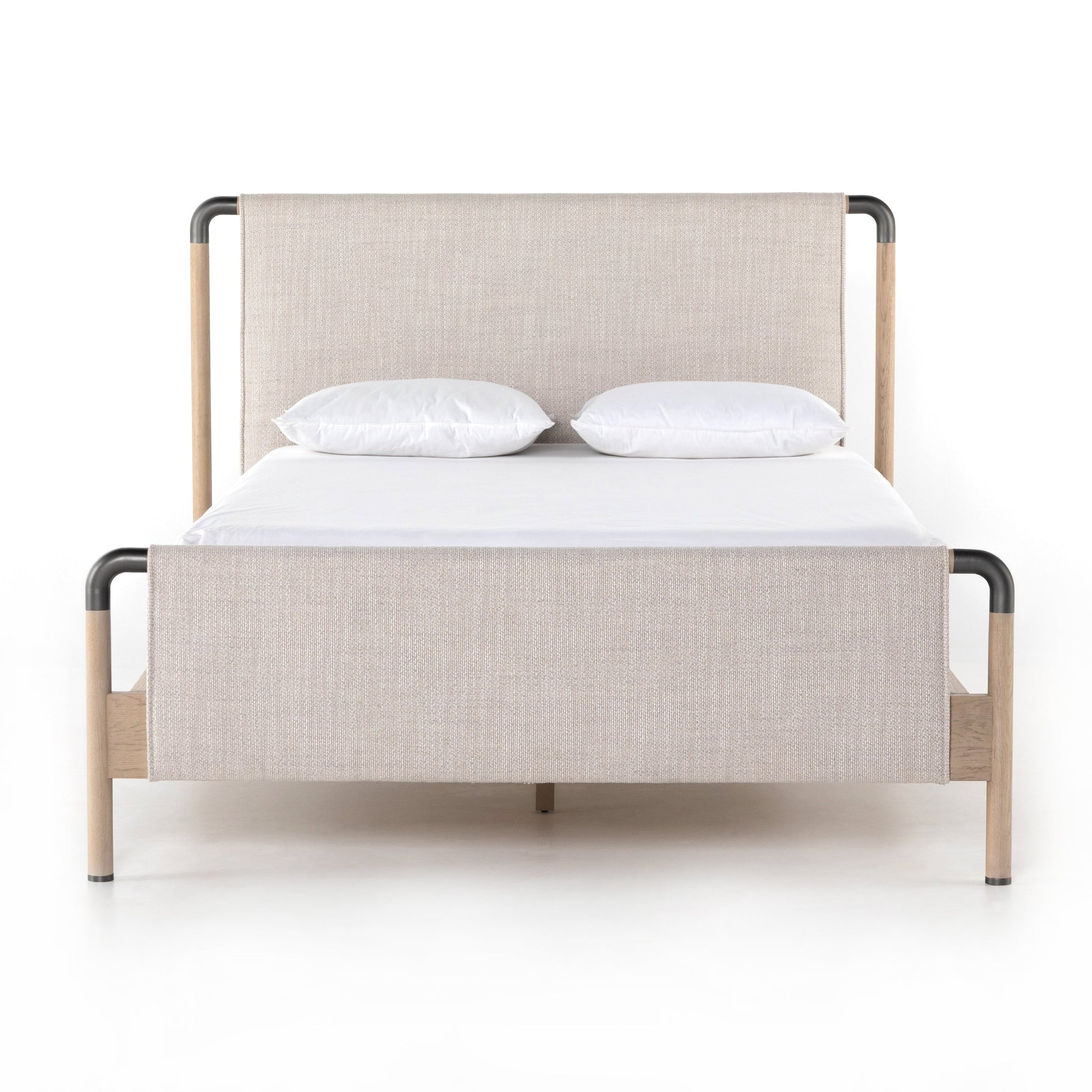 Mixed materials make the bed. Framed by solid oak with rounded iron corners, an upholstered, sling-style headboard brings a light, modern vibe to the bedroom.