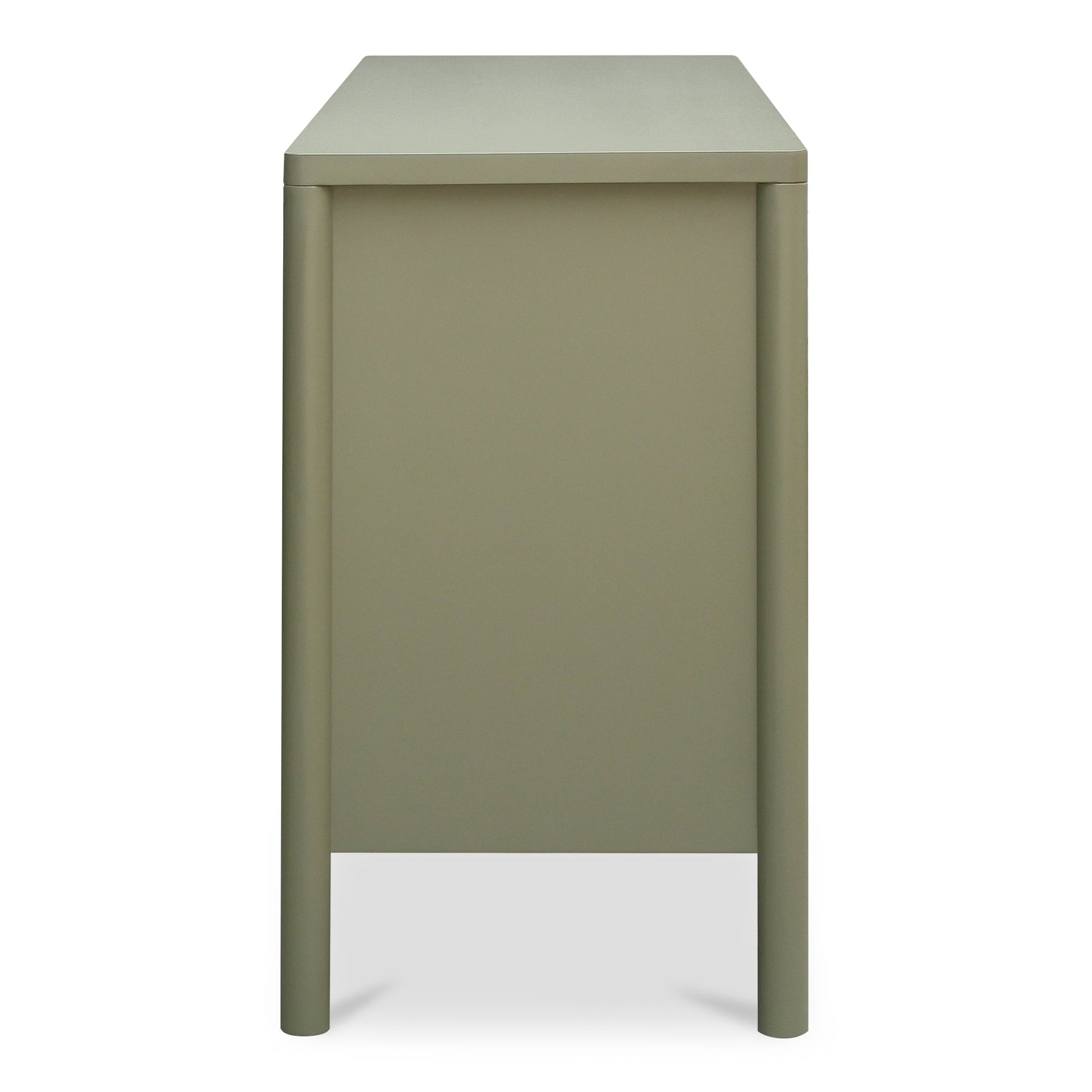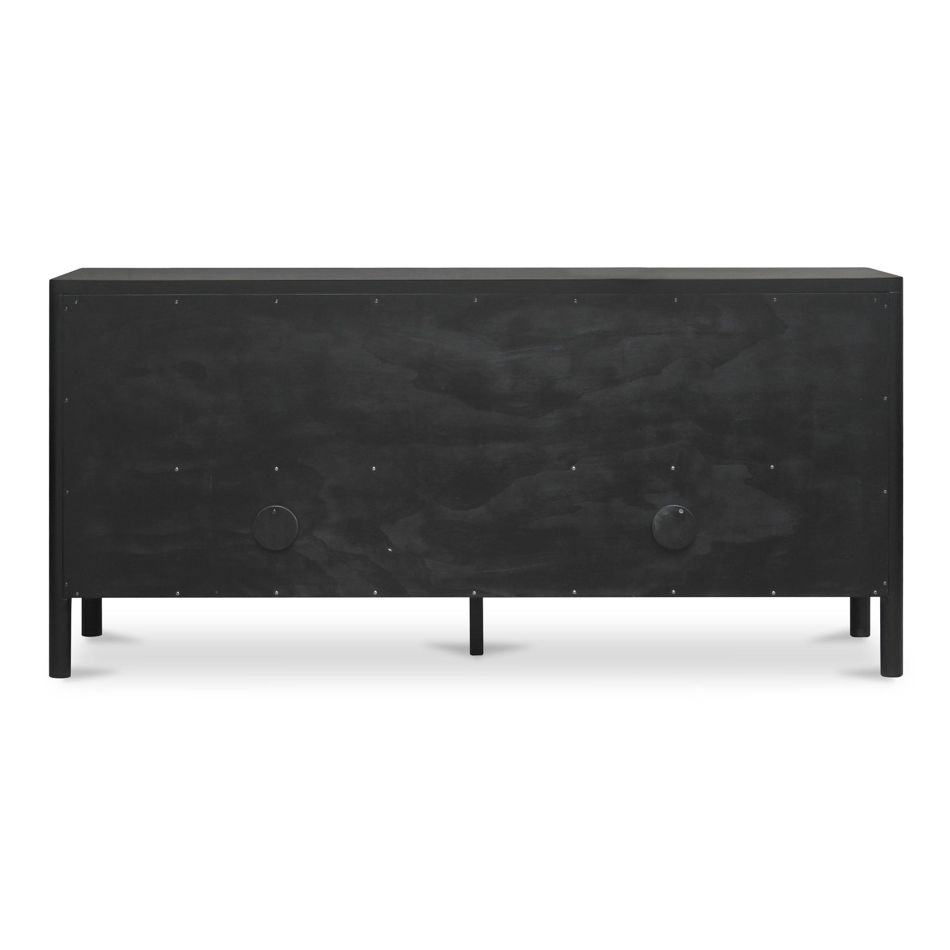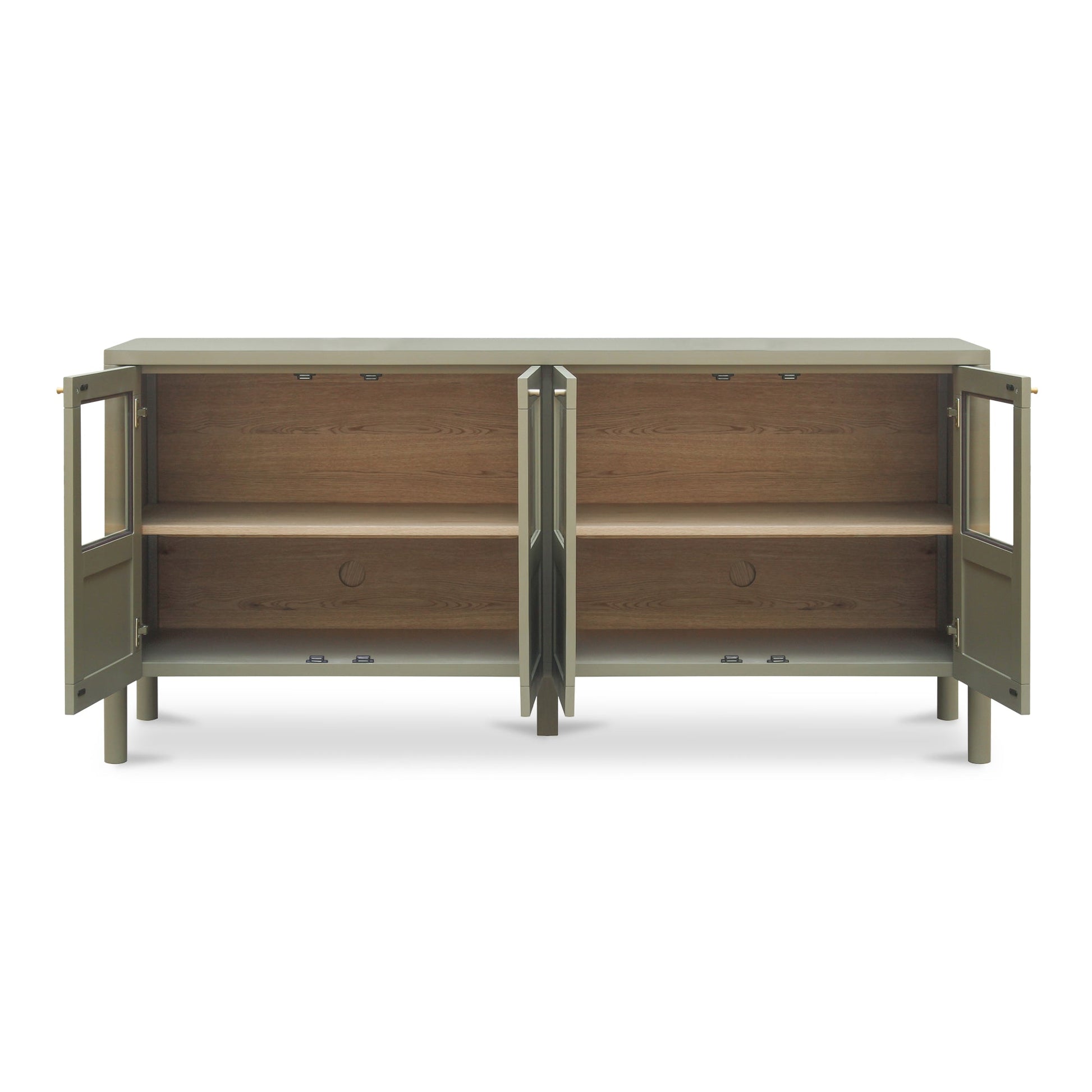Drawing inspiration from traditional cabinetry, the Holden sideboard skillfully merges transparency and concealment with a deliberate mix of glass and solid panels. Its construction incorporates a solid pine frame complemented by oak veneer details, supported by slender dowel legs and accented with understated bronze hardware.