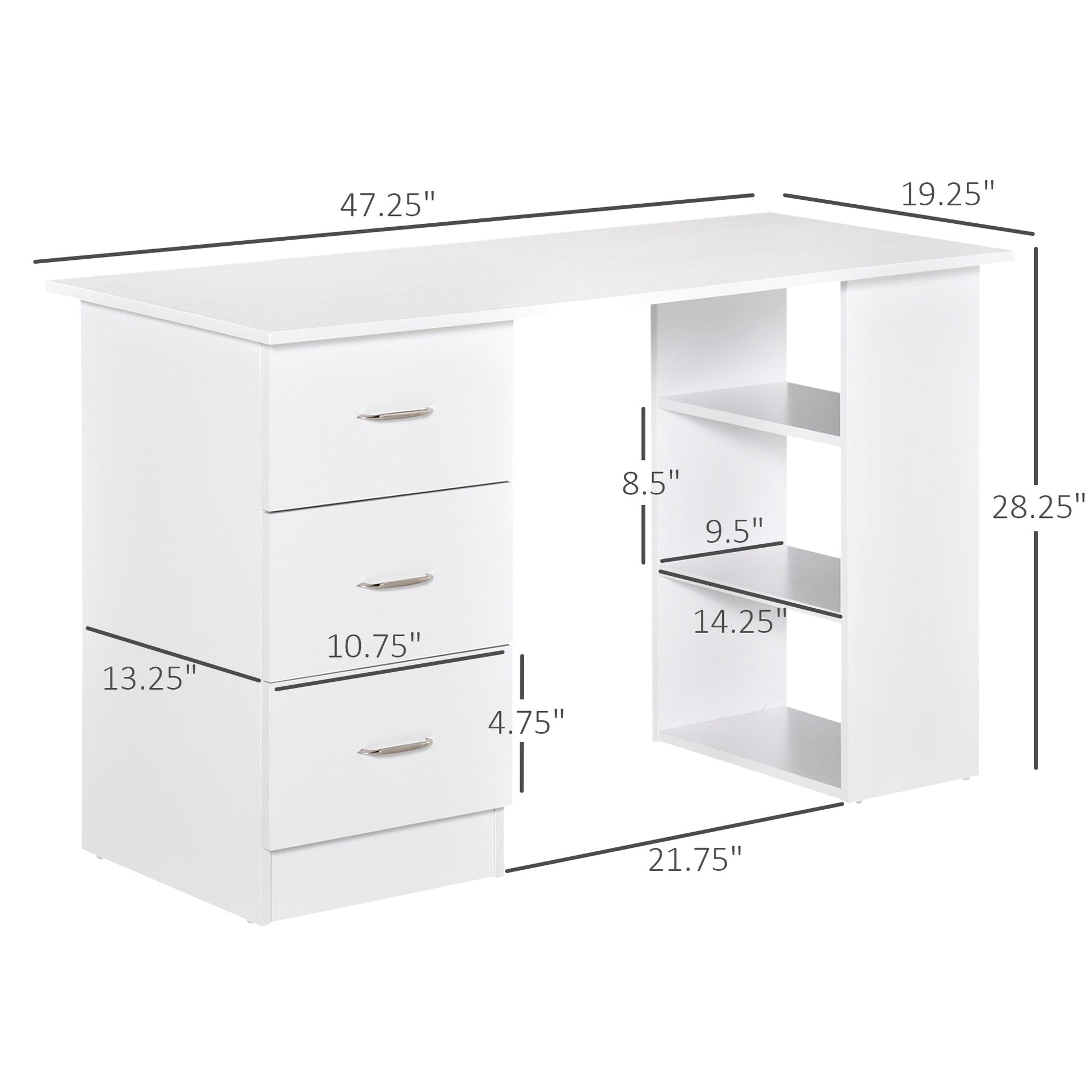 HOMCOM provides modern and quality furniture for your home or office, with most popular current trends tailored to your needs. This white desk with drawers provides spacious room for holding computers and monitors, as well as for keeping office supplies within reach 3 drawers and 3 open shelves for storing and displaying items. Its simple, minimalist design makes it easy to pair with other components to build out a contemporary office set to fit your space.