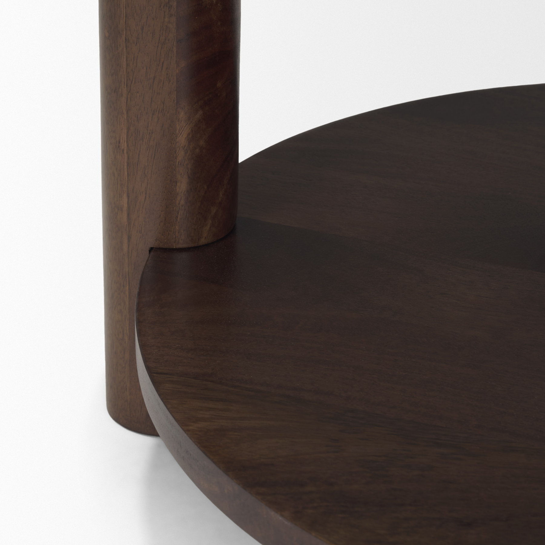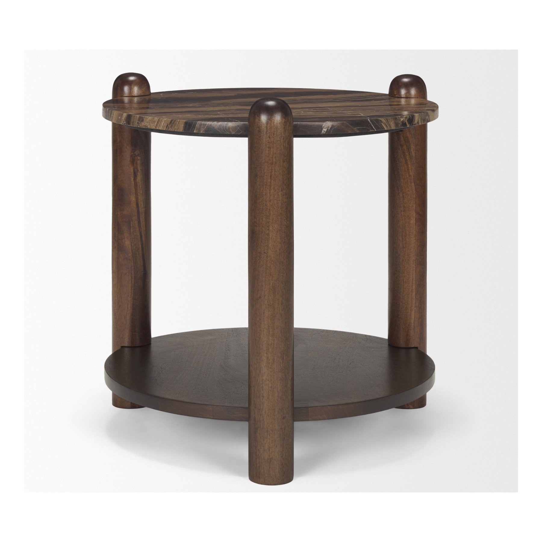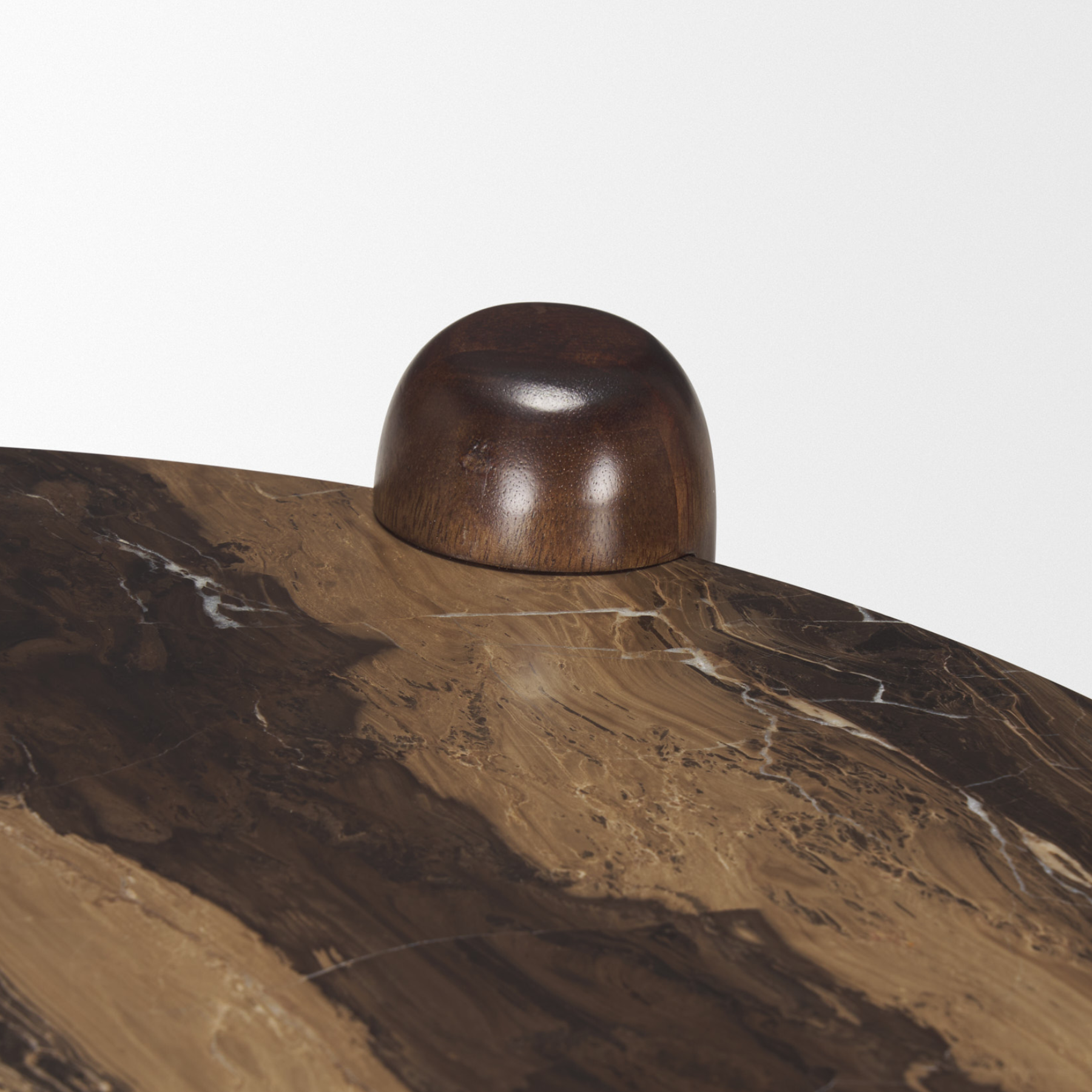 The Jeffrey Side Table combines rich, dark brown wood with a polished finish and rounded pillar legs for a timeless silhouette. Its round 'cappuccino' marble tabletop presents a striking contrast, blending deep espresso browns with creamy latte swirls. This expert-crafted piece offers both durable construction and refined aesthetic, making it a versatile addition that enhances any living space with sophisticated warmth.