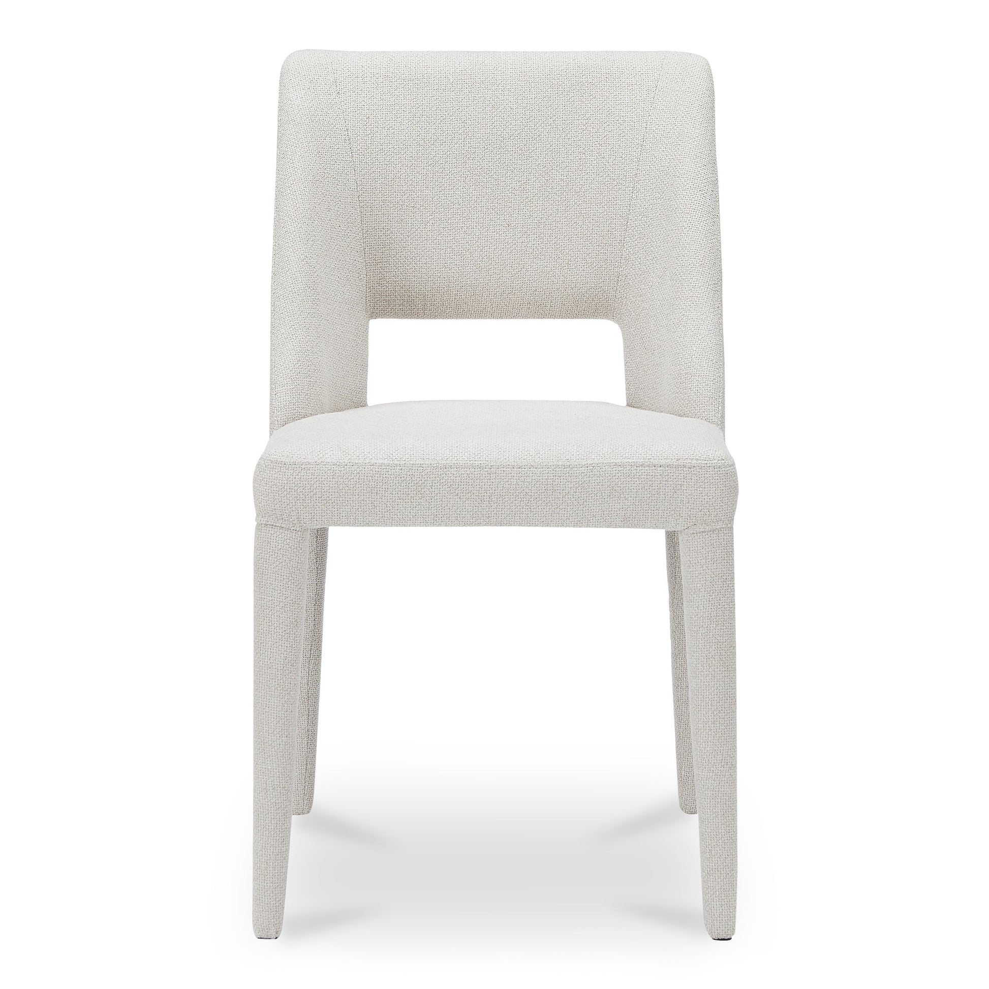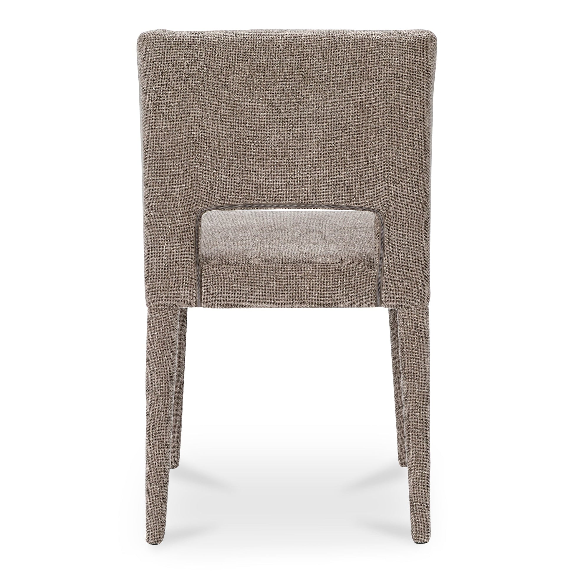 The Jetty dining chair features a fully upholstered design that smoothly transitions from seat to base, encasing a durable iron frame in easy-care performance fabric. A carefully carved lower backrest creates a sense of visual lightness, while the extended sides provide subtle arm support.