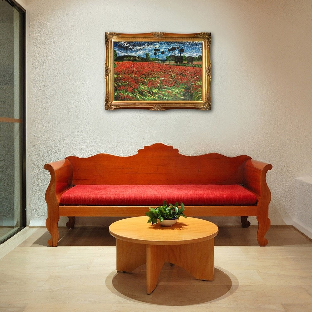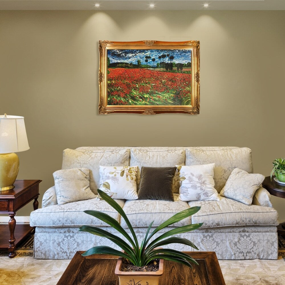 Hand painted oil reproduction of one of the most famous Van Gogh paintings, Field of Poppies. The original masterpiece was created in 1889. Today it has been carefully recreated detail-by-detail, color-by-color to near perfection. Why settle for a print when you can add sophistication to your rooms with a beautiful fine gallery reproduction oil painting? Vincent Van Gogh's restless spirit and depressive mental state fired his artistic work with great joy and, sadly, equally great despair. Known as a prolific Post-Impressionist, he produced many paintings that were heavily biographical. This work of art has the same emotions and beauty as the original by Van Gogh. Why not grace your home with this reproduced masterpiece? It is sure to bring many admirers! Frame Description: Victorian Gold Frame - Gold Finish. Painting arrives ready to hang and with a Certificate of Authenticity.