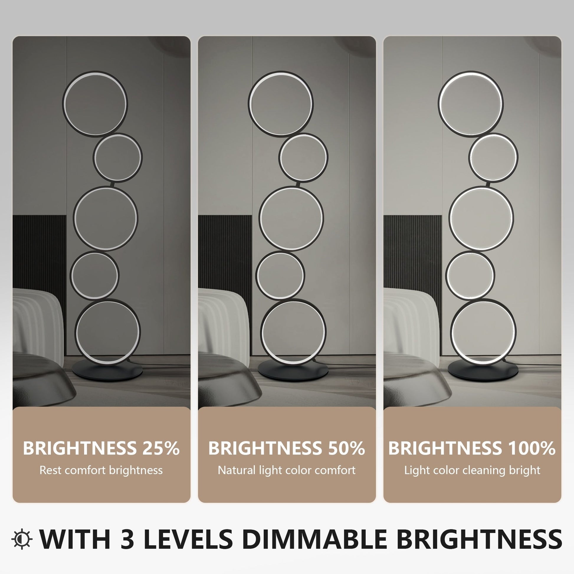 Utilize the 5 rings tall standing lamp in any location to brighten dark corners with daylight white 6,000 K light. It features high brightness of 3260 lumens and a diffused feature to avoid blinding the eyes. Tap the built-in foot switch to dim or brighten the lights. From full strength, one tap dims to 50%, a second to 25%, and a third turns the tall lamp off.